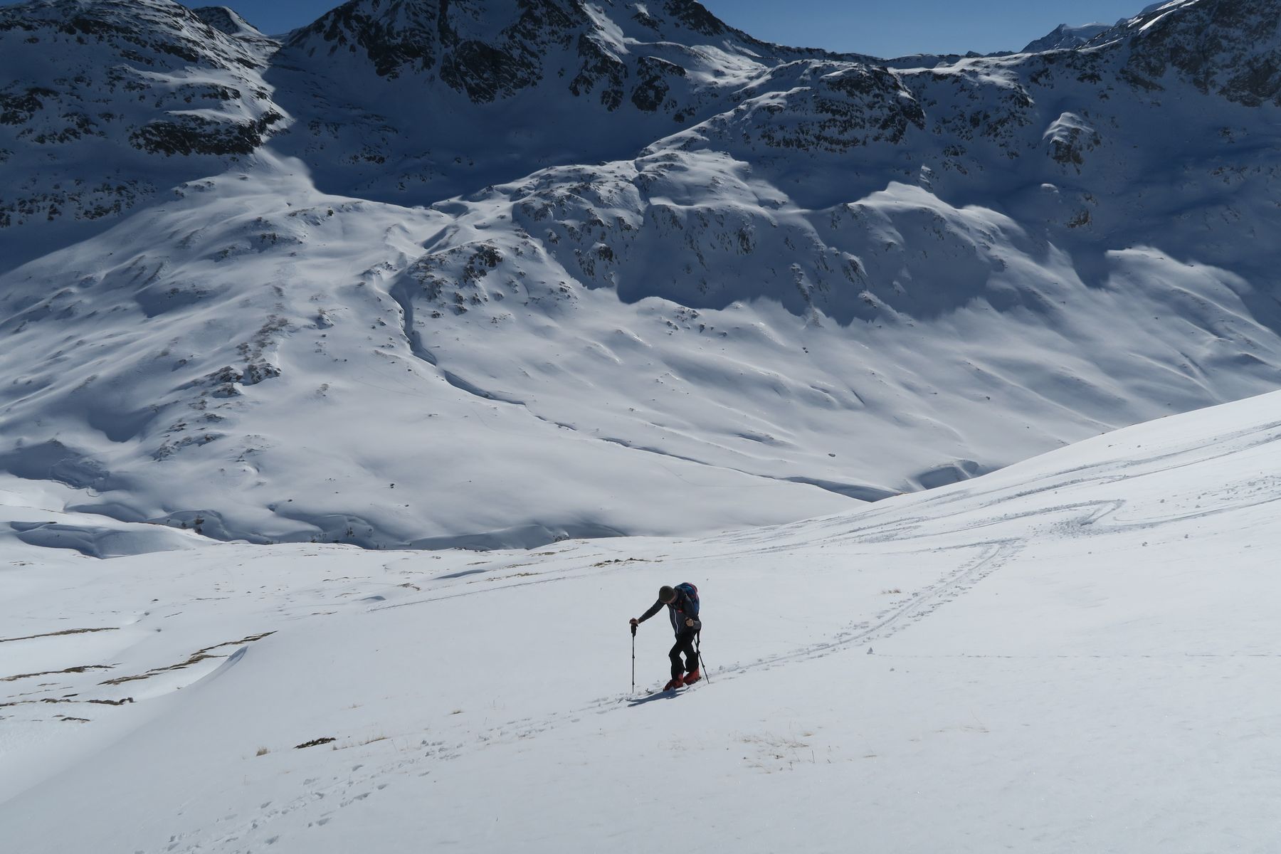Im Oberengadin hat es einen kritischen 3er, ab Pontresina einen 2er. Daher eine Tour vom Berninapass, wo der Schnee Richtung Süden immer weniger wird und der Wind ganz Arbeit gleistet hat.