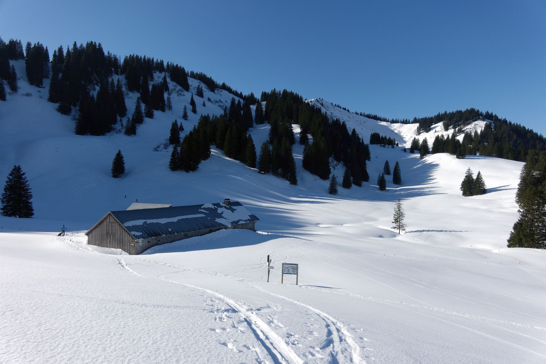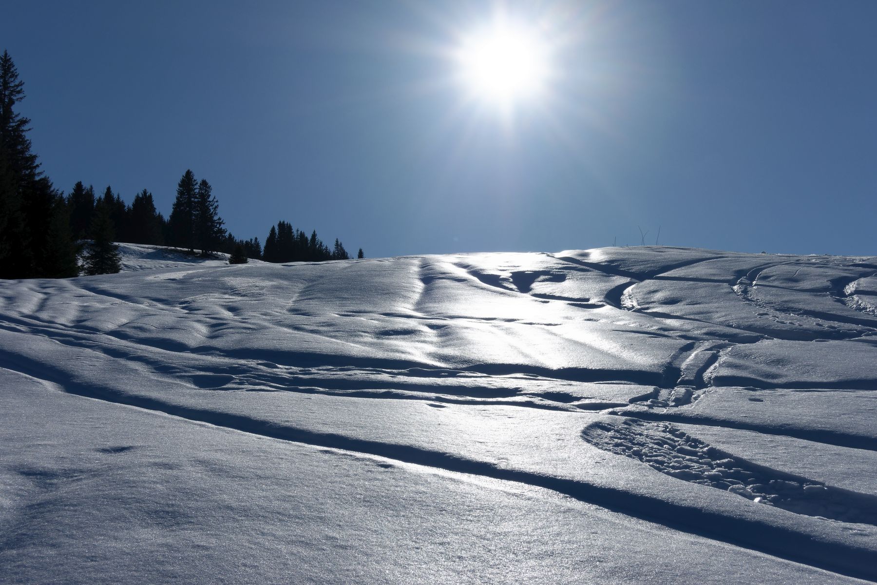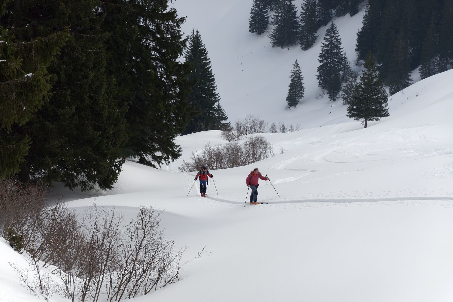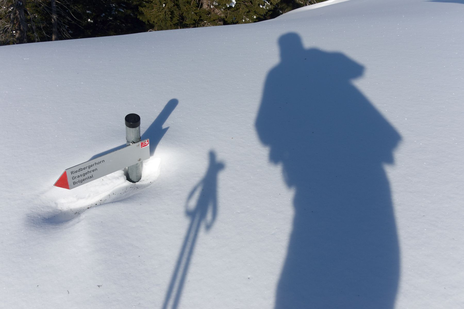 Aufstieg zum Großen Ochsenkopf problemlos. Abfahrt zurück zum Oberälpele noch recht brauchbar. Nur kurz vor der Alpe unmittelbarer Übergang von Pulver zu Bruchharsch.