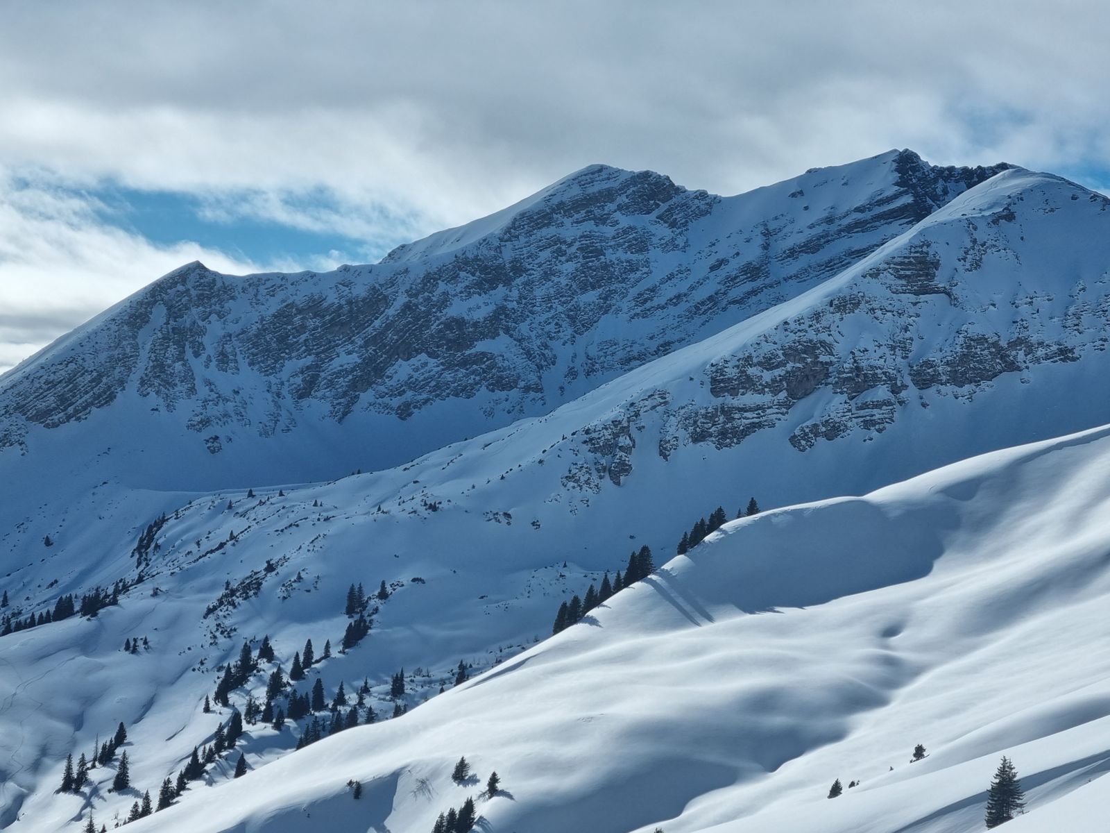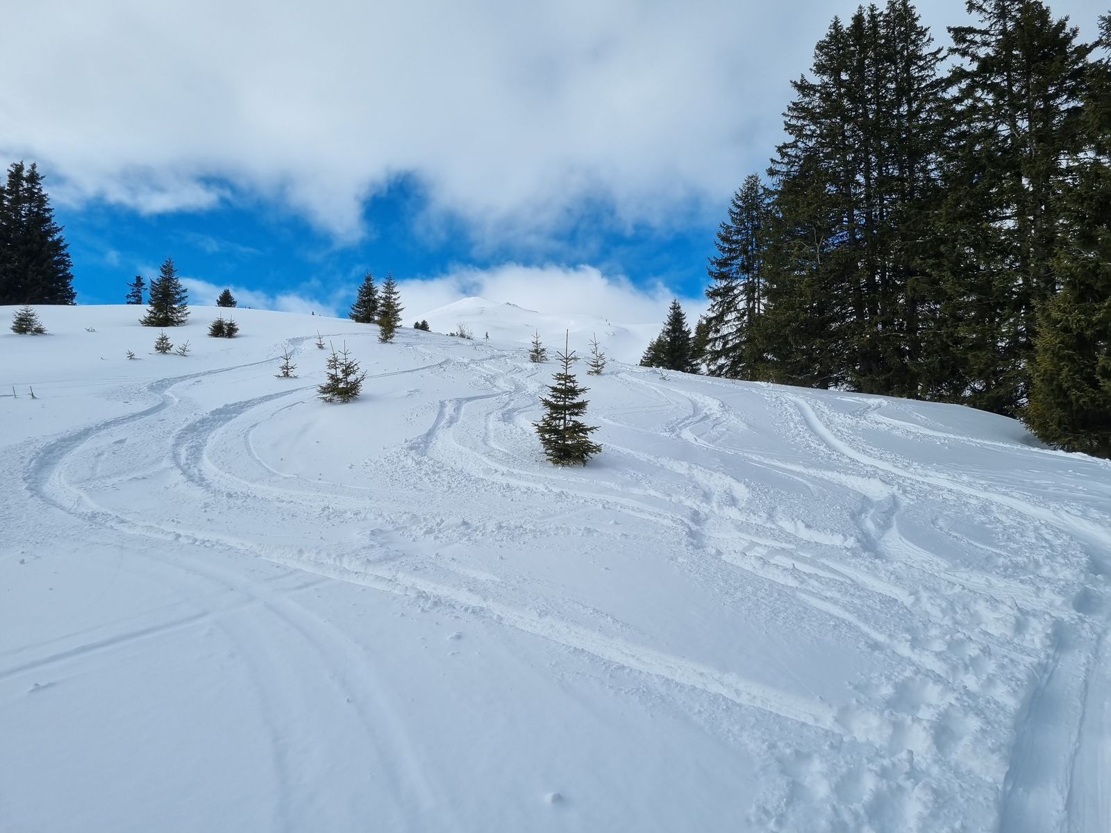 Die frühmorgendliche Abfahrt vom Parkplatz neben dem Schlepplift in Rinnen über die Wiesen zum Rotlech macht Lust auf mehr: 20 cm flauschiger Pulver mit guter Unterlage. Und es geht auch gut weiter: der Wald ist dick verschneit, gute Aufstiegsspur und nur wenige Abfahrtsspuren am Morgen, alles Pulver.