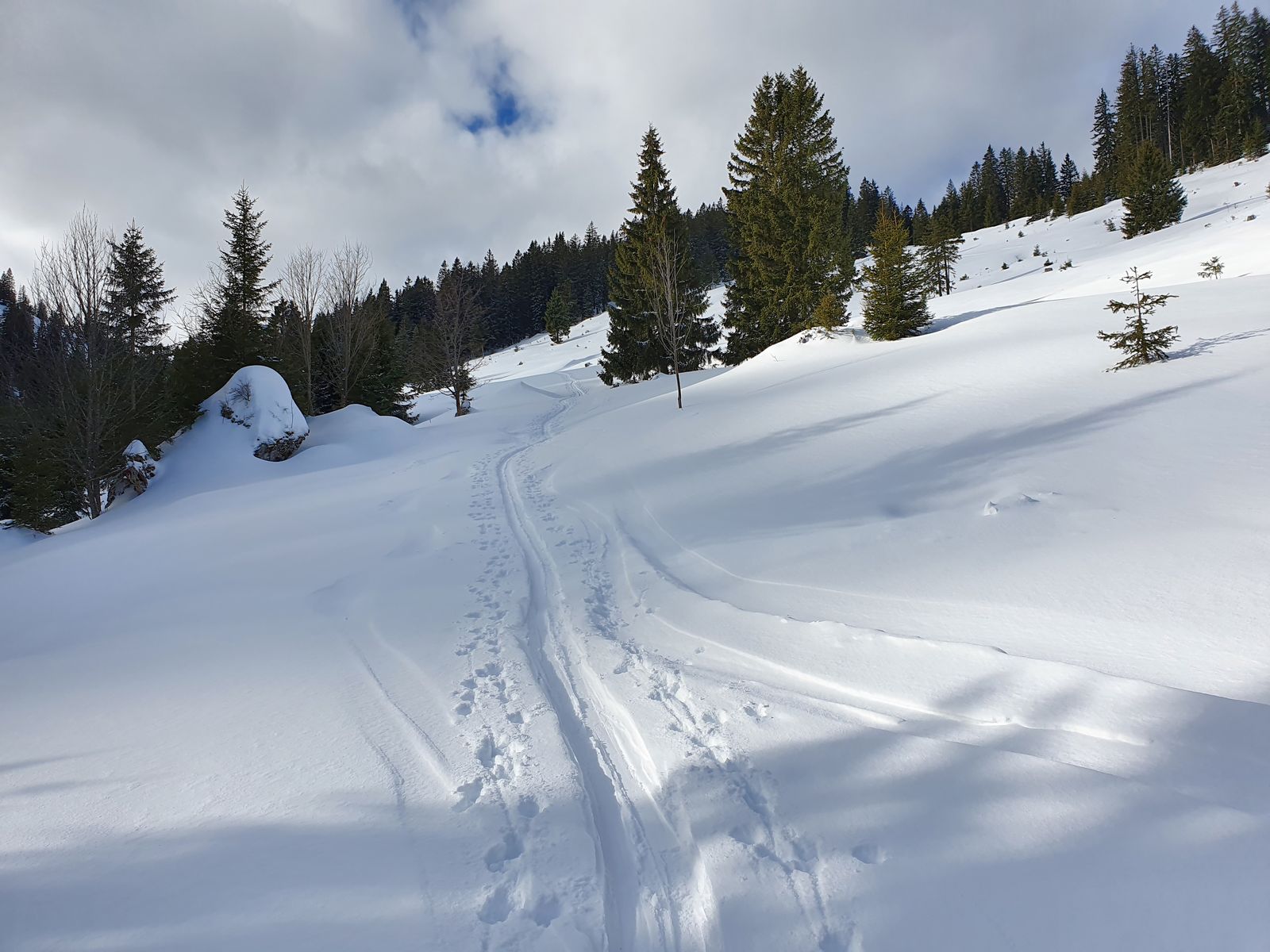 Route: ab PP über Übungshänge und links von Rodelbahn die wenig frequentierte Skipiste hoch. Die war heute gewalzt bis kurz nach einer Abzweigung zum obersten Lift, danach mit leichter Pulverauflage. Weiter über Forstweg erst bergauf, dann flach und über Brücke zur Rodelbahn. Auf dem Flachstück stark verblasen im Wald, aber genug Schnee.