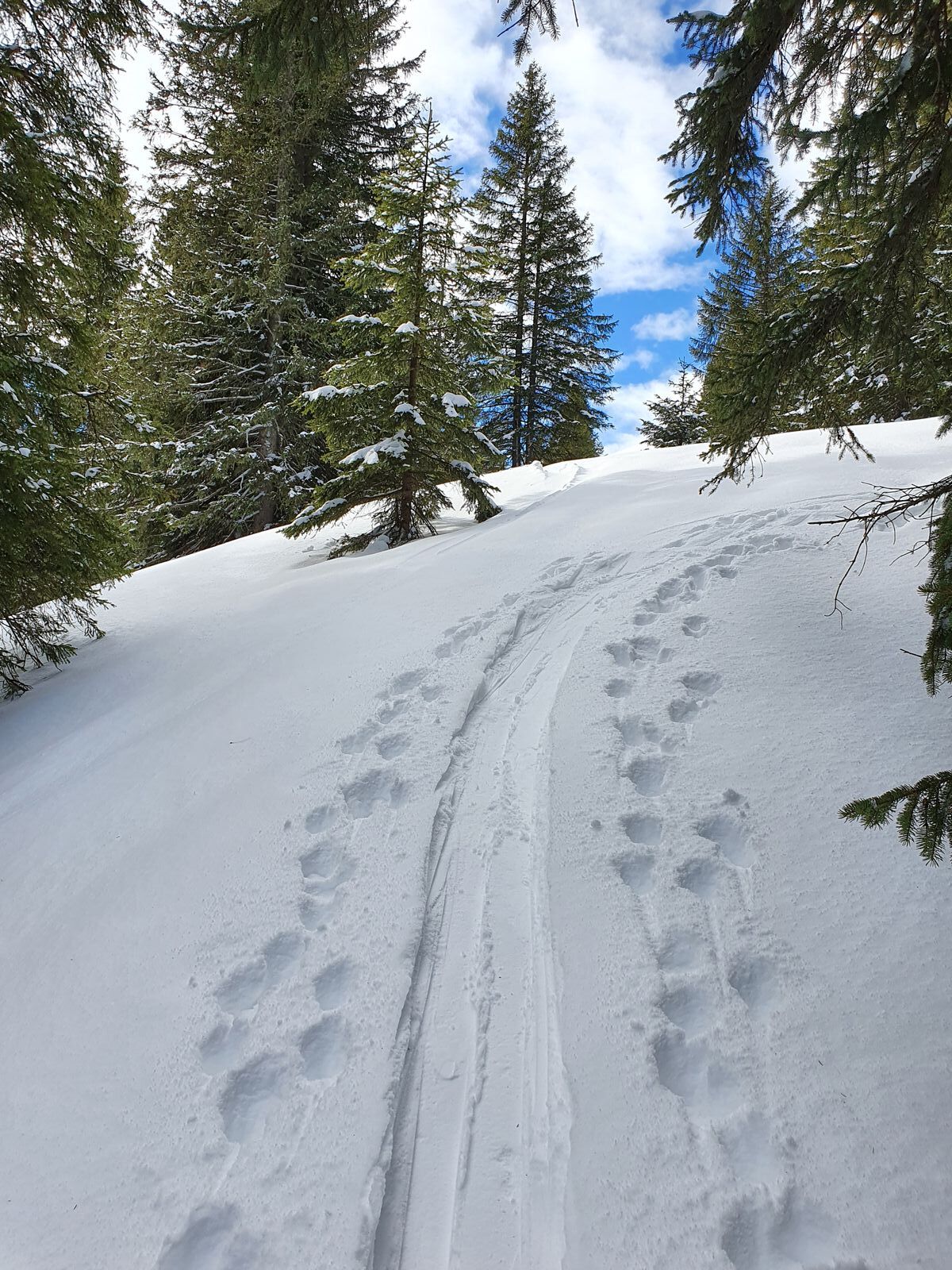 Kurz noch die Rodelbahn hoch bis sie abflacht. Dort bei Wegspinne/Verteiler Richtung Langenthal-Häuser der Spur folgen (Schild "Sackgasse: nur für Tourengeher"). Also die meistbegangene Aufstiegsroute. Nach erstem Anstieg im kurzen Waldstück geradeaus weiter hoch auf der rechten (in Laufrichtung) Talseite über freien Hang (Foto 1). Auf ca. 1400m mündet die Spur auf dem Bergrücken in die Spur, die ab Verteiler gleich rechts hoch führt (war angespurt aber zugeweht). Jetzt weiter durch den Wald (Foto 2) und auf Höhe der Pürschlinghäuser aus dem Wald raus und in Spitzkehren hoch auf kleines Plateau auf 1600m. Hier könnte man weiter hoch Richtung Teufelstätter oder gleich in den steilen Hang queren und andere Variante runter (da waren wenige Spuren zu sehen).