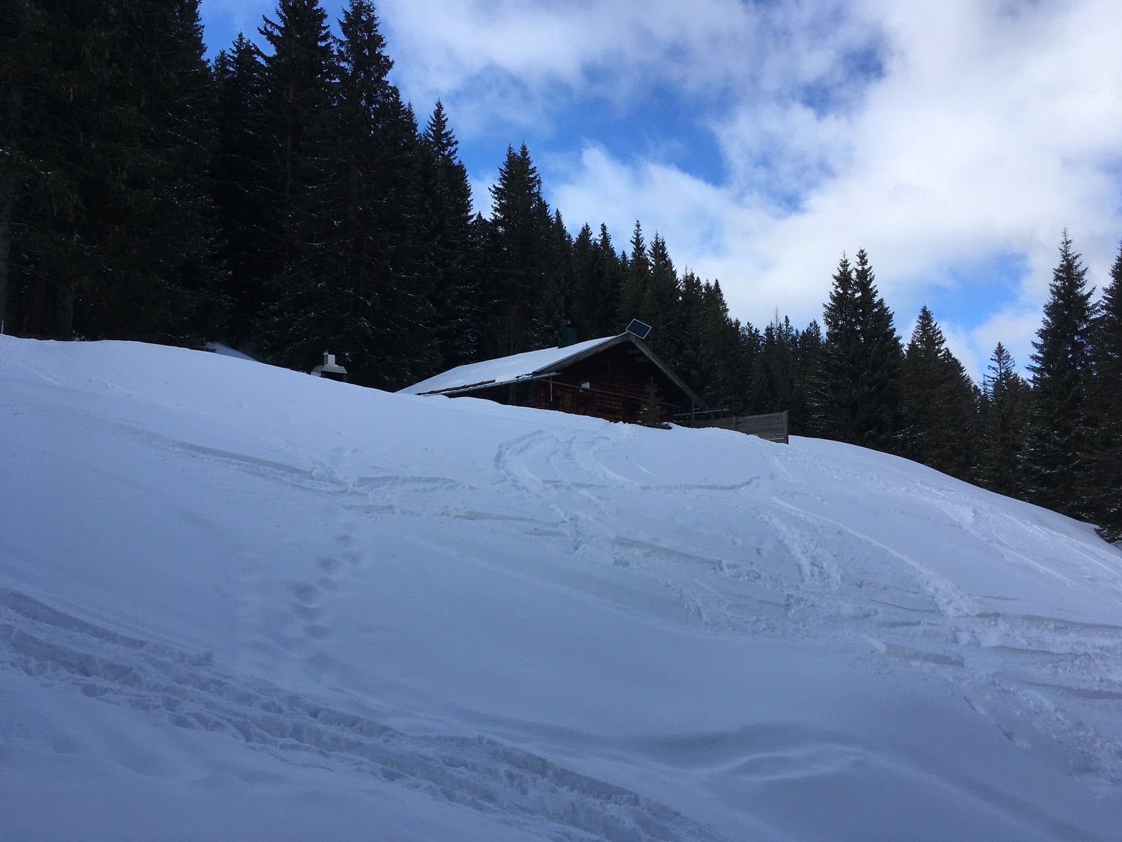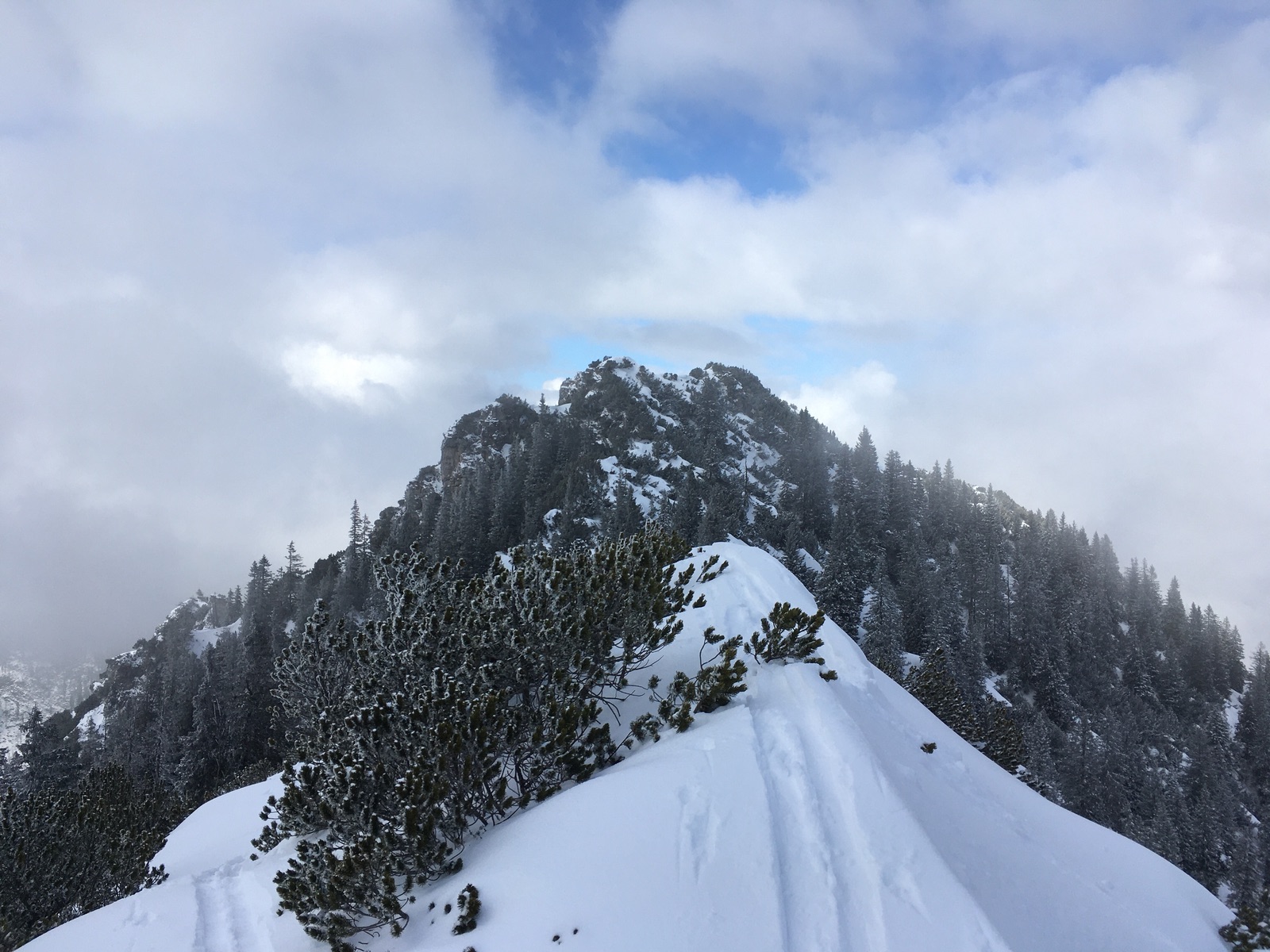 Am Samstag ging es eine recht einfache Skitour auf den Hahlekopf oberhalb von Reutte. Start für mich war am Bhf. Reutte, von Pflach wäre es wohl etwas kürzer gewesen. Da unterhalb von ca. 1.000 m in der Gegend nur der wenige Neuschnee liegt, konnte ich zwar die Skier in Oberletzen für den Aufstieg anschnallen, eine Abfahrt wäre da aber nicht möglich. Richtig los geht es am Frauensee (mit dem Auto könnte man bis dahin fahren), wobei oberhalb ca. 1.200 m die Schneehöhe deutlich ansteigt. Für den Aufstieg nimmt man am besten die Abkürzer des Sommerwegs, in der Abfahrt fährt man die langen Kehren des flachen Forstweges aus - muss man mögen, ist aber einfach und relativ schneesicher. Oberhalb der Sulztalhütte (nicht bewirtschaftet) geht es in den Wald und dann zu einem Idealhang (aus Skifahrersicht) hoch zu Joch (Schaller-Kapelle) - Samstag bester Pulverschnee. Der Weiterweg zum vorgelagerten Gipfelkreuz zieht sich etwas, zuletzt muss abgeschnallt werden. Skifahrerisch ist das nicht lohnend, wird deswegen auch eher selten gemacht. Ab das Gipfelkreuz hat mir noch gefehlt, war also Pflichtprogramm in der Gegend.
