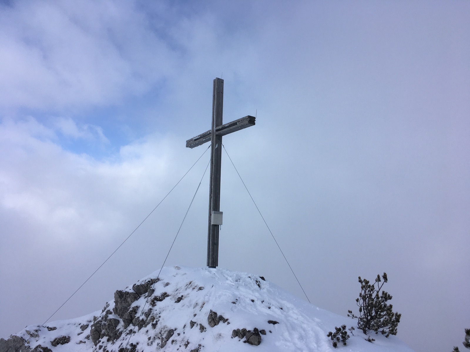 Gipfelkreuz erreicht - Aussicht wegen Nebels gerade zu diesem Zeitpunkt aber bescheiden: