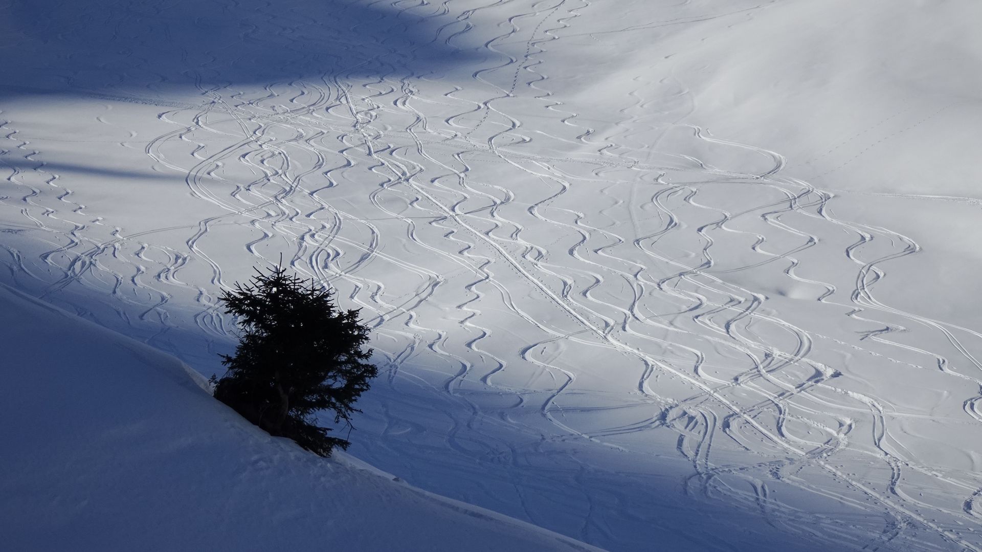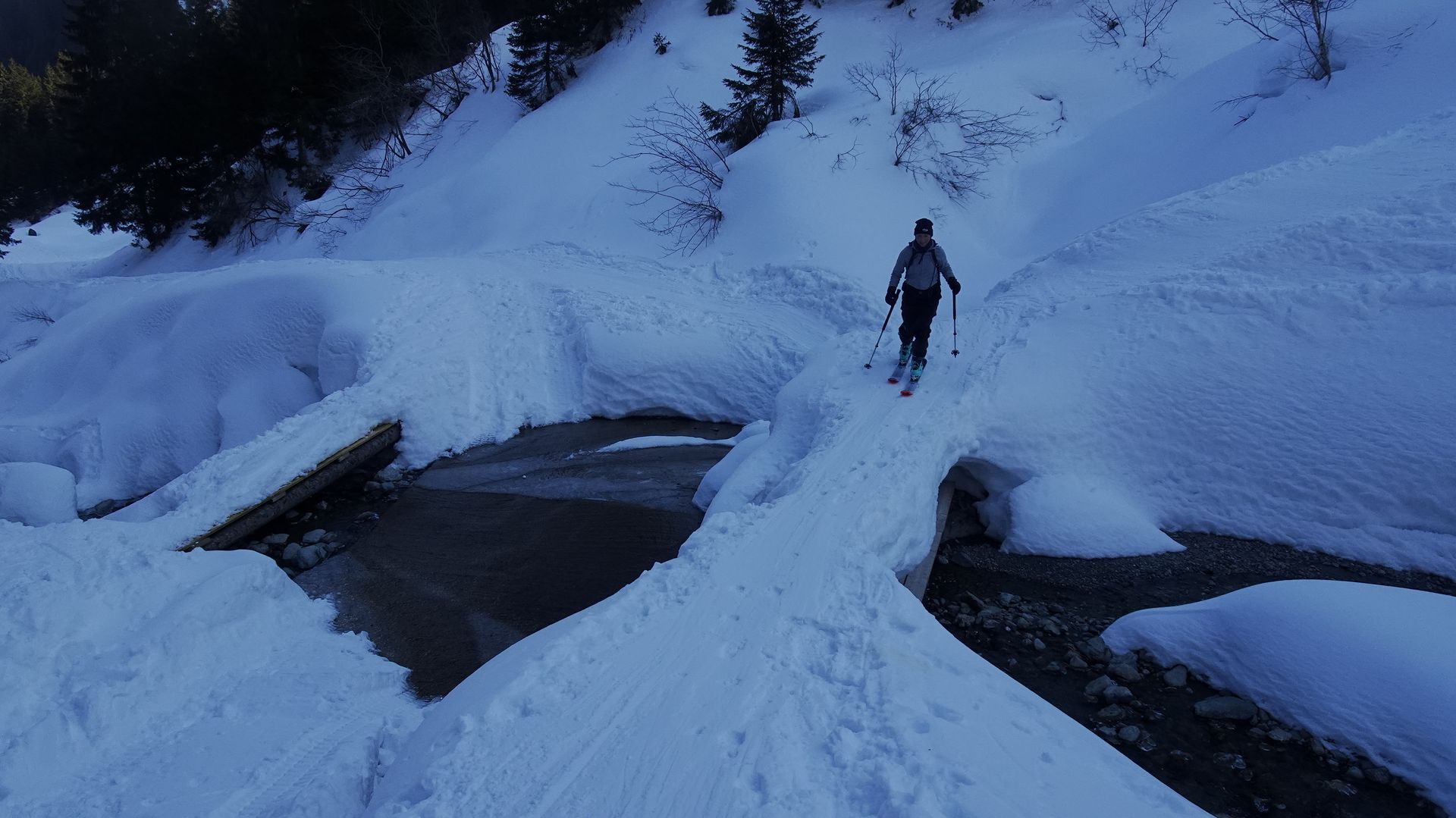 Abfahrt etwa wie Aufstieg, anfangs ruppig (der sonnige südseitige Hang oben hat nicht aufgefirnt, zu kalt), aber ok. Dann nach Norden in Pulverschnee bis Staffalm, noch mit Platz für eigene Spur. Wobei der Pulver etwas feucht war, aber nicht schwer, sondern fast schmierig, ging super. Nach der Staffalm nach links runter, da hatte der Schnee eine leichte Kruste, ging aber noch ok. Eine passende Stelle gesucht, um auf die andere Seite vom Bach zu steigen und dann flott den Ziehweg (und wieder die 2 kleine Brücken) zurück zum Auto.