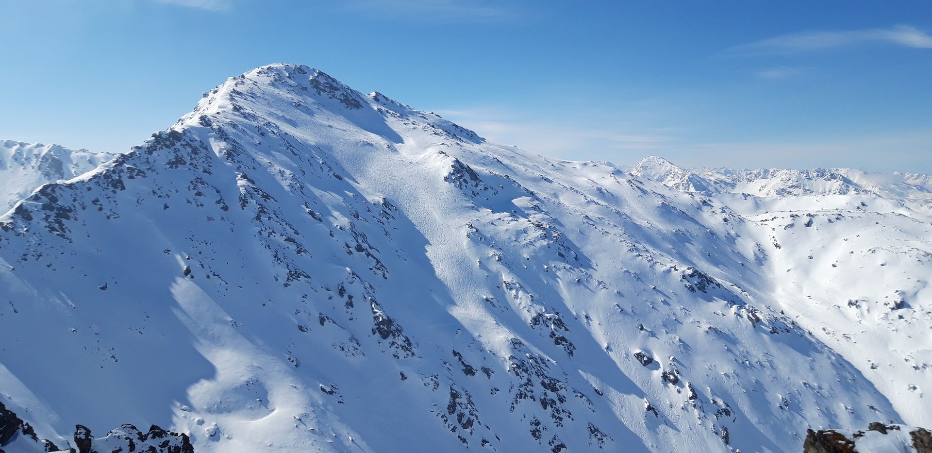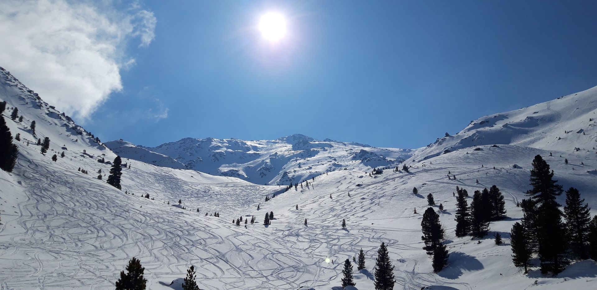 Heute bildete der Hirzer den Höhepunkt einer großzügigen Rundtour. Über die Studlalm ging es zunächst zum Edmund-Hillary-Köpfl und am aussichtsreichen Kamm hinüber zum Wildofen. Die erste Abfahrt erfolgte über die Nordwestflanke Richtung Hirzerkar bis auf etwa 2000 Meter. Anschließend auf sehr schöner Spur hoch zum Hirzer. Abfahrt nun nicht durch die klassische, schon sehr stark verspurte Karroute, sondern im Bereich des Aufstiegs bis etwa 2200 Meter. Zuletzt sind wir noch auf die noch beinahe jungfräuliche Sagspitze und von dort ins Tal.