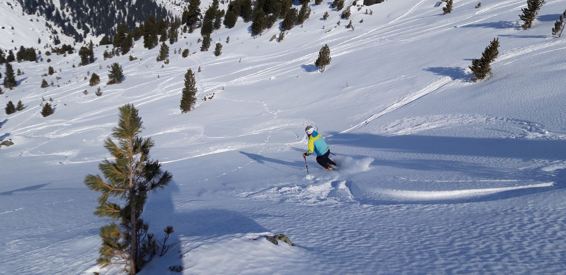 Die Verhältnisse sind sehr gut: Fast durchgehend Pulver, und nur in den Gipfelbereichen Gefahr von Steinkontakt. Die Forststraße zur Studlalm hat ausreichend Schnee. Harscheisen sind nicht notwendig.