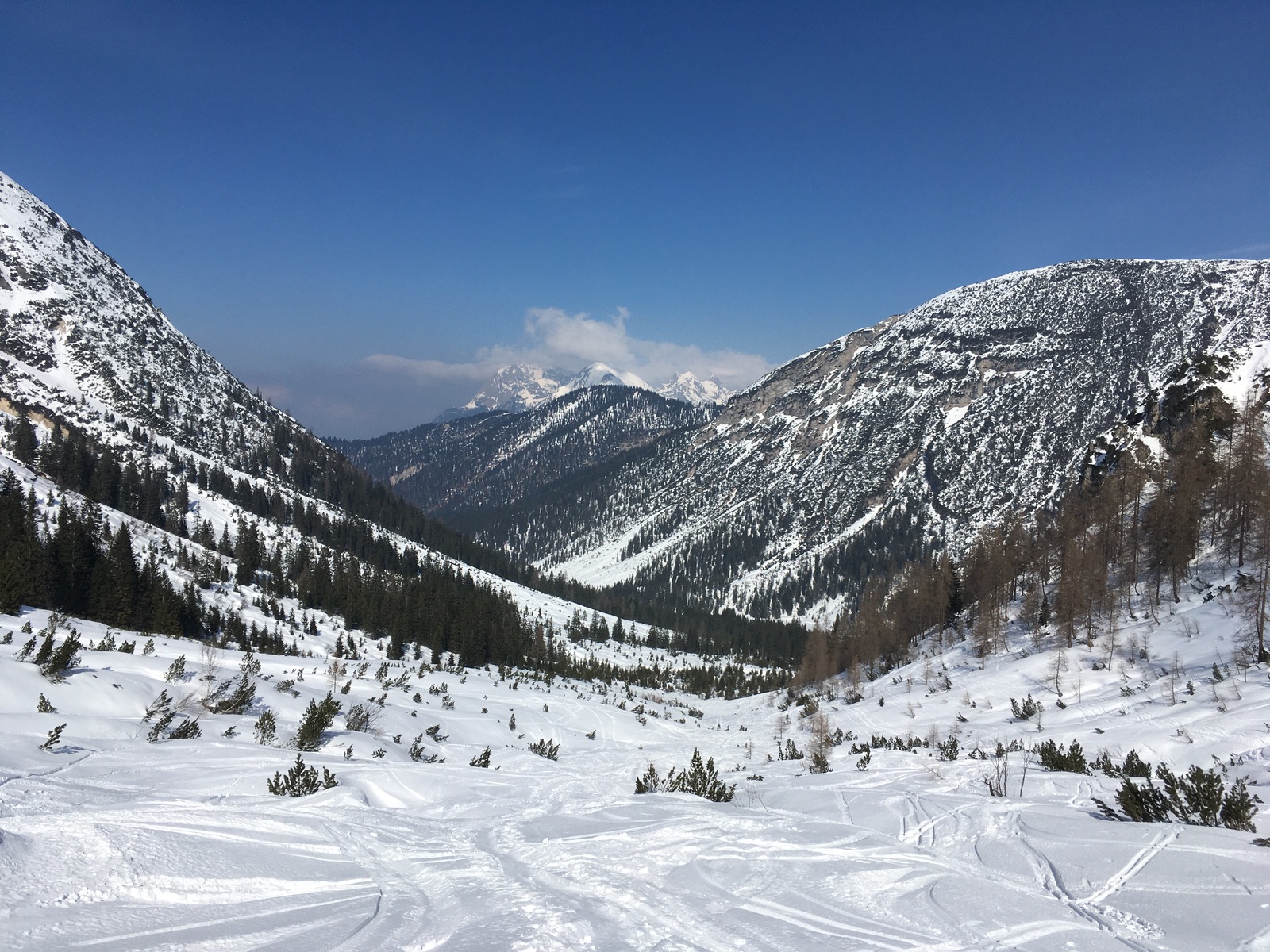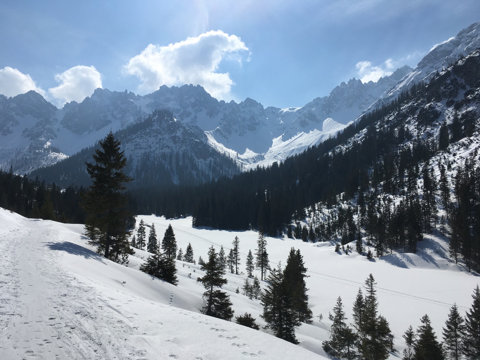 Am Samstag ging es ins Karwendel - Start direkt an der Bahnhaltestelle Gießenbach (es gibt auch einen kostenpflichtigen Parkplatz dort, aber warum mit dem Auto fahren, wenn man ohnehin direkt am Bahnhalt startet?). Die Forststraße hoch ist bis zum Abzweig ins Eppzirler Tal geräumt und deswegen unten schneearm und eisig. Bis zur ersten Brücke gibt es nur noch einen schmalen Streifen Schnee / Eis, hier wäre es in der Abfahrt wohl besser gewesen zu tragen (ca. 30 Hm) - wie so häufig (und auch die meisten anderen), wollte ich aber nicht abschnallen ...