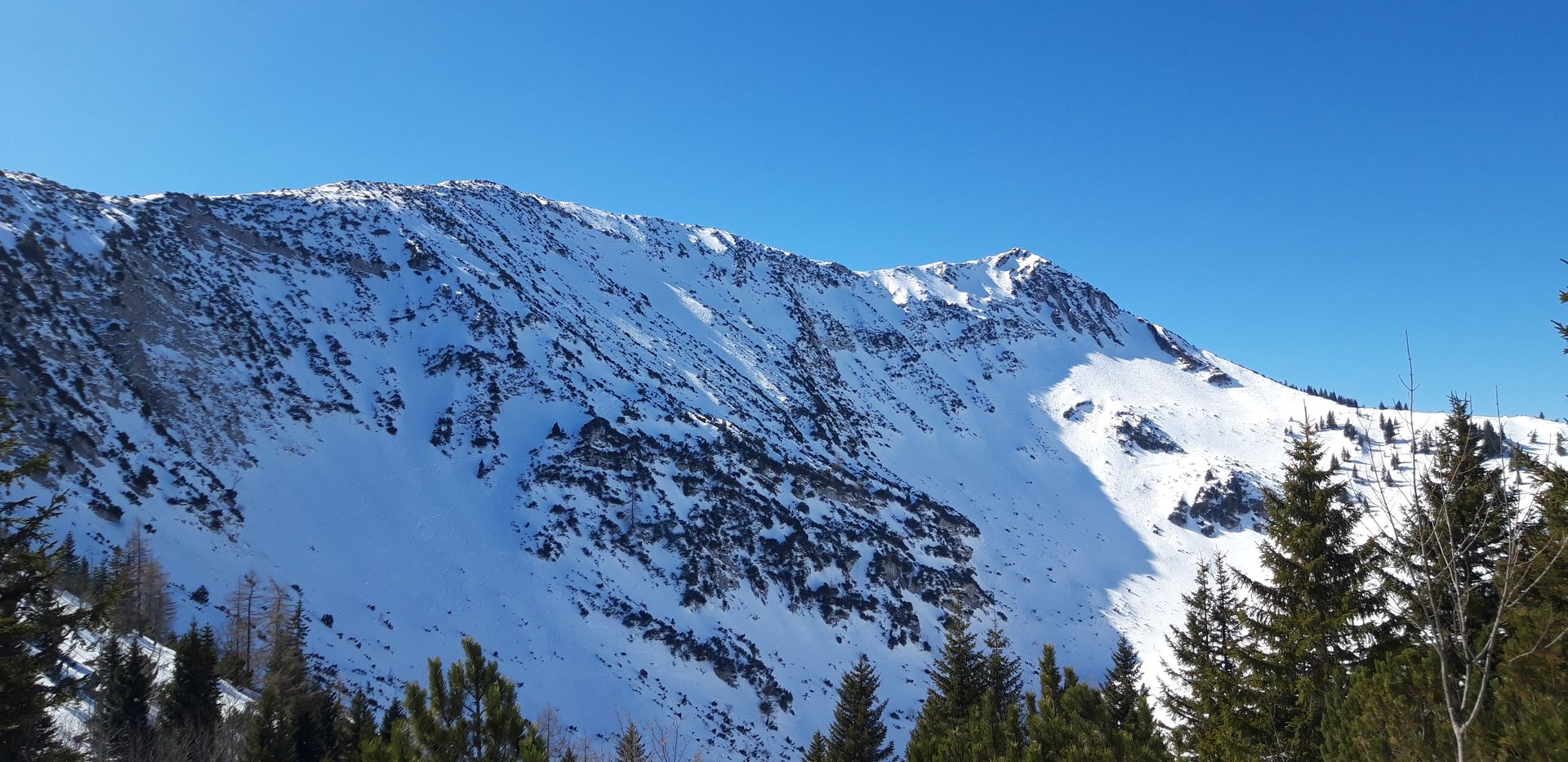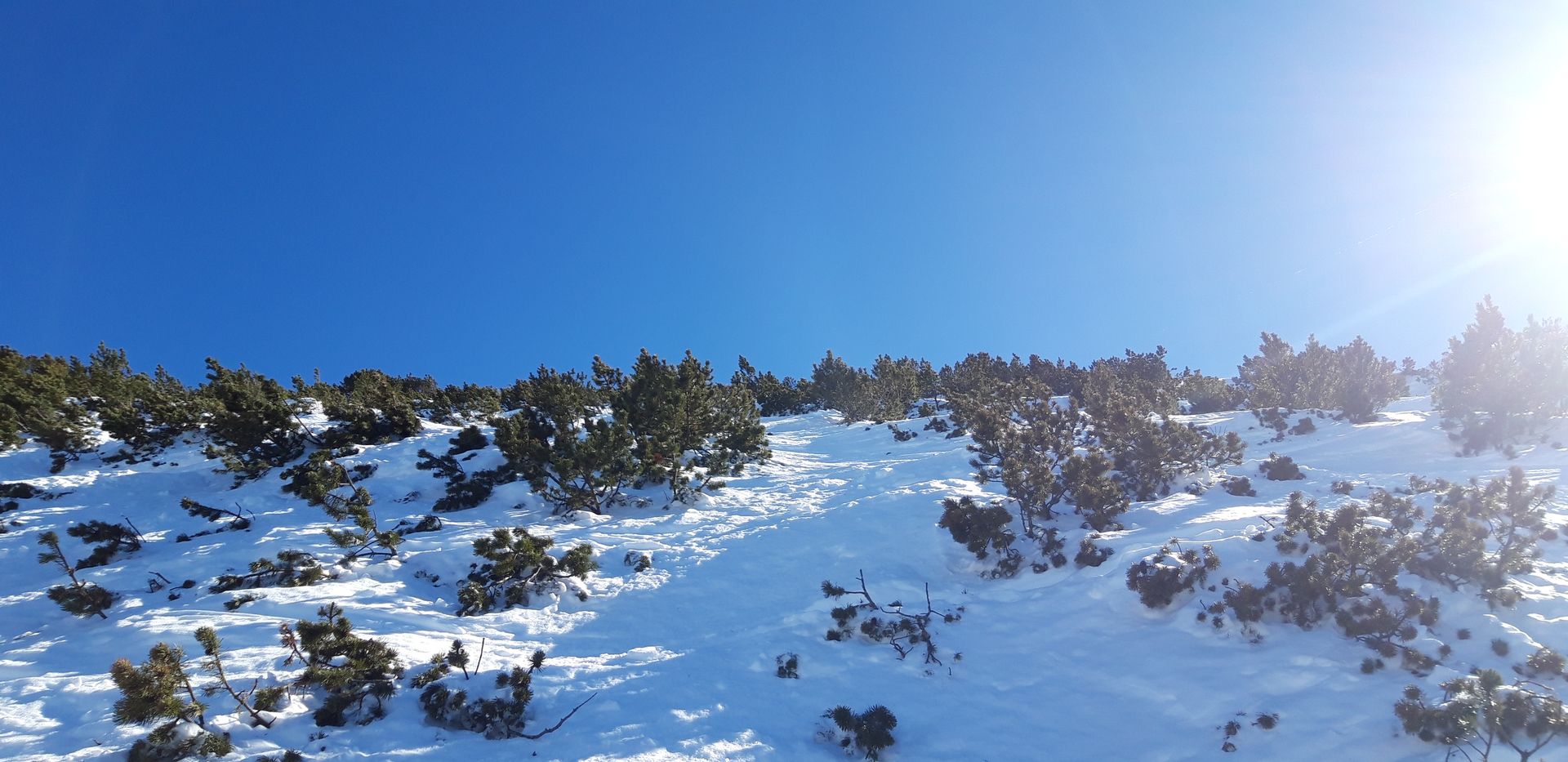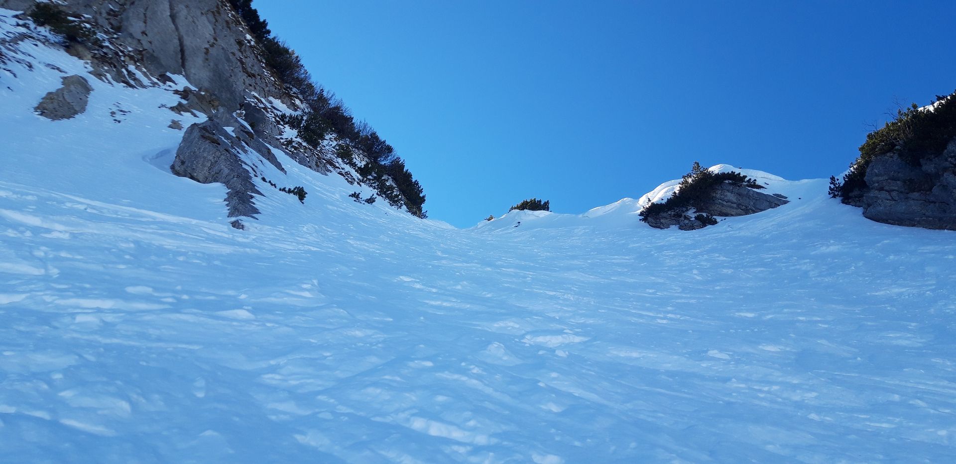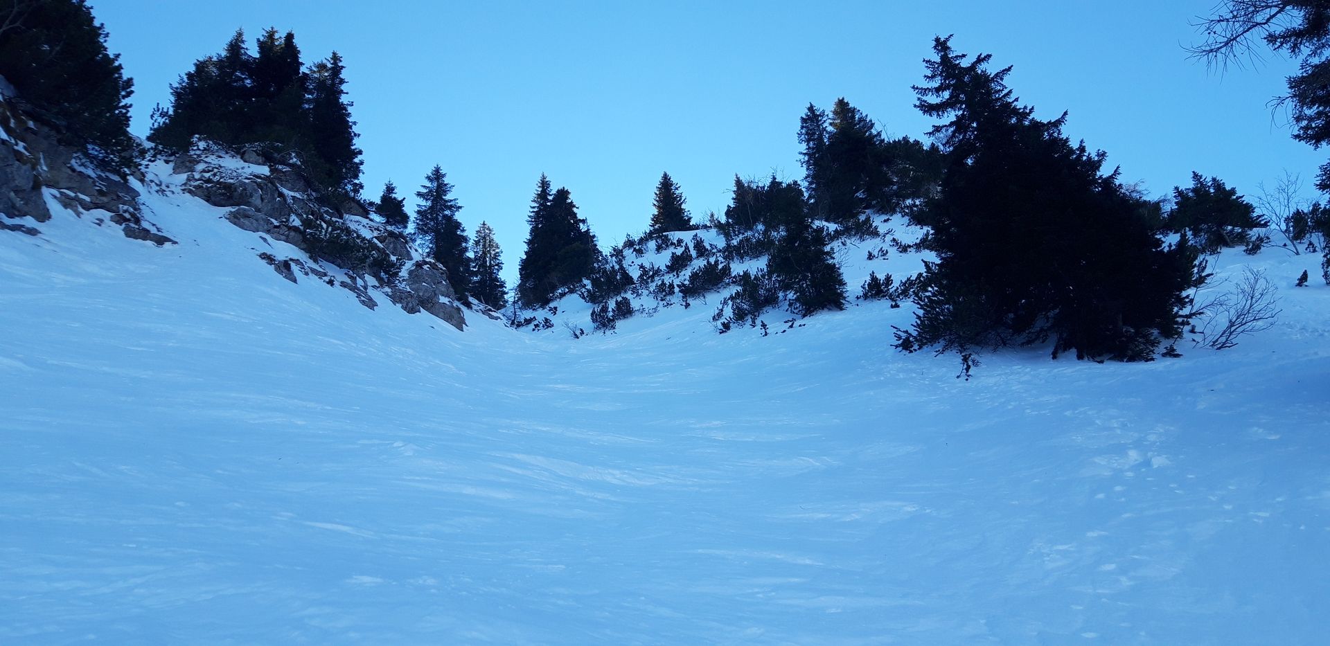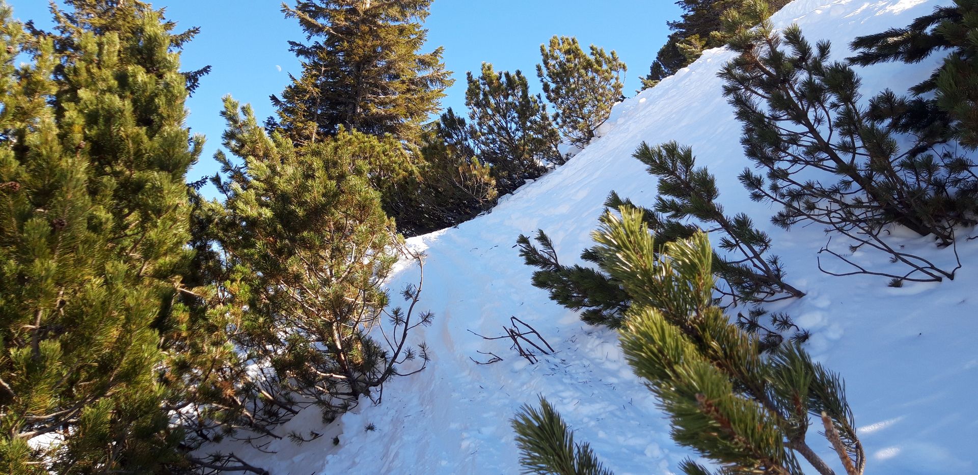 Lawinen derzeit kein Thema; die einzige Gefahr besteht in Fahrfehlern in den Steilbereichen bzw.darin, bei den Latschen einzufädeln.
