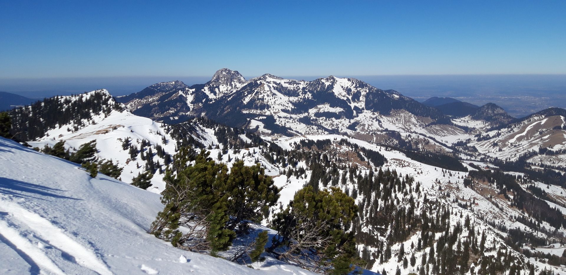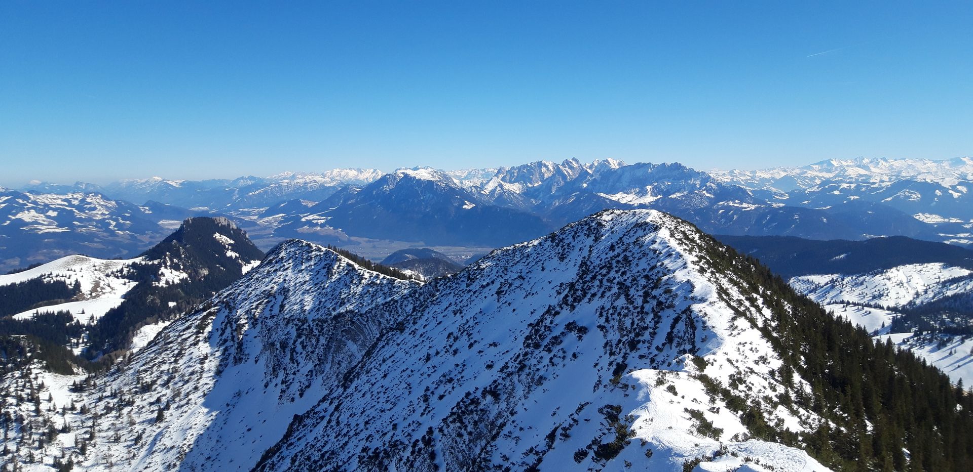 Ich bin heute gegen Mittag zum Thraithen aufgebrochen. Der Aufstieg über das Steilner Joch ist grundsätzlich gut machbar, auch wenn es im Latschenbereich wegen der geringen Schneelage teils etwas hakelig wird. Die schön angelegte Spur ist nicht eisig, aber von einem Wanderer ramponiert, sodass es sich besonders in den engen Spitzkehren mit Harscheisen besser geht. Der alternative Anstieg über den Fellalm-Sattel ist ebenfalls machbar, aber nicht wirklich zu empfehlen, da der Schnee hier durch abfahrende/rutschende Tourengeher zwangsläufig sehr hart ist.