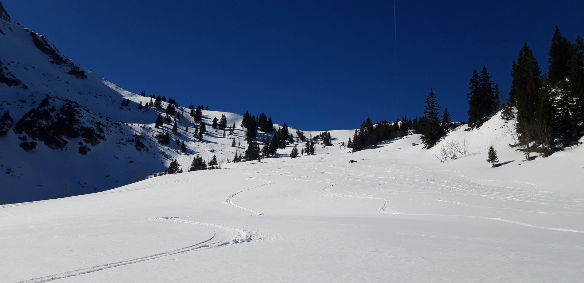Entgegen meiner Gewohnheit bin ich heute nicht am Unternberger Joch eingefahren, was aber auf jeden Fall gegangen wäre, sondern vom Hauptgipfel gestartet. Nach einer etwas nervigen Stopselei in den Latschen eine super Abfahrt: Im Steilen erst hart und griffig, dann pulvrig und am Ende bester Firn! Der Stopselzieher hat identische Verhältnisse und fährt sich echt klasse. Den feinen Firn im flachen Kessel hab ich durch einen Zwischenanstieg zum Fellalm-Sattel doppelt genossen. Hinweis zur Zeitplanung: Firn gibt es nur bis maximal 15 Uhr, da danach wieder alles im Schatten ist.