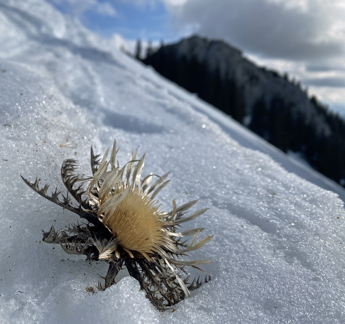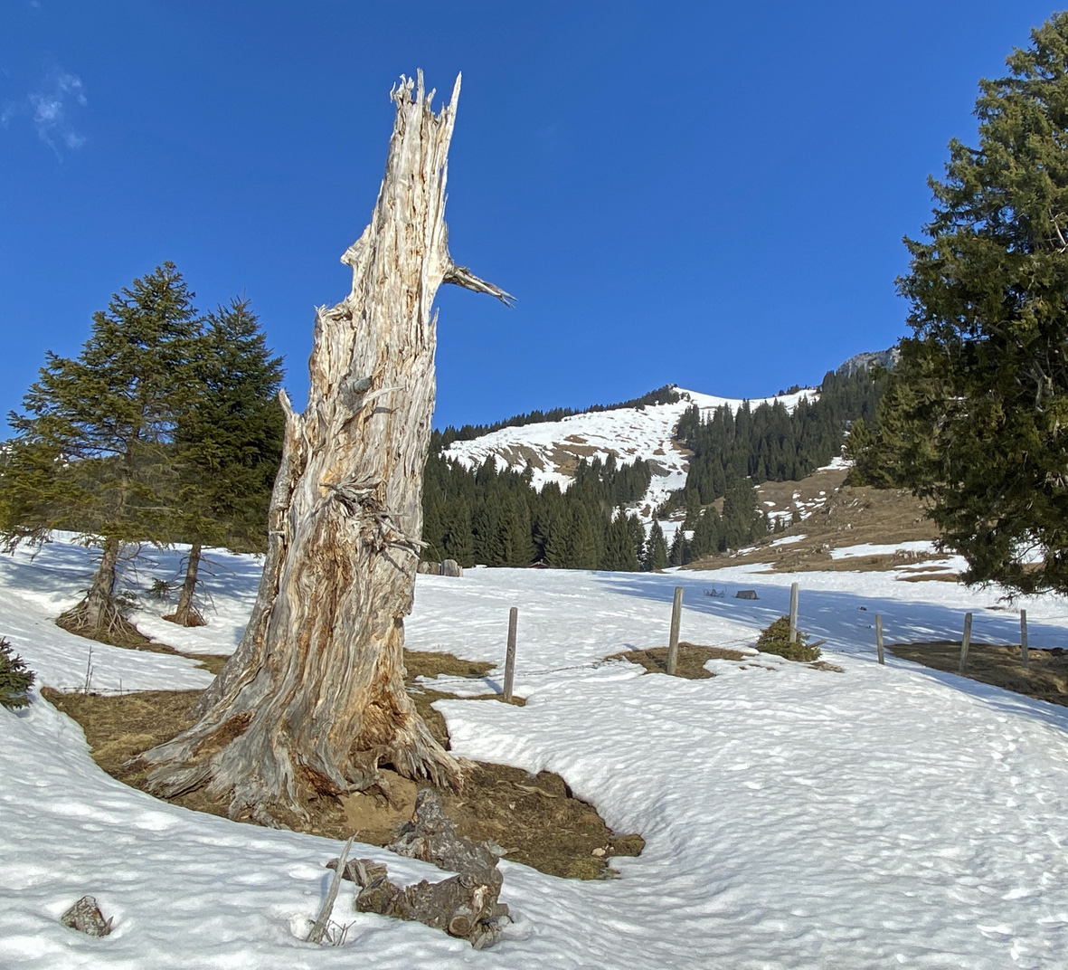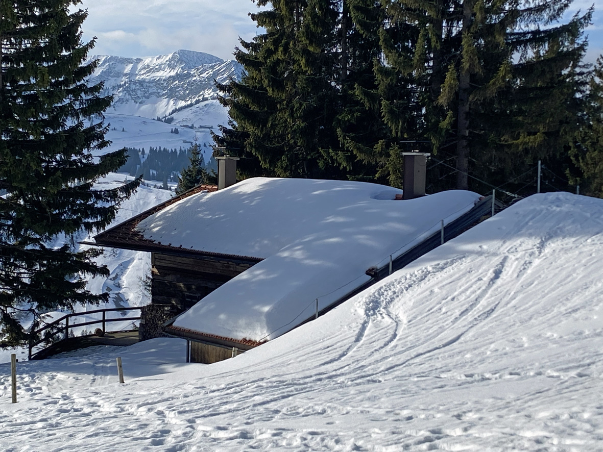 Lawinenlage: Heute vormittags LWS 1, alles sicher. Die Steilabbrüche sind ausgeräumt, darunter und darüber kleine Schneemäuler. Wenn man zeitig unterwegs ist und sich nah am Waldrand hält, eine relativ sichere Sache - aber die oberen Hänge sind nicht gerade flach, bitte auch LWS 1-2 nicht unterschätzen.