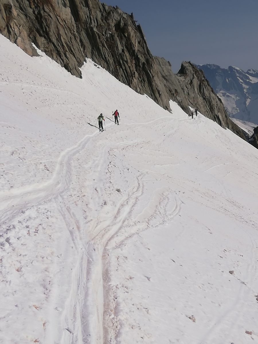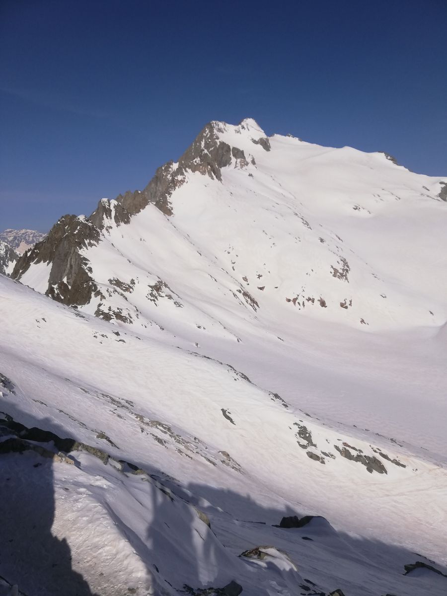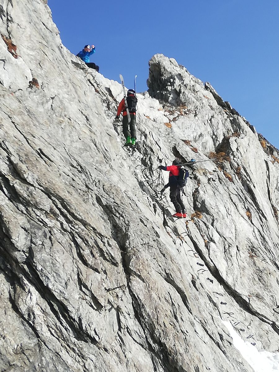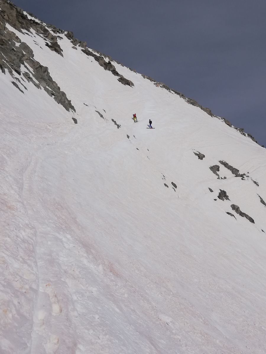 Der Gipfelhang war heute am späten Vormittag noch ziemlich hart und dürfte gut 35 Grad steil sein, kurzzeitig wohl auch steiler, an einer Stelle muss man bei dieser Steilheit ganz kurz zwischen Felsen durch. Trittspuren begannen ca. 100Hm unter dem Gipfel, man kann aber mit Ski bis ganz rauf (Harscheisen heute Pflicht).