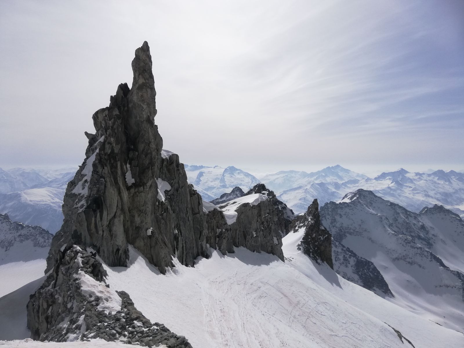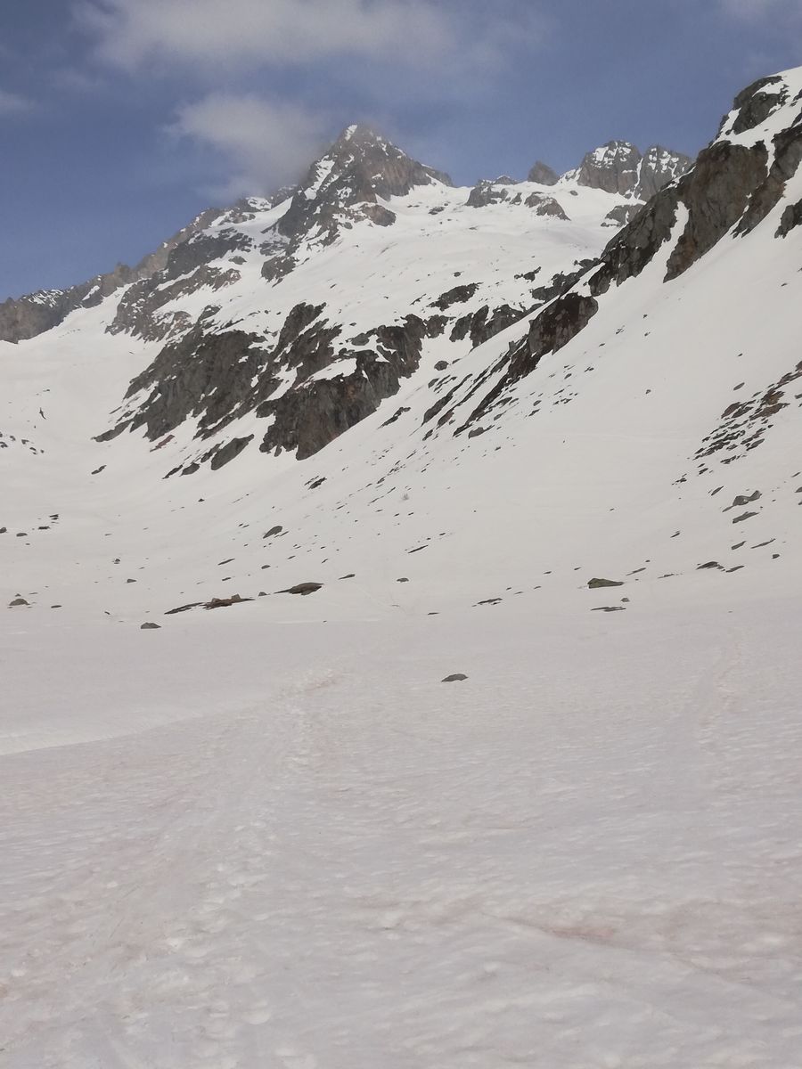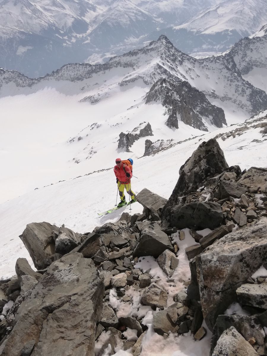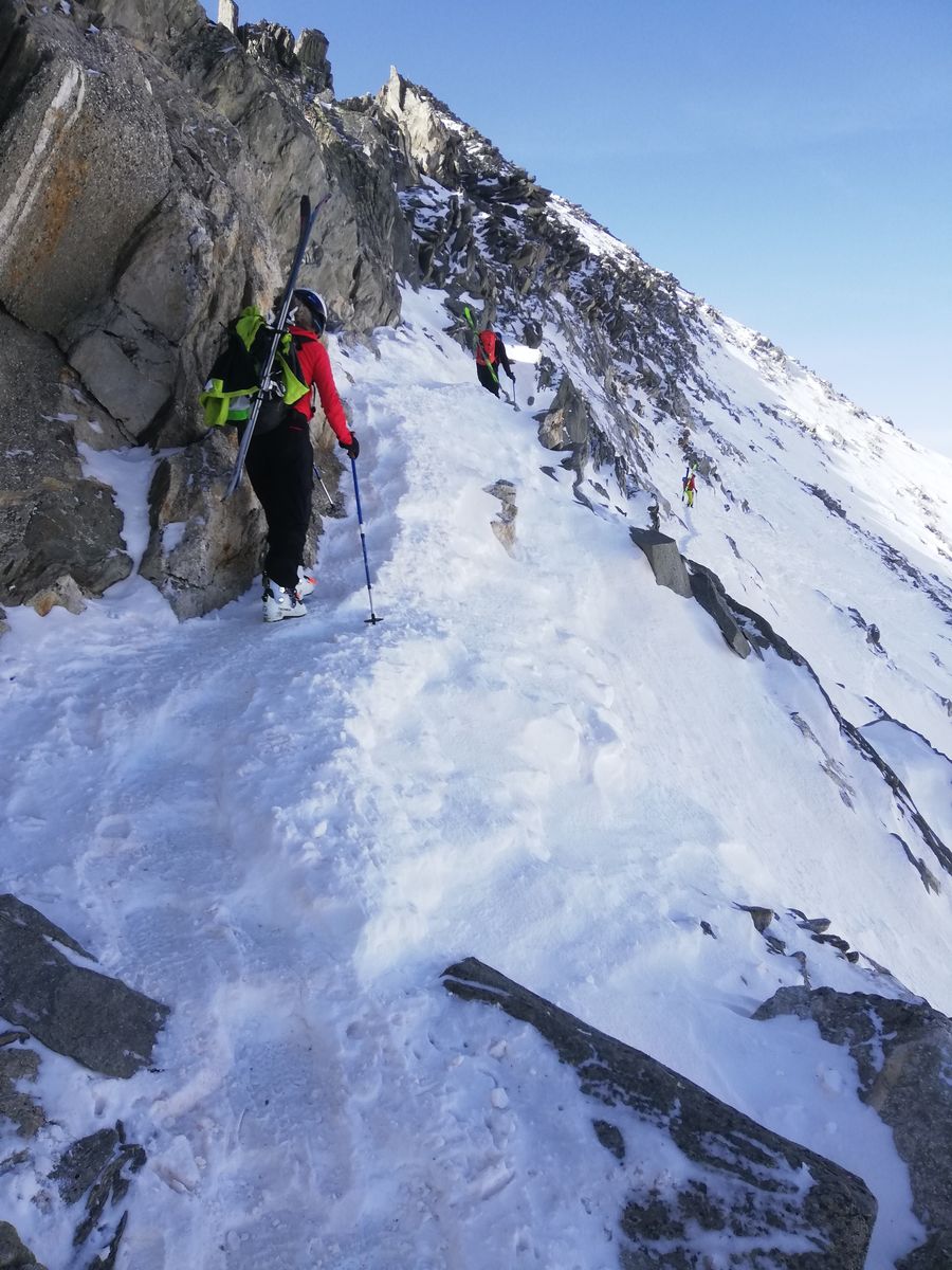 Der Gipfelhang war heute am späten Vormittag noch ziemlich hart und dürfte gut 35 Grad steil sein, kurzzeitig wohl auch steiler, an einer Stelle muss man bei dieser Steilheit ganz kurz zwischen Felsen durch. Trittspuren begannen ca. 100Hm unter dem Gipfel, man kann aber mit Ski bis ganz rauf (Harscheisen heute Pflicht).