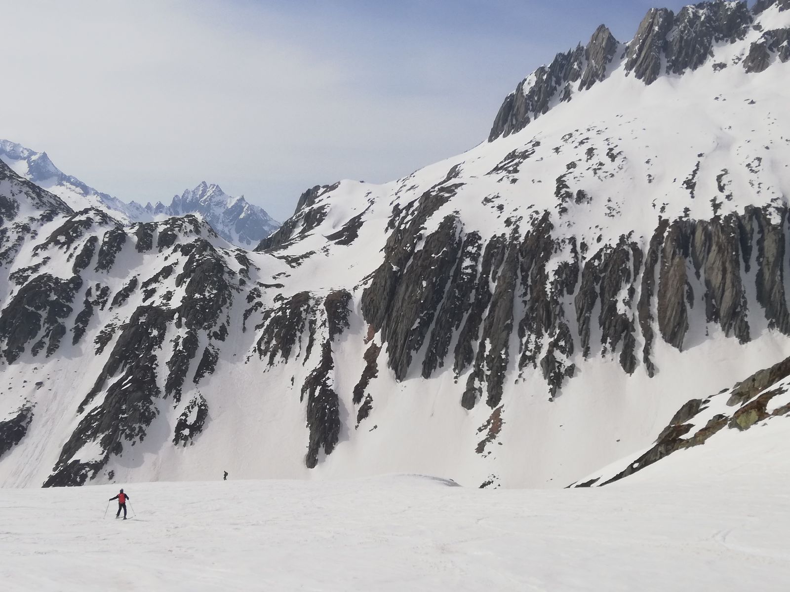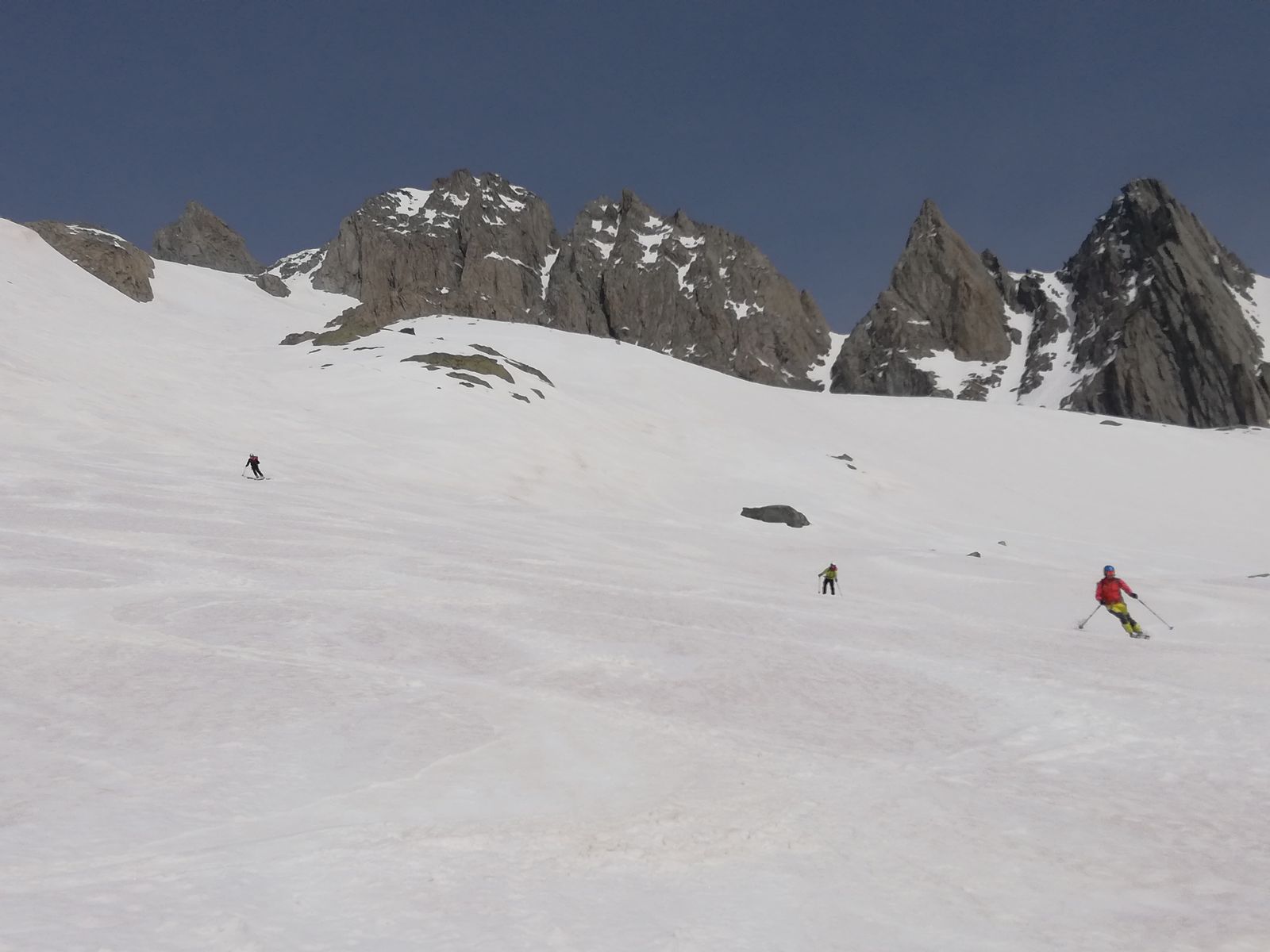 In der Abfahrt Gipfelhang um 13.00 immer noch hart, ab der Einfahrt ins Val Strem gute Verhältnisse, alles leicht sulzig, super zu fahren und rund 1100Hm am Stück (insgesamt sind es ca. 2000Hm Abfahrt). Das Tal raus läuft es auch meistens, noch reicht der Schnee bis Sedrun. Man kommt direkt am Bahnhof raus und kann mit dem Zug nach Disentis zurück (6 Franken pro Person), allerdings läuft man vom Bahnhof in Disentis bis zur Talstation der Gondel rund 20 Minuten.