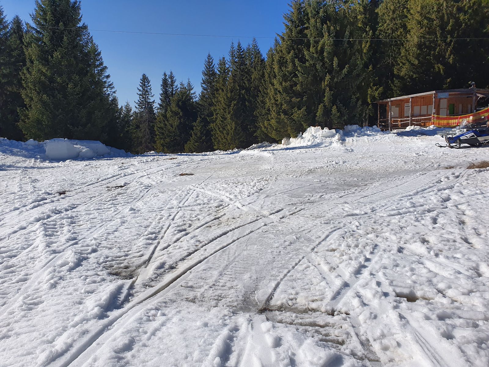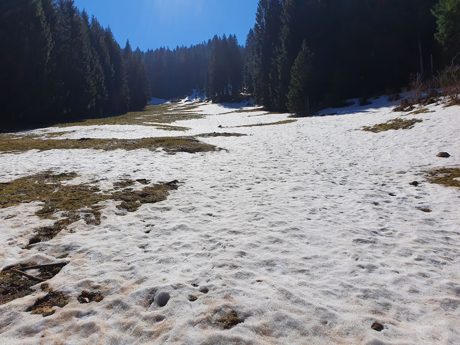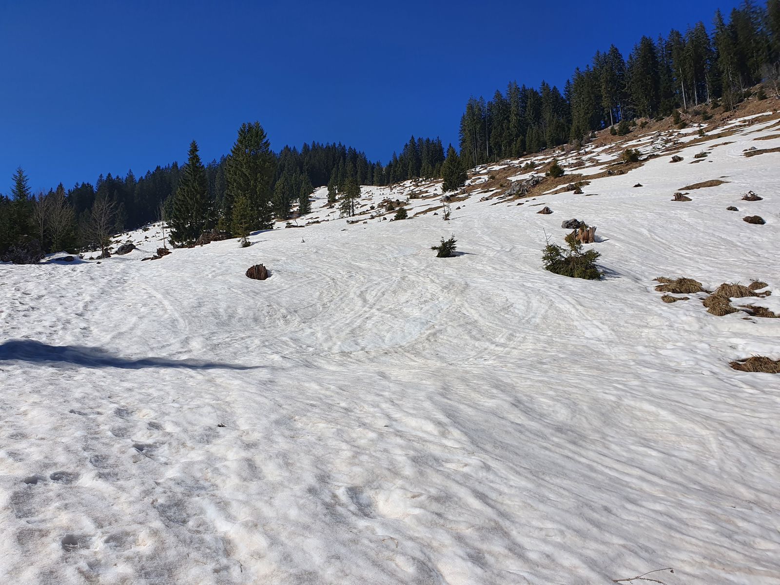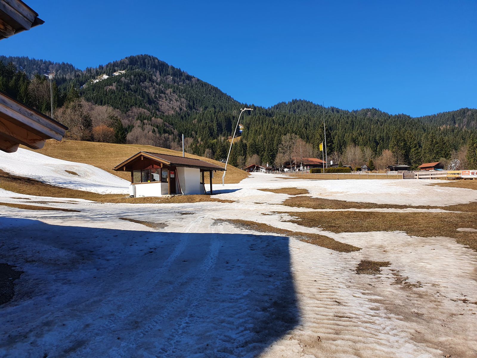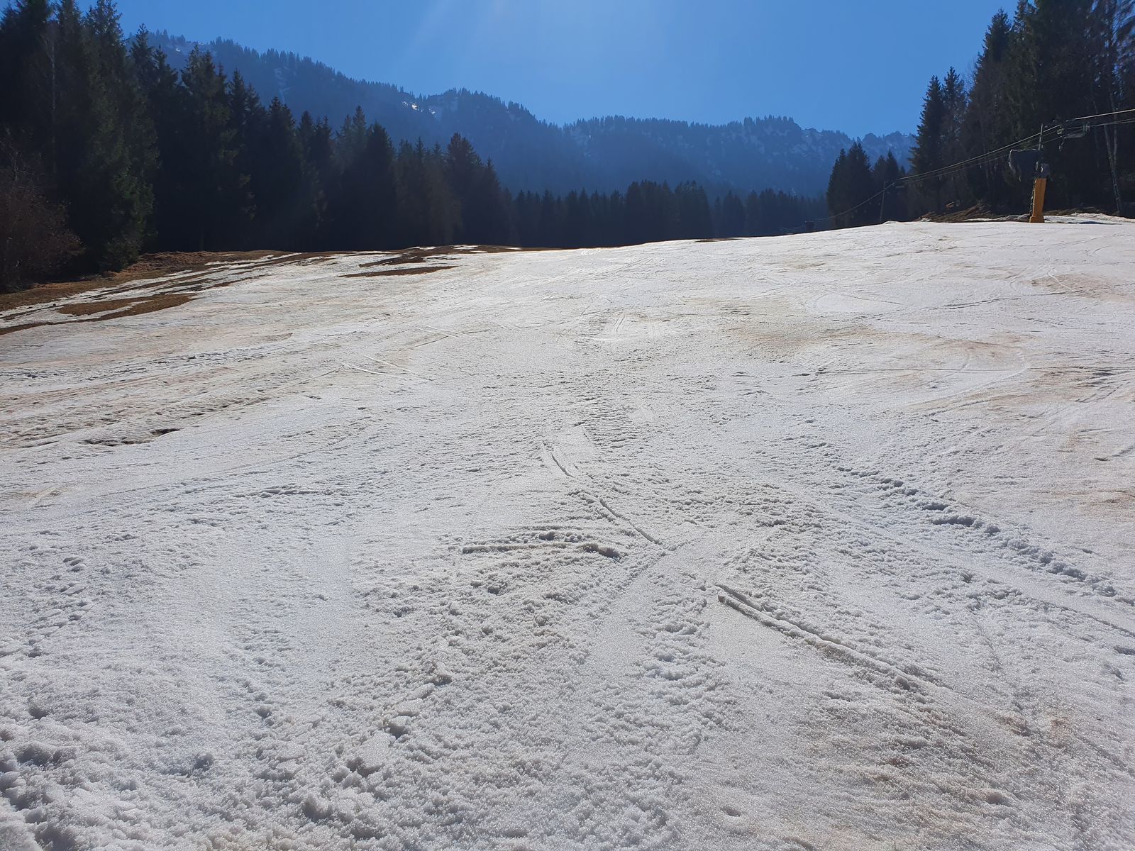 Hier erstaunlich gute Verhältnisse, sogar in der Sonne. Direkt nach dem kleinen Gegenanstieg wird der Weg aper, kann man aber derzeit noch problemlos durch einen Schlenker nach links umgehen. Dann bis fast ganz unten ohne Abschnallen. Z.T. zwar Eis, war aber zu der Tageszeit sehr griffig. Erst auf den letzten Metern ca. 100m abschnallen, dabei bin ich dann gleich rechts durch eine Zaunlücke rüber auf die Piste und zurück zum Parkplatz.