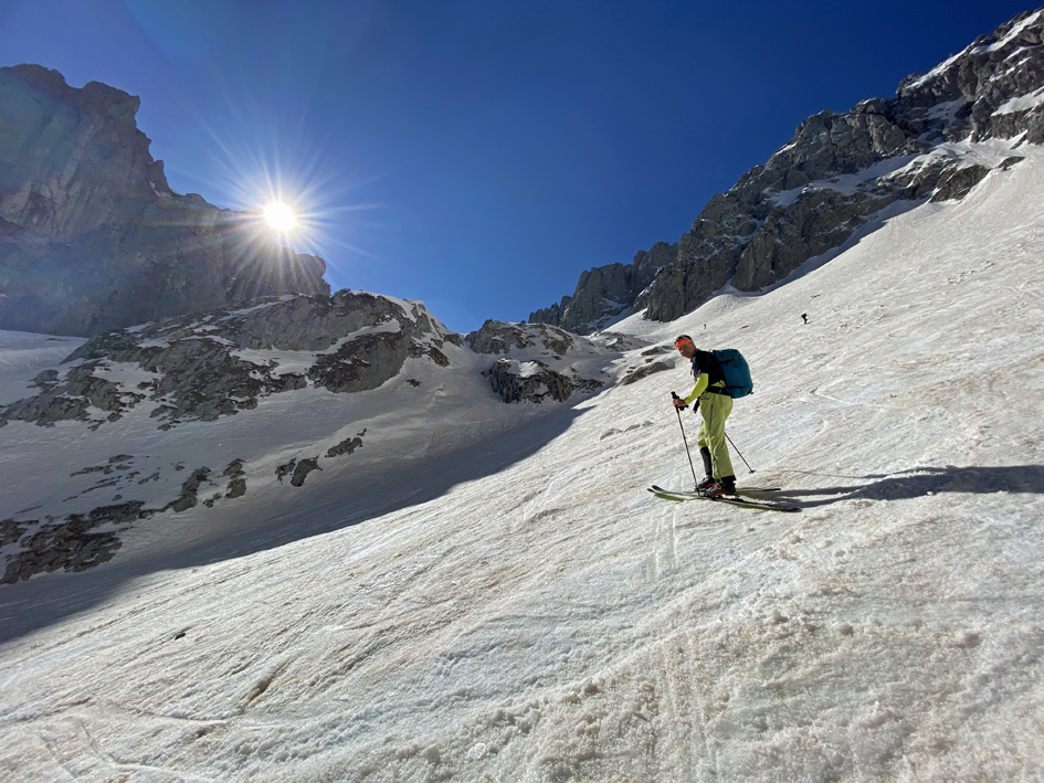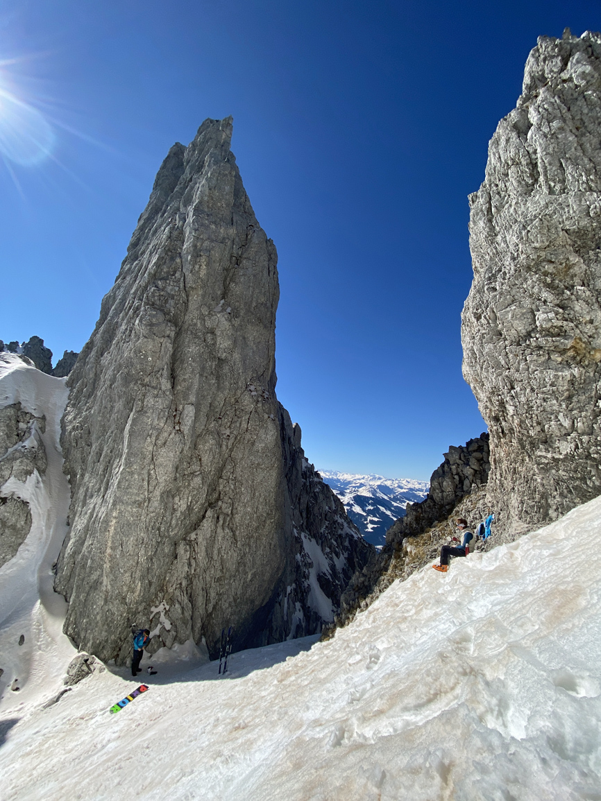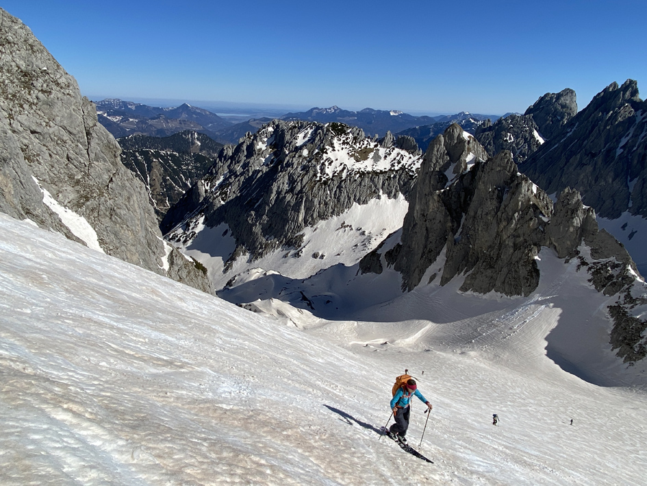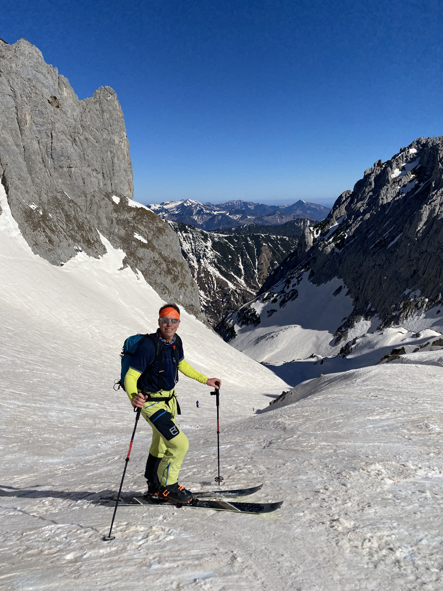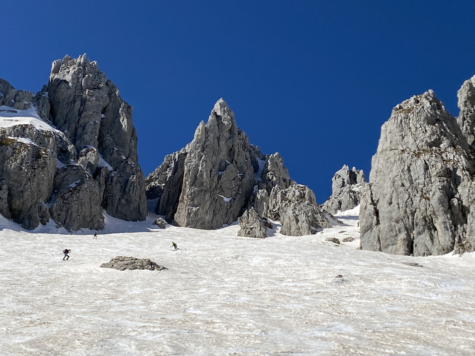 Gute Spur durch den Wald und ins Kar sowie hinauf zum Törl (wir haben wegen der Sonne die rechte der beiden Scharten gewählt). Abfahrt gegen 11 Uhr ein recht guter Zeitpunkt heute: oberster Teil angenehm weich, unten passabel aufgefirnt (eine halbe Stunde später wäre es im unteren Teil sicher noch besser gegangen, aber erstens musste ich nur Arbeit und zweitens würde es ganz oben irgendwann sumpfig.