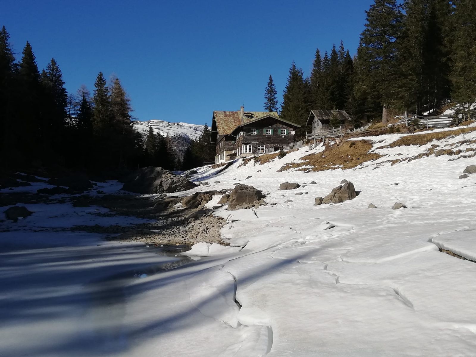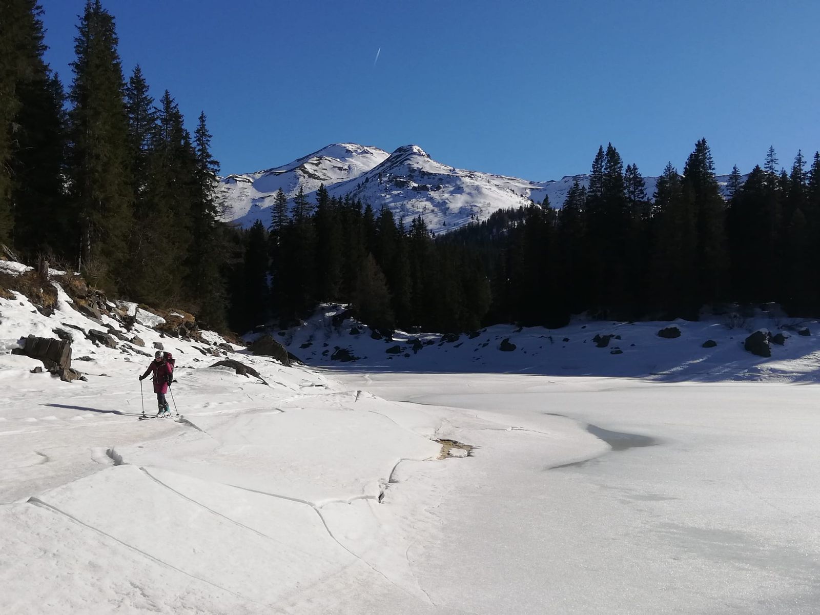 Der Gipfel(Nord)hang ist heute nicht aufgefirnt, unterhalb etwa 2000m jedoch firniger, weicher Schnee bis ins Tal. Im Bereich des Sees ein kurzes aperes Stück, das man jedoch gut umgehen kann.