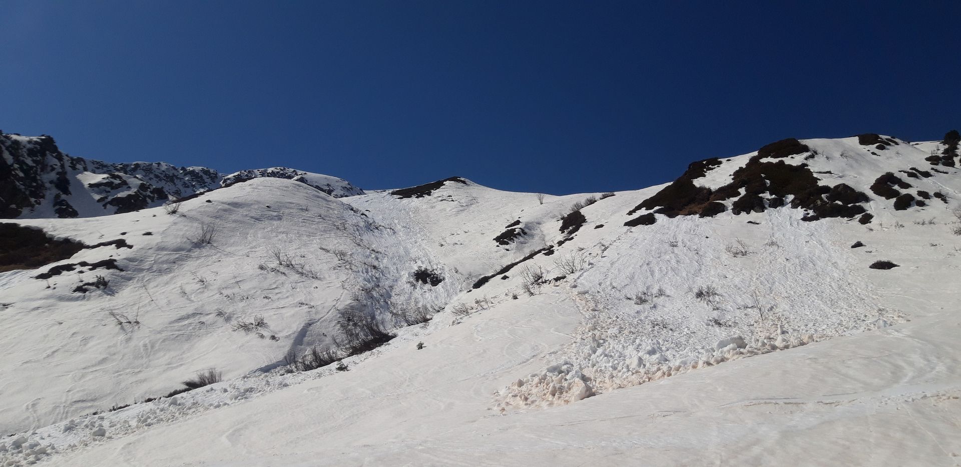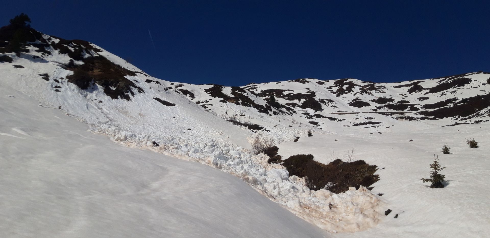 Abgefahren bin ich bei fast optimalen Firn um 11 Uhr über die andere Seite des Lämpersbergs (oben Süd, dann Ost). Ich habe mich dabei in der großen Wanne oberhalb der Trettalm im Abfahrtsinn eher links gehalten, da der rechte Teil erst später Sonne bekommt. Dabei bin ich an einigen frischen Gleitschneelawinen (gestern?) vorbeigefahren (siehe Bilder). Unterhalb der Alm ist es klüger, die Forstraße zu benutzen als die freien Hänge. Das sieht man von oben aber nicht: Als ich zur Forststraße kam, sahen die Wiesen daneben verlockend aus, aber kaum kommt man über die Geländekante geht das Gestopsel los: Runtertreten, kurz Abrutschen, Runtertreten... Zwischendrin muss 10 Minuten getragen werden (auch auf der Forststraße), bis im Talgrund wieder genug Schnee liegt. Am Ende fährt/skatet es sich auf der präparierten Loipe gut zum PP.