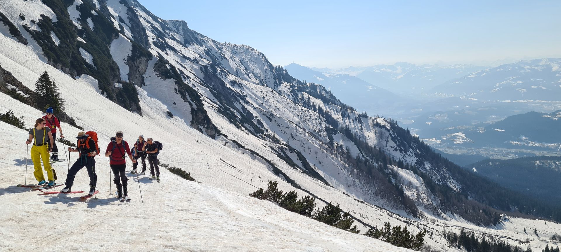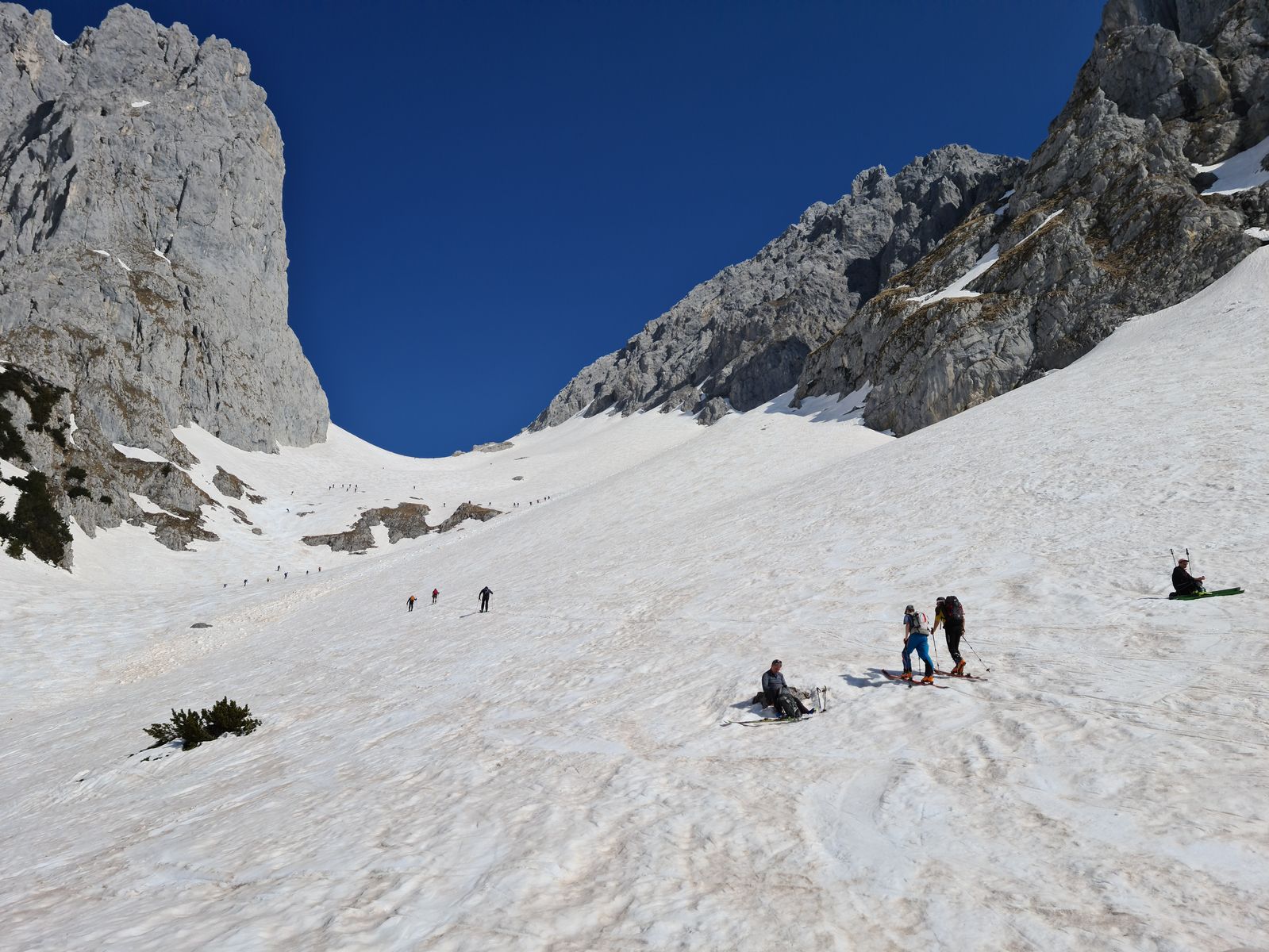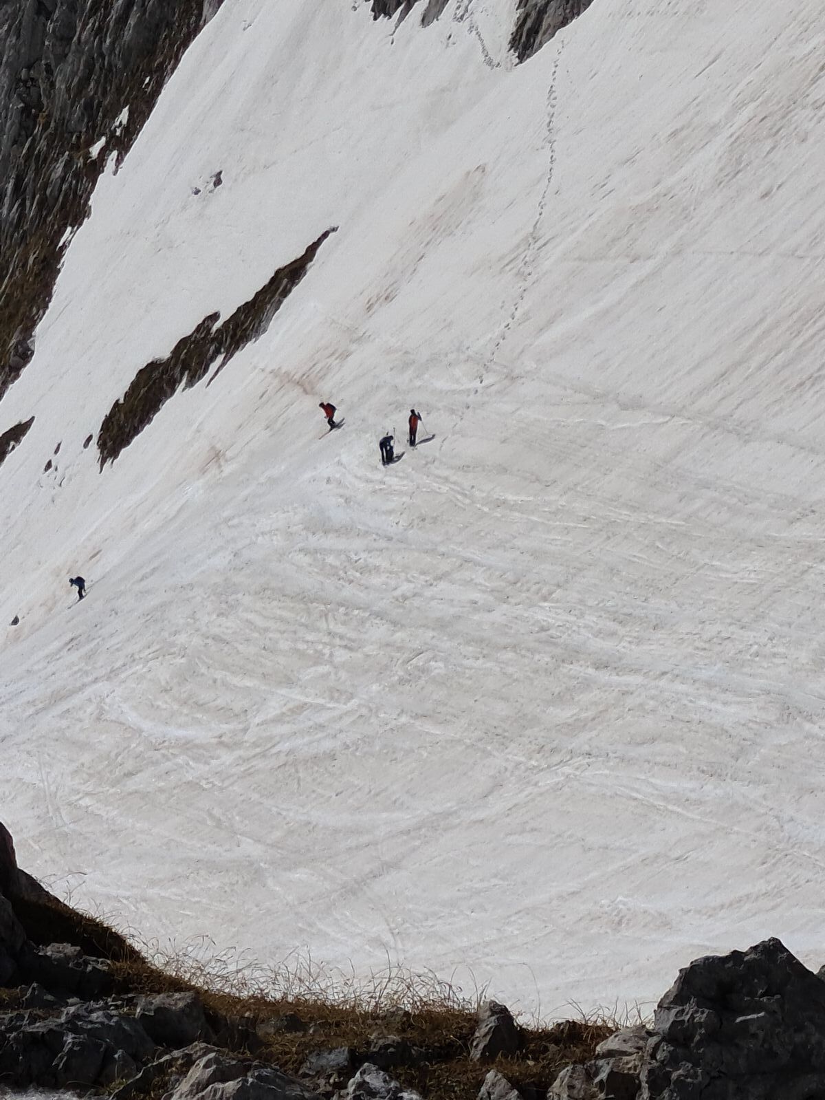 Ich vermute wegen höherer Luftfeuchtigkeit ist der Schnee heute früher weich geworden. Zwischen 11 und 12 Uhr hatten wir eine perfekte Firnabfahrt.
