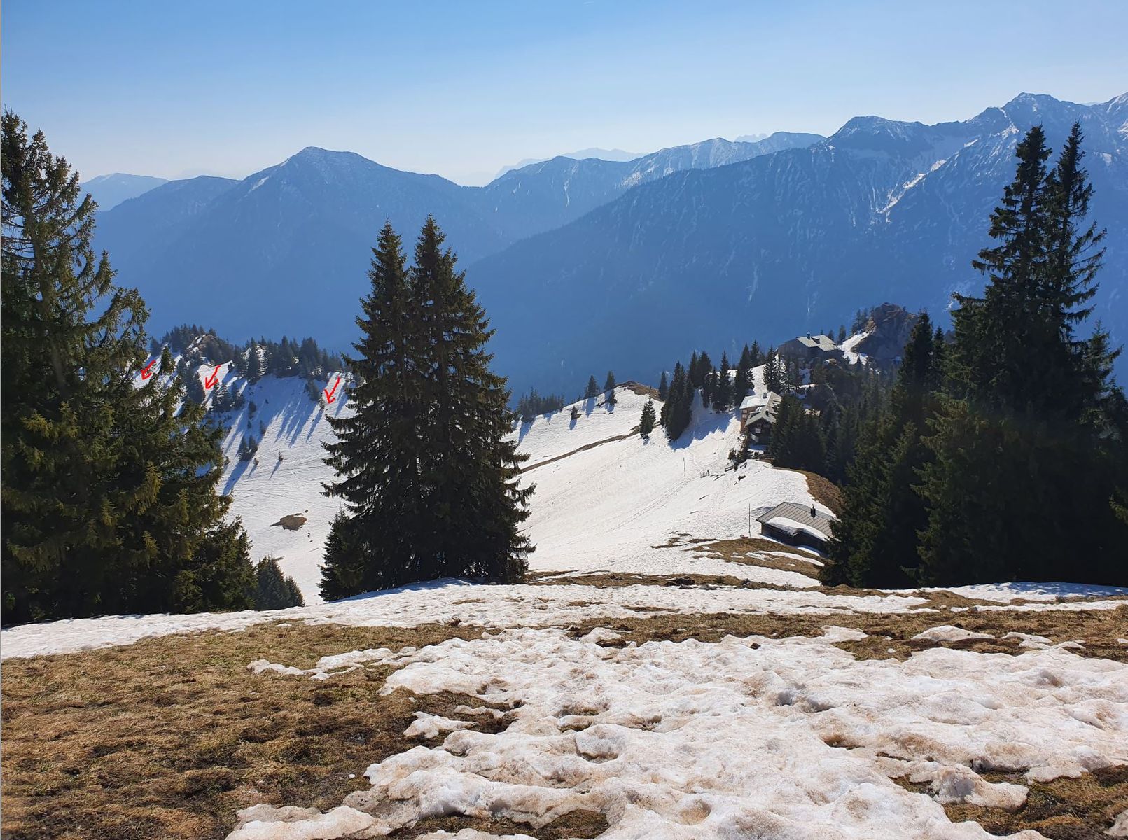 Foto: Blick vom Pürschling-Sattel/Panoramablick, Update zum Bericht von 4 Tage vorher, rot markiert: Schattenhang-Abfahrten -> auch weiter links vom Foto geht es. Wird dann steiler und damit u.U. bei Erwärmung Abgänge einkalkulieren. Bei den roten Pfeilen ist es eher unkritisch.