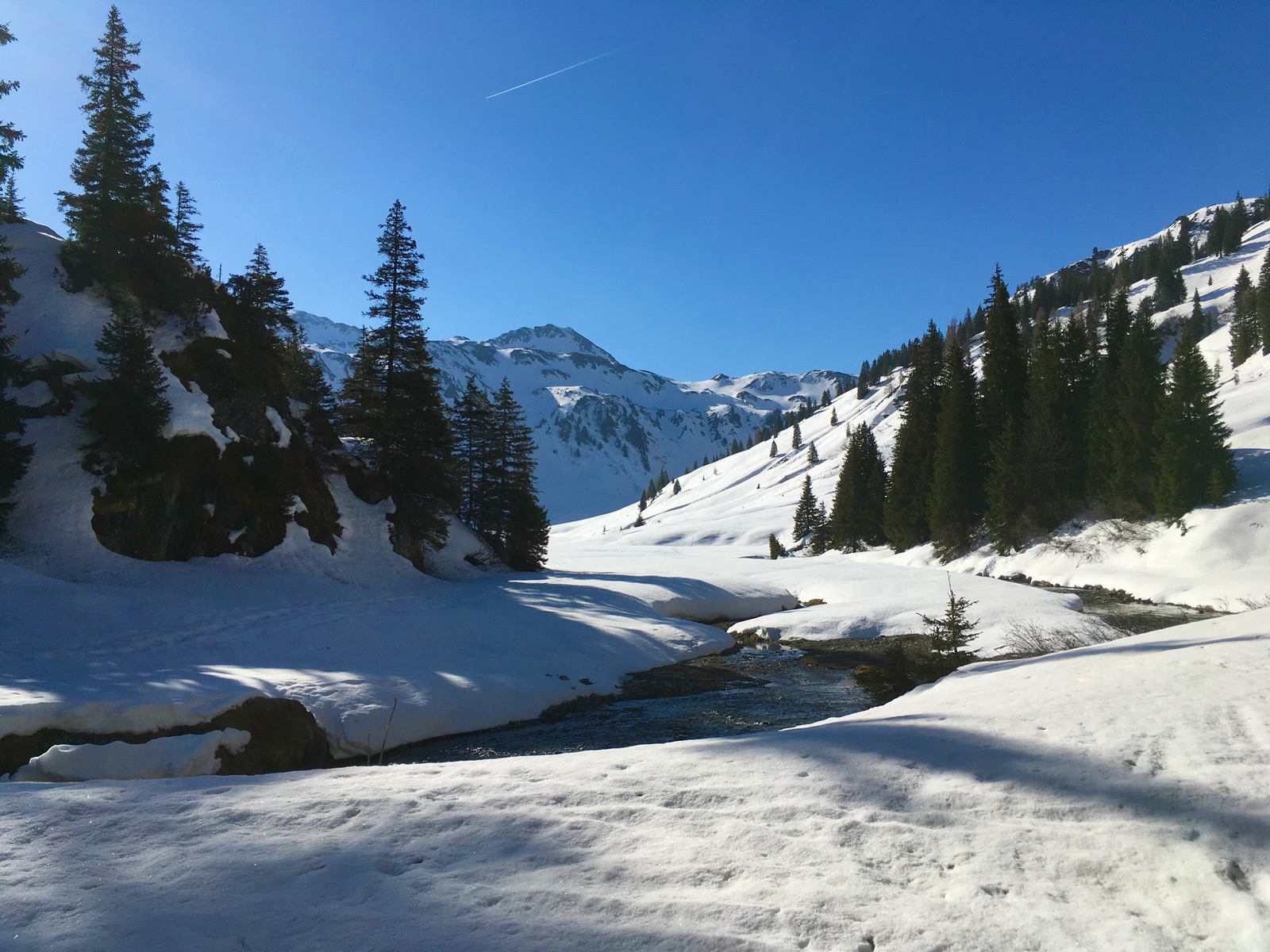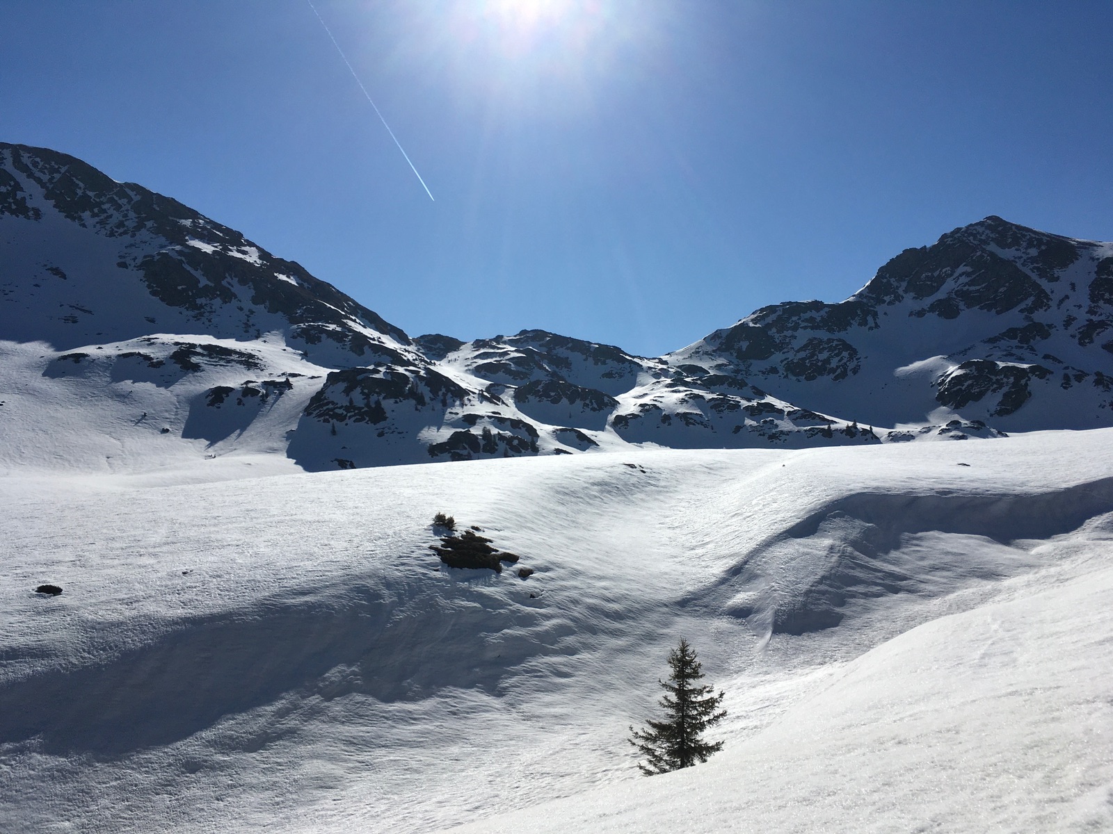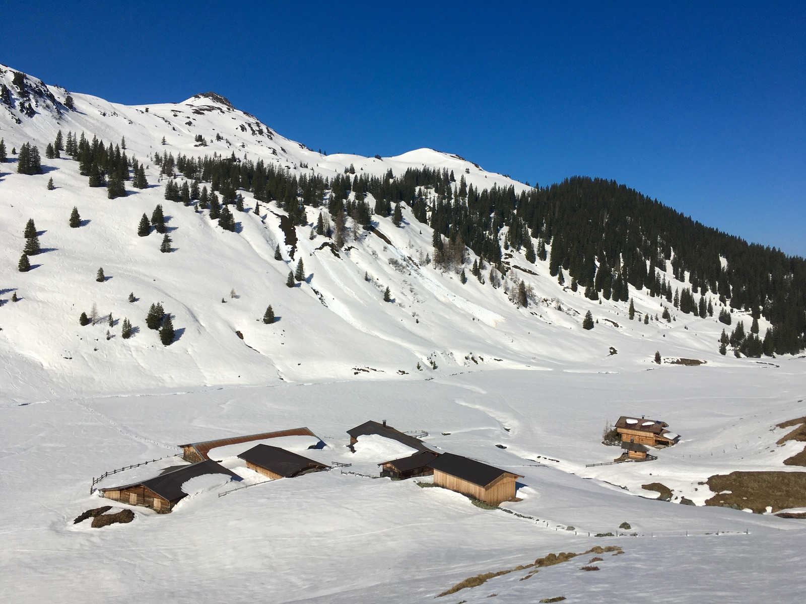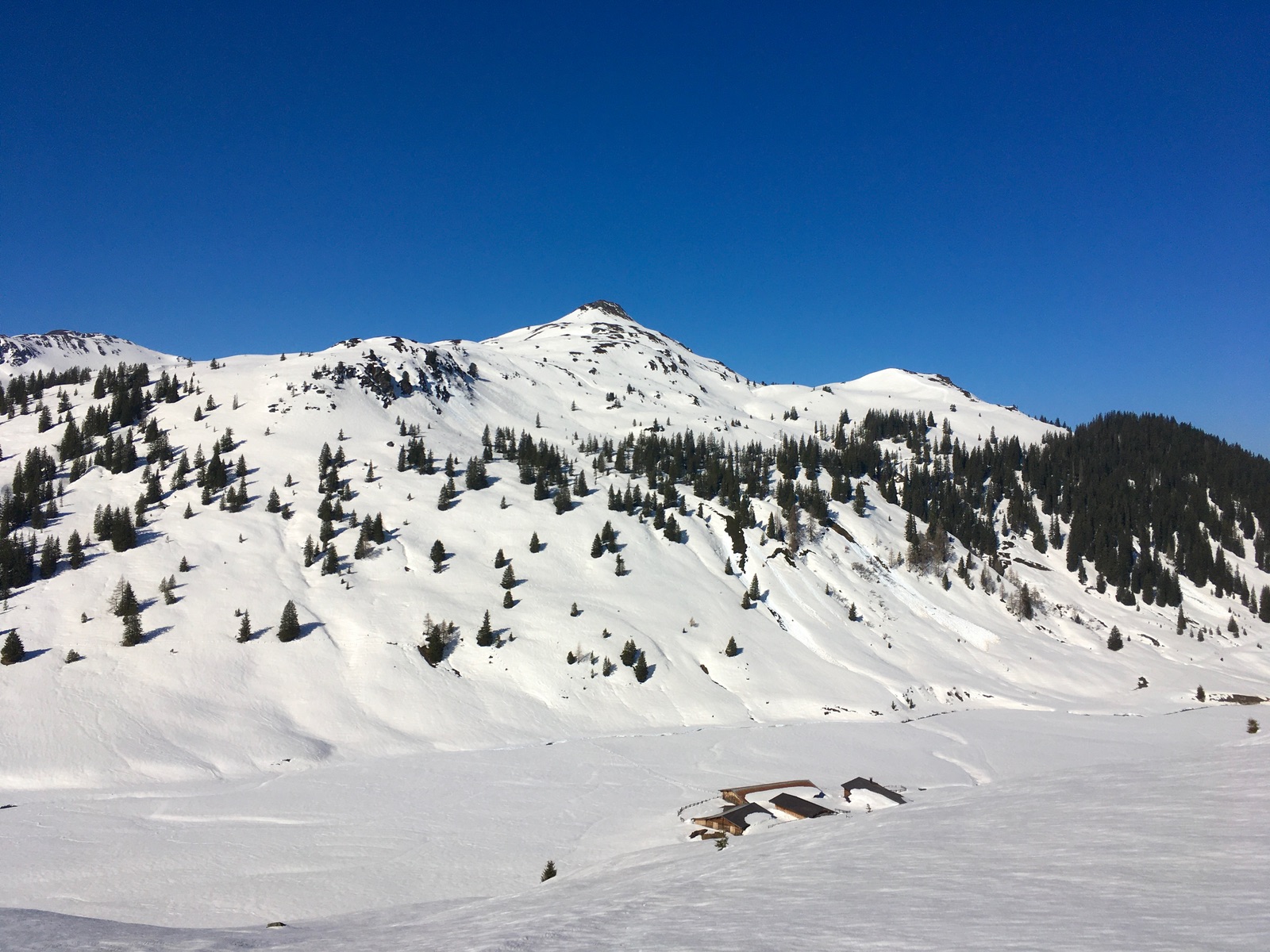 Am Ausgangspunkt sieht es noch nicht nach Skitour aus, aber nach 20 min zu Fuß auf der sonnigen Forststraße beginnt der Schnee. In der Abfahrt habe ich den schaftseitigen Wanderweg auf der anderen Talseite genommen, da ging es (noch) ohne Ski tragen, nur mal einige Meter aper. Am Ende vom Fahrweg geht es recht bald die steile Waldstufe hoch - diese ist überwiegend aper (runter zu habe ich mich an einigen Stellen noch durchmogeln können), ohnehin aber wohl meistens eher mäßig. Oberhalb, knapp unterhalb der 1.500er-Marke, beginnt dann das wirklich schöne Skigelände und auch eine gute Schneelage und bei der Hochfläche der Sintersbach Grund-Alm wird es wirklich landschaftlich grandios. Die Sintersbachscharte, die man mit Skiern ansteuert, ist dann in Aufstiegsrichtung die Einsattelung ganz links. Die letzten Meter ab dem Skidepot zum Gipfelkreuz sind zur Zeit aper und problemlos. Steigeisen braucht es daher nicht, Harscheisen sollte man mitnehmen, waren heute aber nicht nötig.