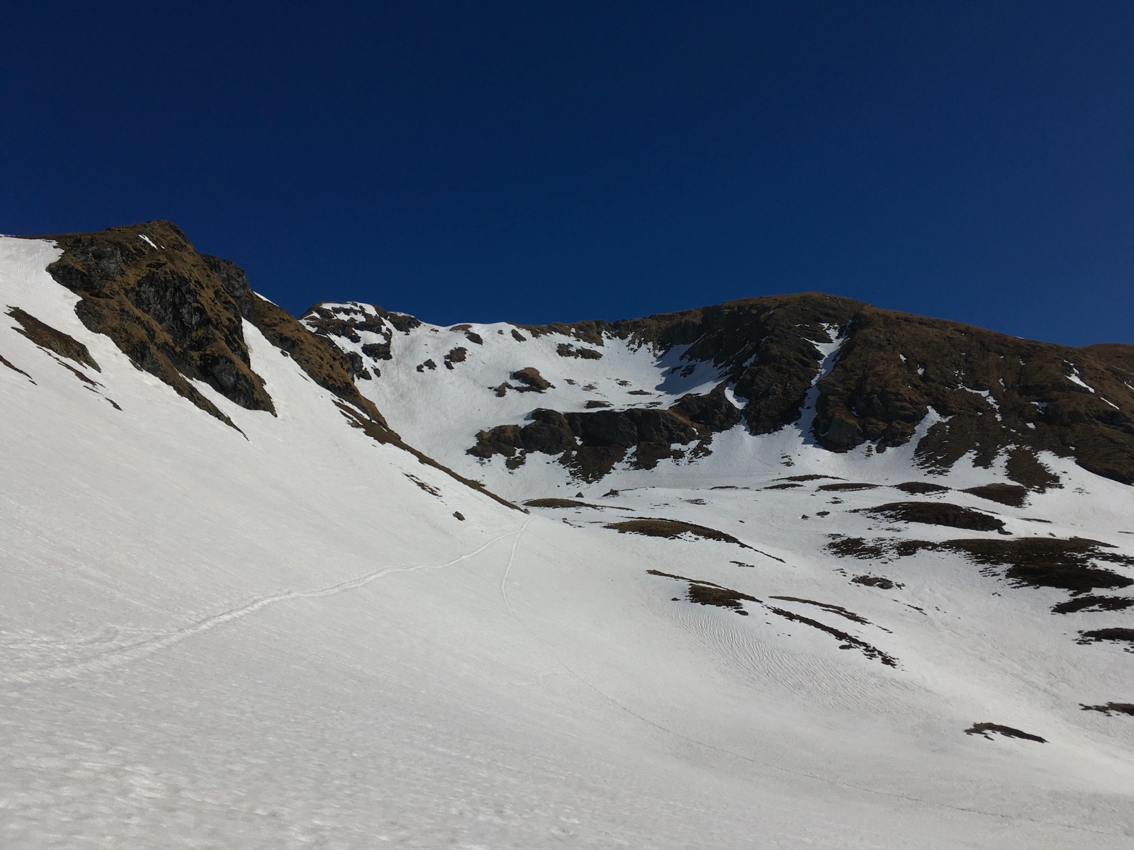 Die Abfahrt um 12.15 Uhr (Sommerzeit) war recht gut, meistens gab es Firn trotz der verschiedenen Expositionen. Der Gipfelhang ist allerdings etwas unruhig durch "Wellen" im Schnee (Ablaufrinnen von Regen oder Büßerschnee?). Die Gruppe vor mir ist um 11 Uhr abgefahren, da war es oben aber noch eher hart. Man kann sich die Exposition allerdings etwas aussuchen.
