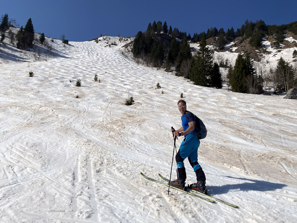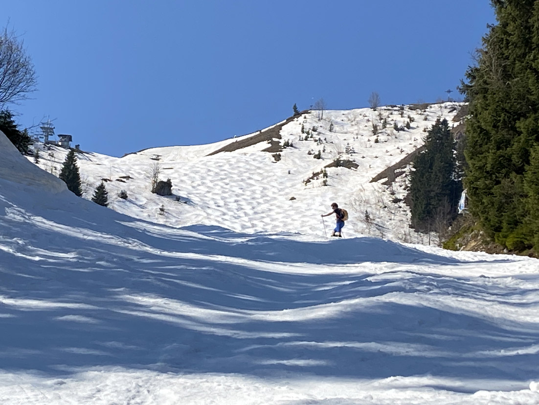 Am Streidlhang kann man direkt losmarschieren und kommt ohne Schneeunterbrechung bis zur Bergstation (Abfahrt ebenso). Bin zunächst zur Kotalm abgefahren (schöner Firn), nochmals aufgestiegen zum nur ganz oben aperen Gipfel. Abfahrt über Garlandseite ging super, Sulz und Firn im Mix, toll zu fahren.