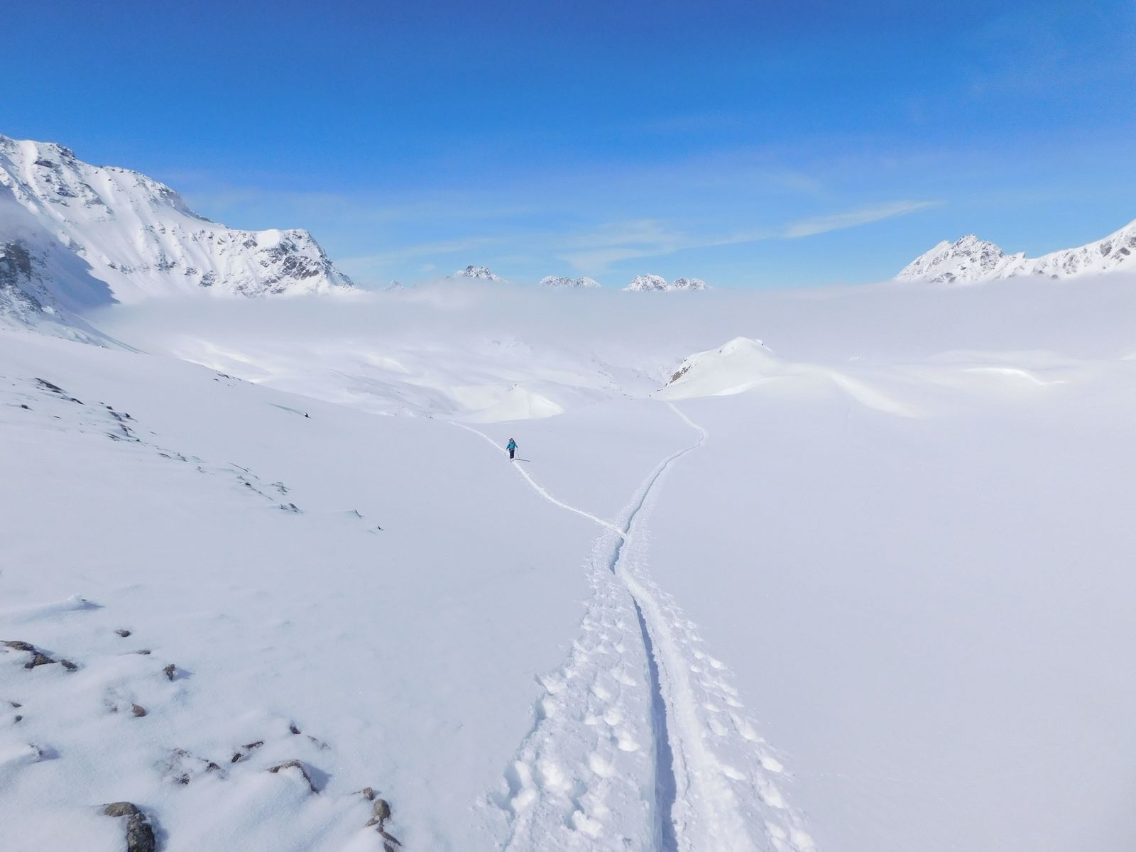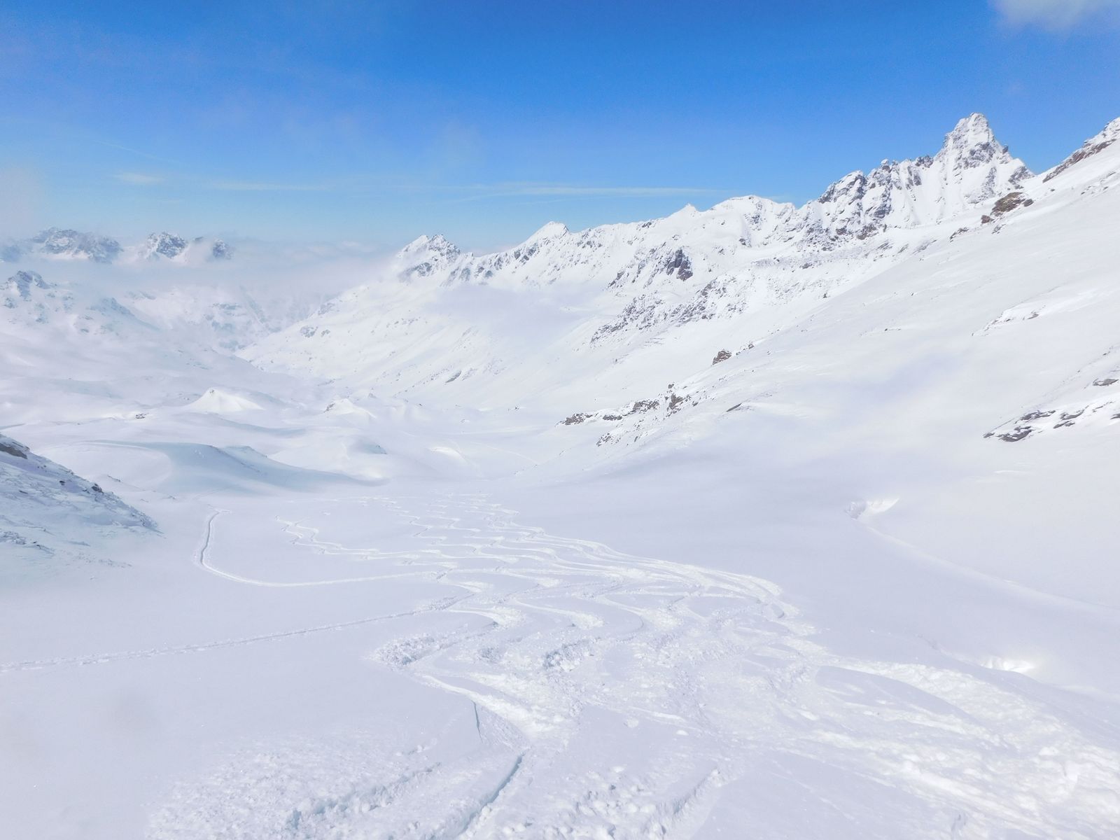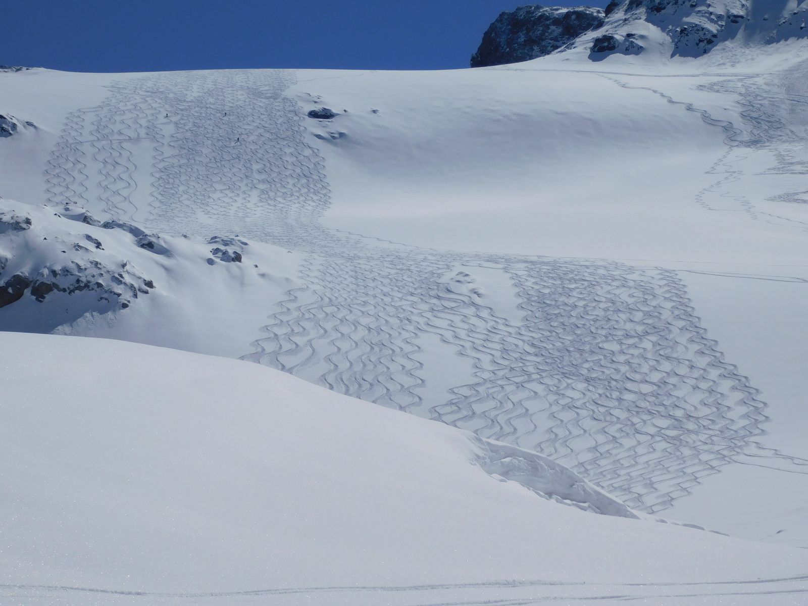 Es wurde dann schon ab Sonntag Vormittag ziemlich gut und am Montag spitzenmäßig! Oberhalb von ca. 2400 gab es noch 20-30 cm Pulverschnee vom letzten Niederschlag (Do-Sa), der auch am Montag noch super zu fahren war! Auf dem Gletscher zur Jamspitze war am Montag die Konsistenz noch pulvriger als beim Grenzeckkopf am Sonntag.