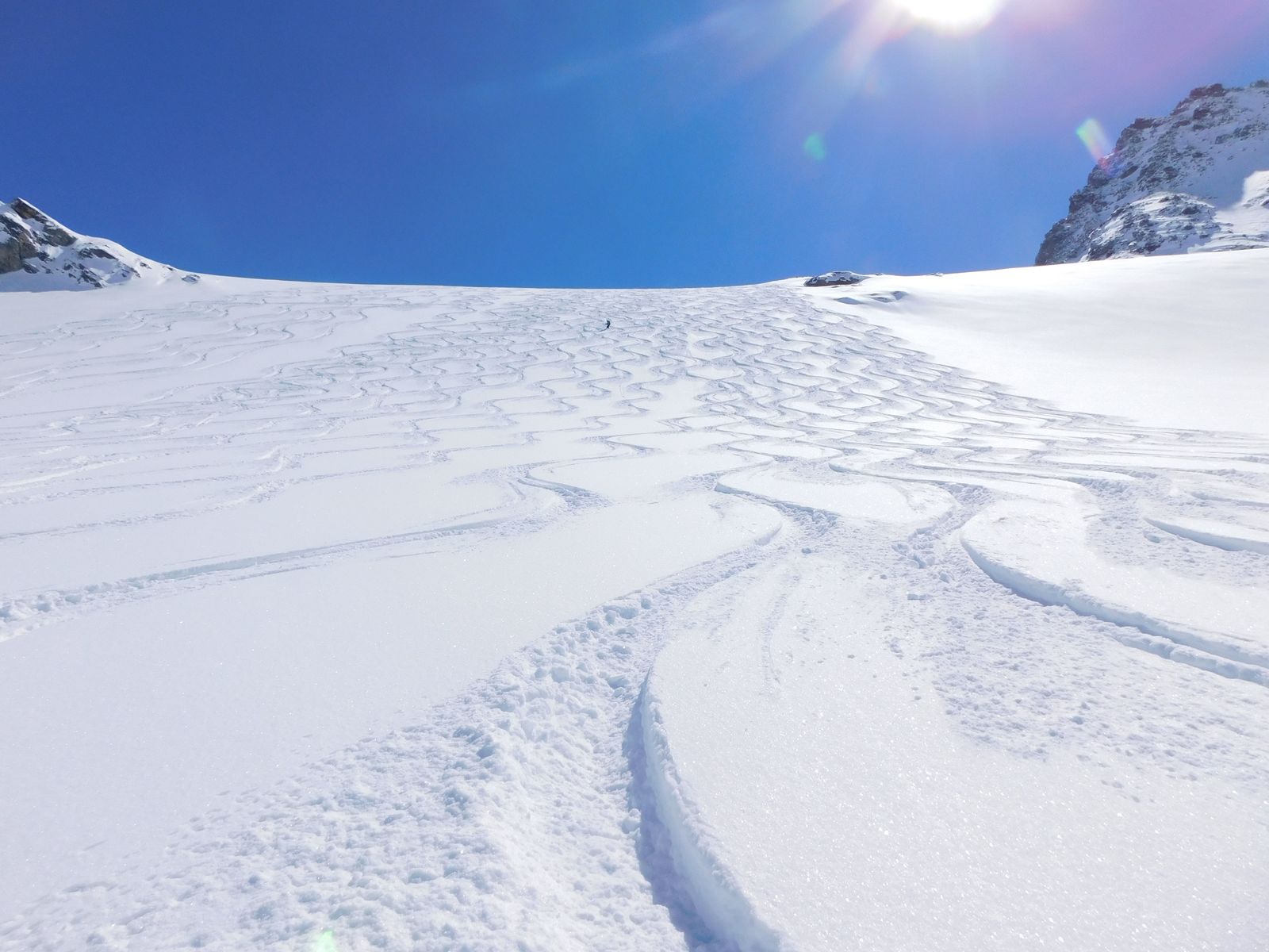 Wir haben auf ca 3000m Skidepot gemacht, da der Rest sich nicht mehr wirklich mit Ski gelohnt hat. Von hier waren die Abfahrts-Bedingungen sehr gut: