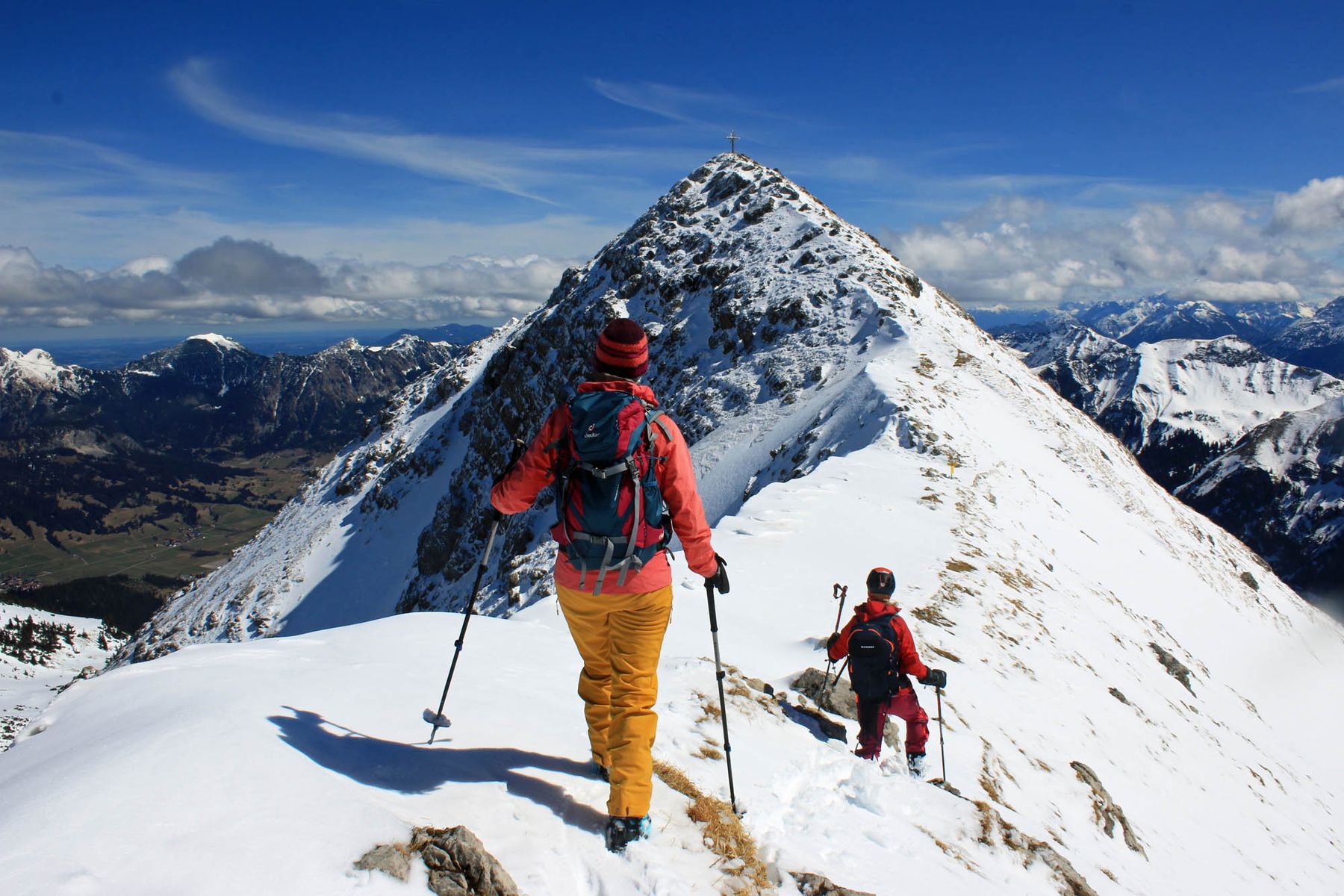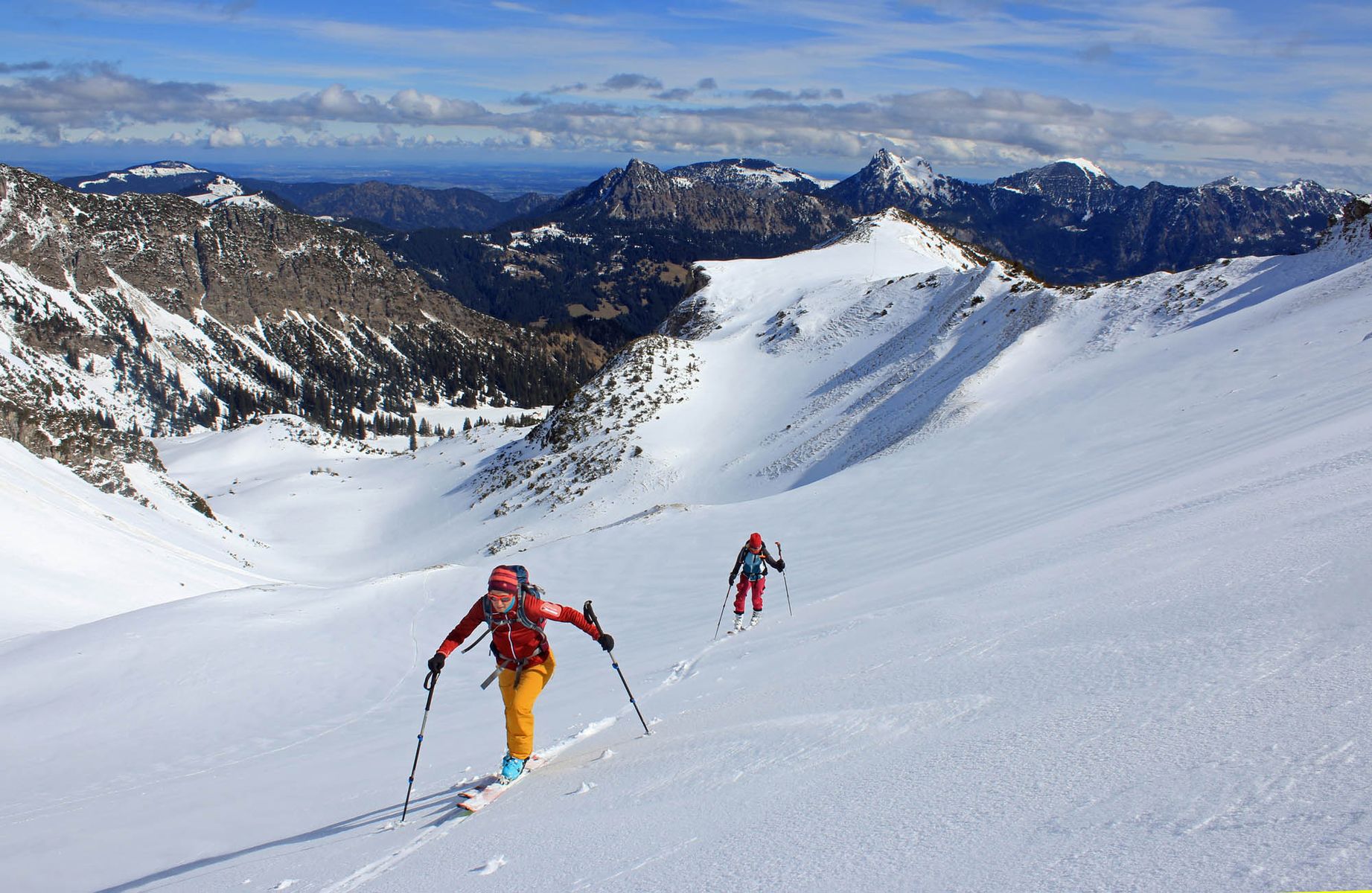 Die pitschnassen Felle führten im trockenen Schnee (wie das halt so ist) zu dermaßenem Aufstollen, dass wir im oberen teil die Ski auf den Rucksack schnallten.
