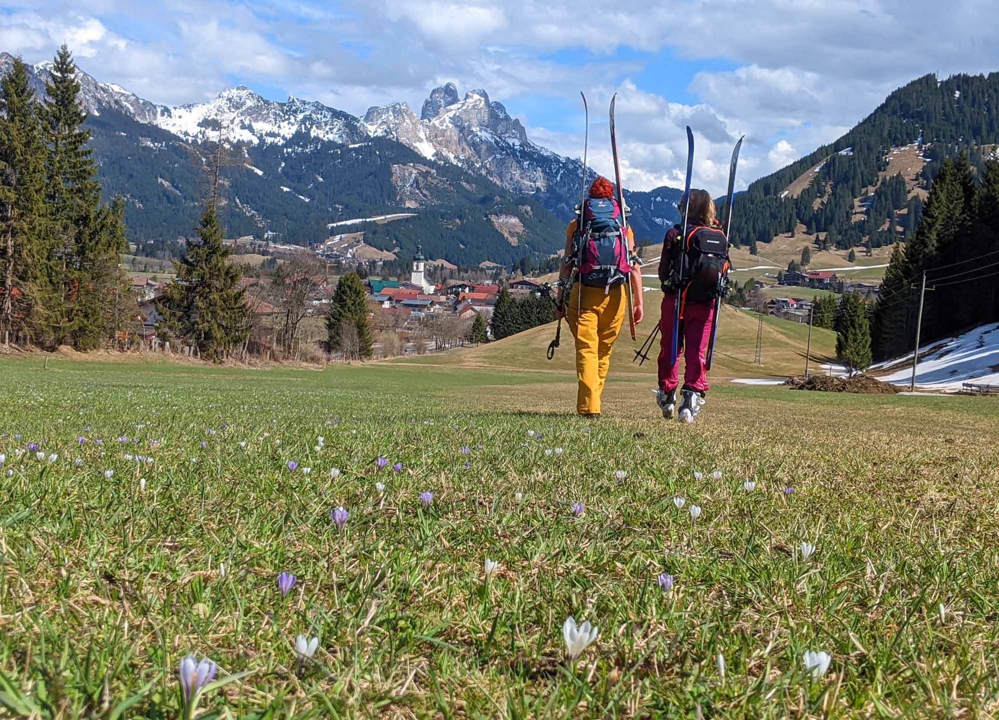 Unten im Tal grüßten dann die Krokusse. Apropos: Man muss derzeit die Ski ca. 20 Minuten tragen.