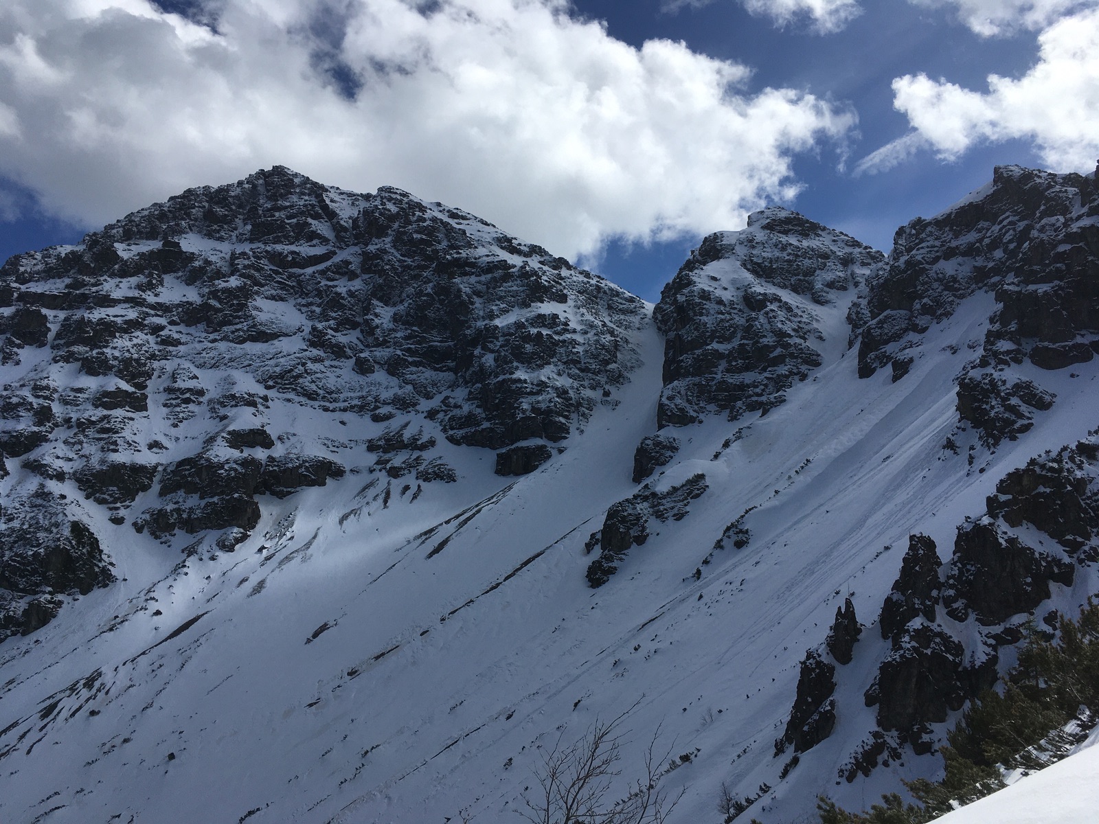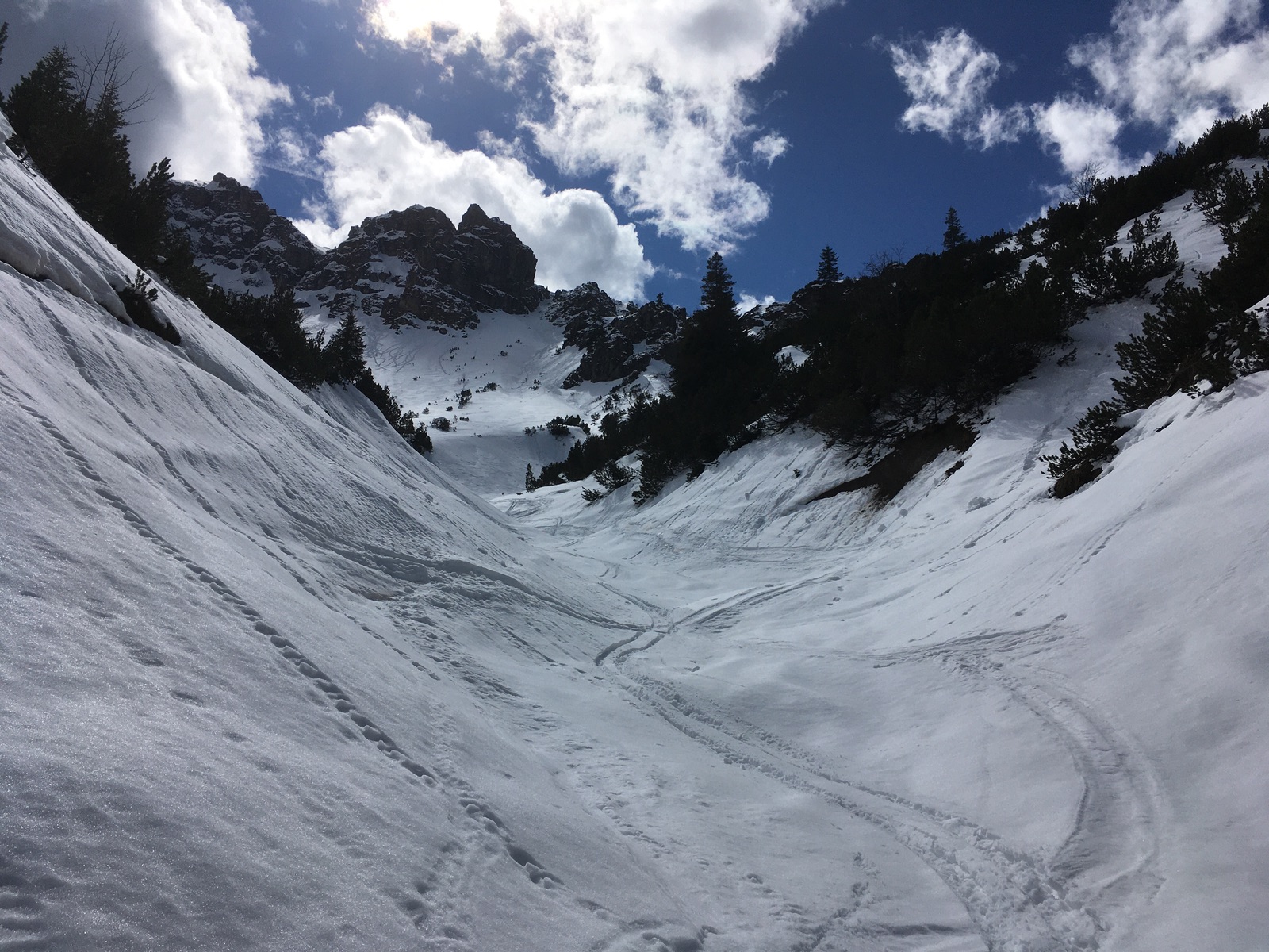 Nach dem ersten Hang liegt dann auf der Piste durchgehend Schnee, üppig ist die Schneelage aber nicht mehr. Auf dem Forstweg ab der Piste Richtung Kar gab es bereits zwei kurze Stellen mit wenig Schnee, heute ging es gerade noch so durchgehend mit Skiern in Aufstieg und Abfahrt. Das Bachbett hoch in das eigentlich Kar (Abzweig vom Forst-/Ziehweg) ist der allgemeinen Schneelage in diesem Winter folgend auch nicht üppig eingeschneit, geht aber auch noch - allerdings hatte ich hier mit den neuen Skiern leider zwei Mal Feindberührung in der Abfahrt. Im Kar selber ist die Schneelage noch einigermaßen, einige Rippen sind aber ausgeapert bzw. nur dünn mit Neuschnee bedeckt.