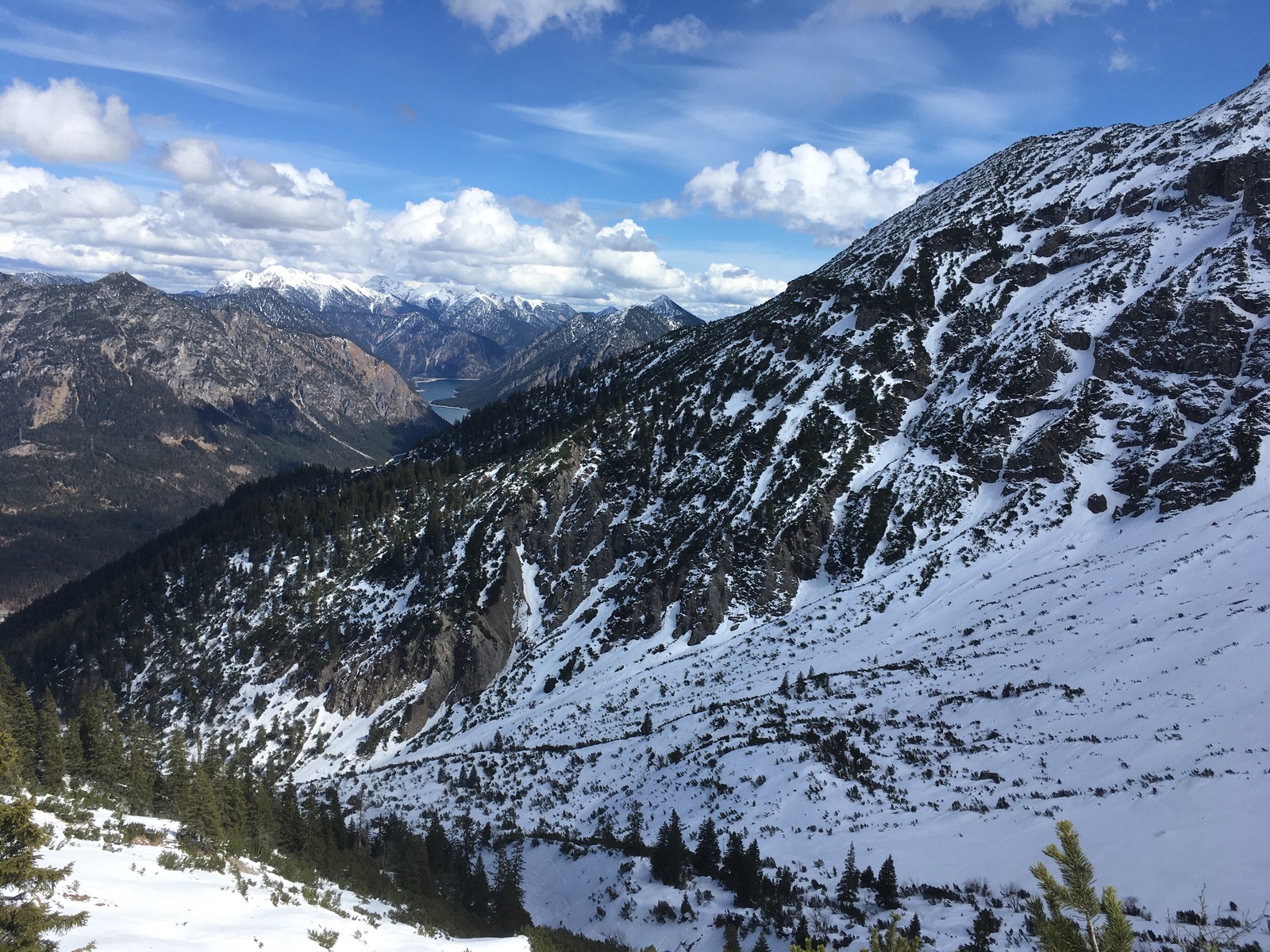 Für den Aufstieg habe ich heute allerdings mal eine Alternativroute ausprobiert: Nicht direkt ins Kar (da wo es ins Bachbett geht), sondern weiter auf dem Forstweg und dann auf dem Sommersteig hoch zur Rauch-Alpe. Kann ich aber für den Winter nicht empfehlen, man quert wirklich sehr steile, teilweise sogar etwas ausgesetzte Hänge und Lawinen drohen auch.