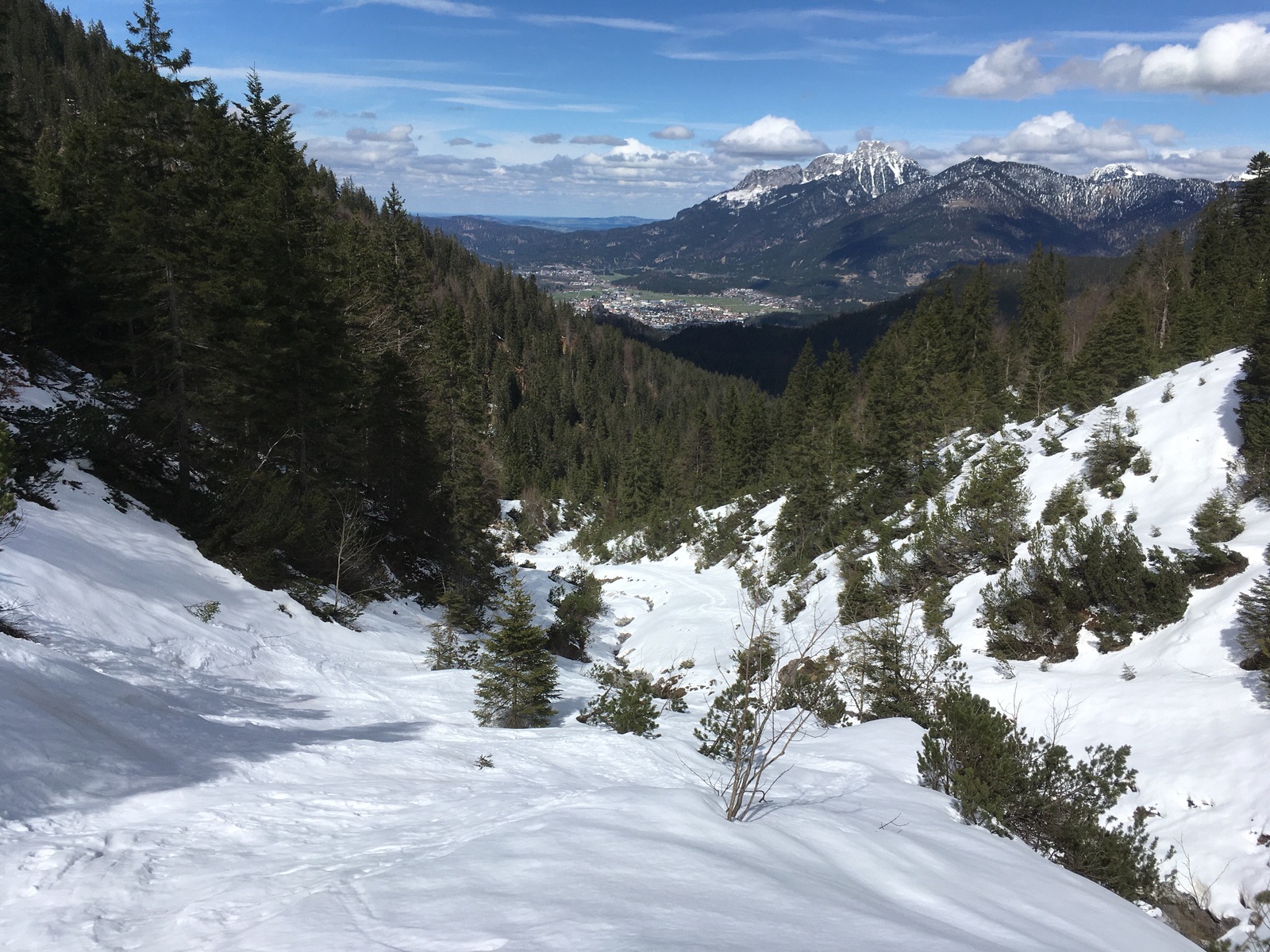 Heute ging es trotz des Regens gestern und der massiven Erwärmung ins Thanellerkar - das gute Wetter sollte ausgenutzt werden. Die ersten Meter ist die Piste aper, wenn man von der Talstation startet. Wer mit dem Zug anreist wie ich, nimmt normalerweise einen der Forstweg ausgehend vom ehemaligen Schlepplift oberhalb des Bahnhofs - der untere Forstweg ist aber überwiegend aper, man kann also auch nicht mit Skiern aus dem (geschlossenen) Skigebiet in den Ort zurückfahren.