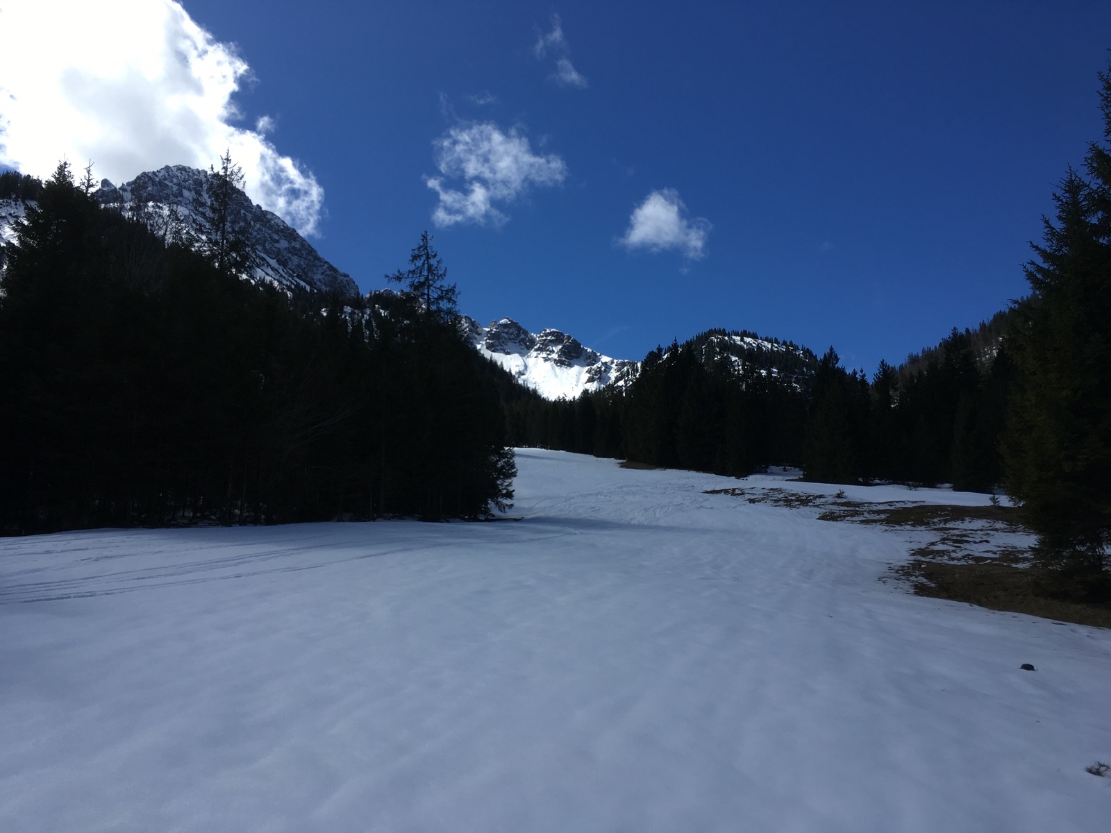 Heute ging es trotz des Regens gestern und der massiven Erwärmung ins Thanellerkar - das gute Wetter sollte ausgenutzt werden. Die ersten Meter ist die Piste aper, wenn man von der Talstation startet. Wer mit dem Zug anreist wie ich, nimmt normalerweise einen der Forstweg ausgehend vom ehemaligen Schlepplift oberhalb des Bahnhofs - der untere Forstweg ist aber überwiegend aper, man kann also auch nicht mit Skiern aus dem (geschlossenen) Skigebiet in den Ort zurückfahren.
