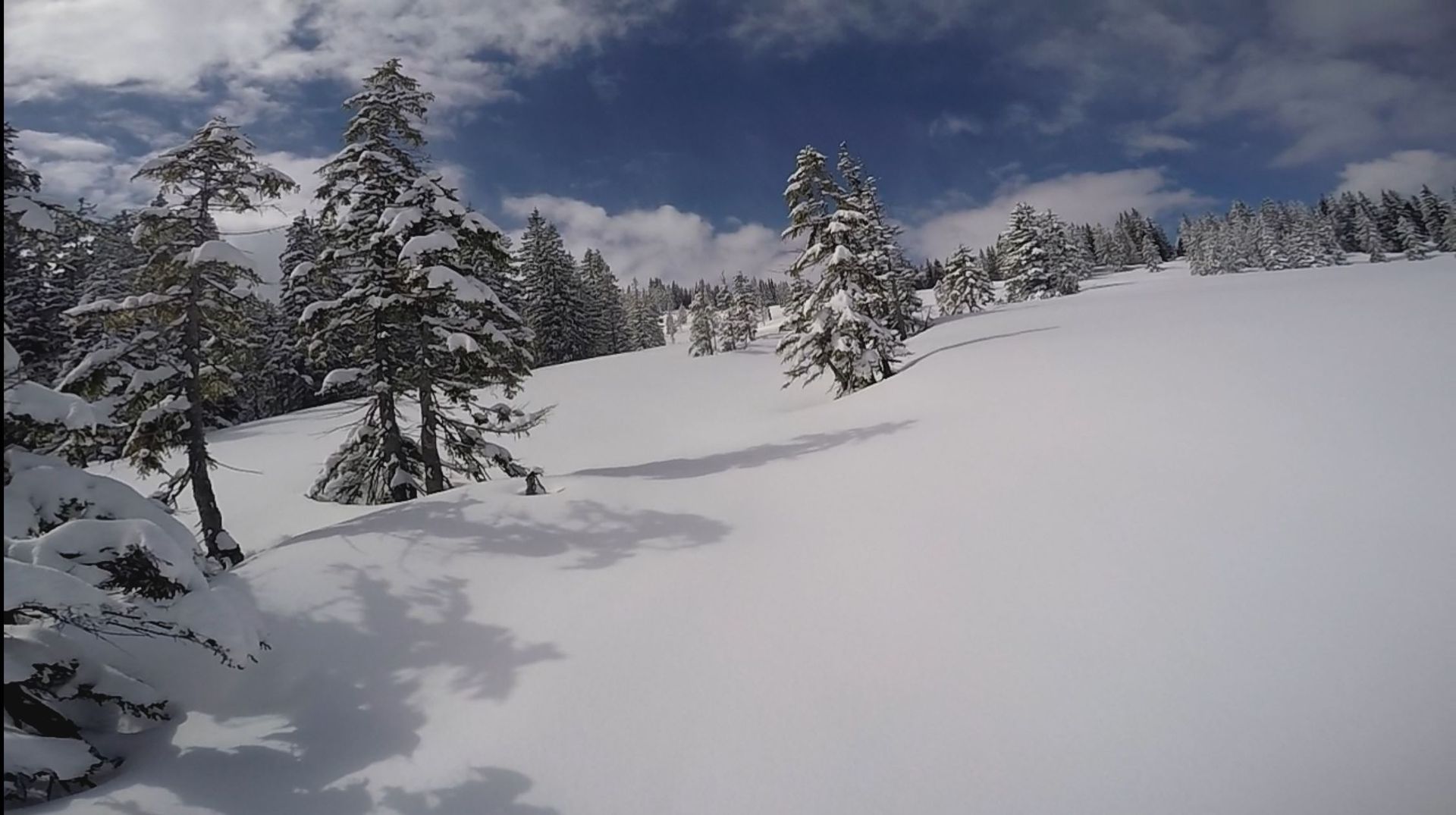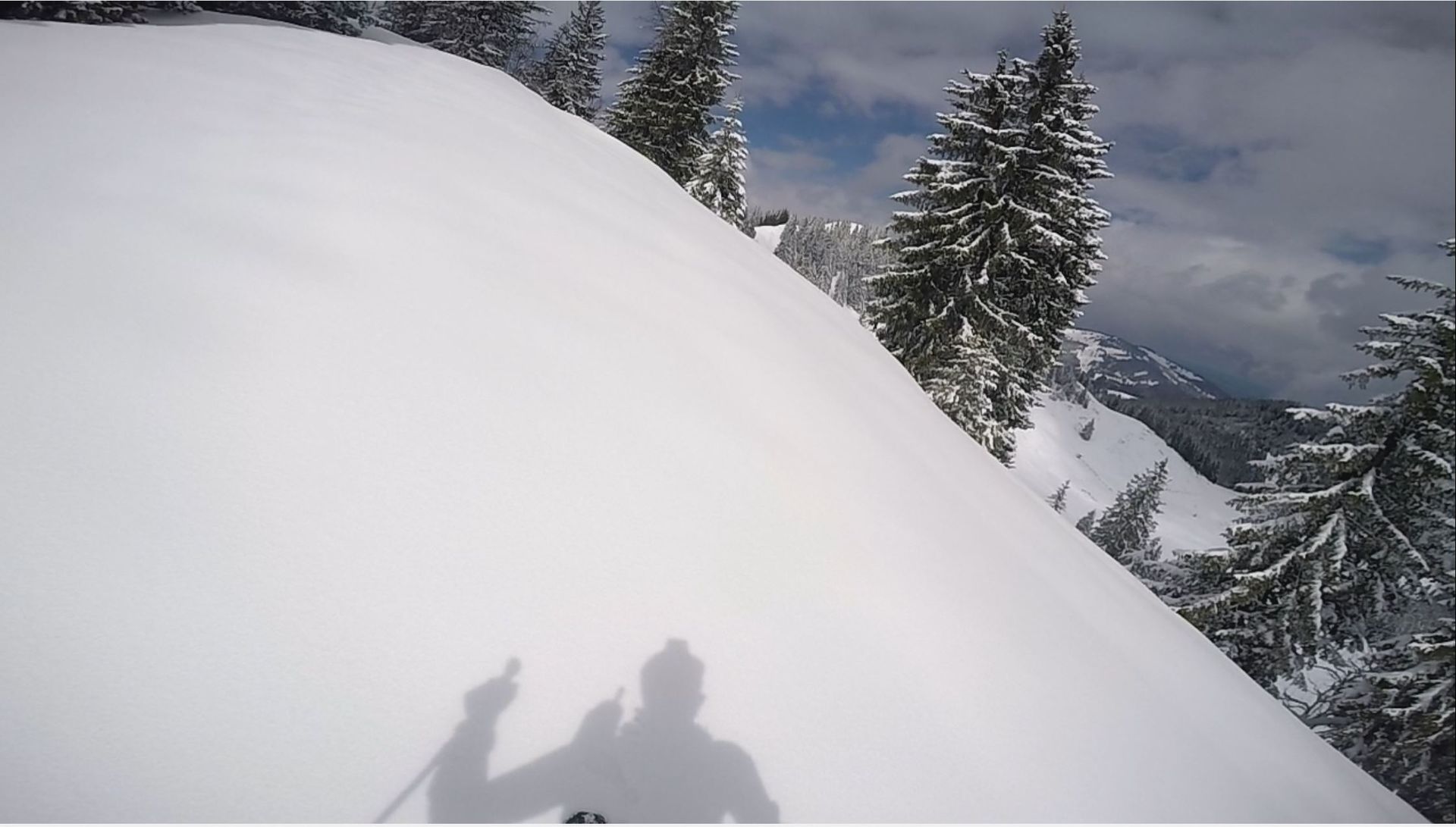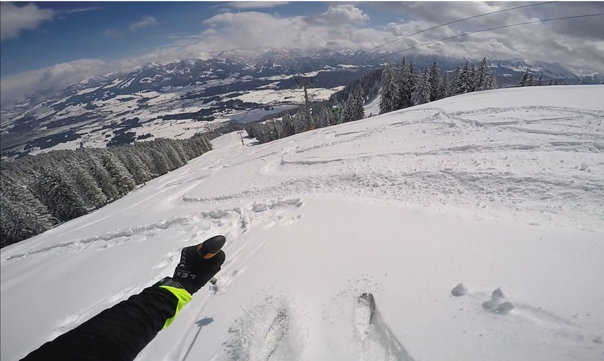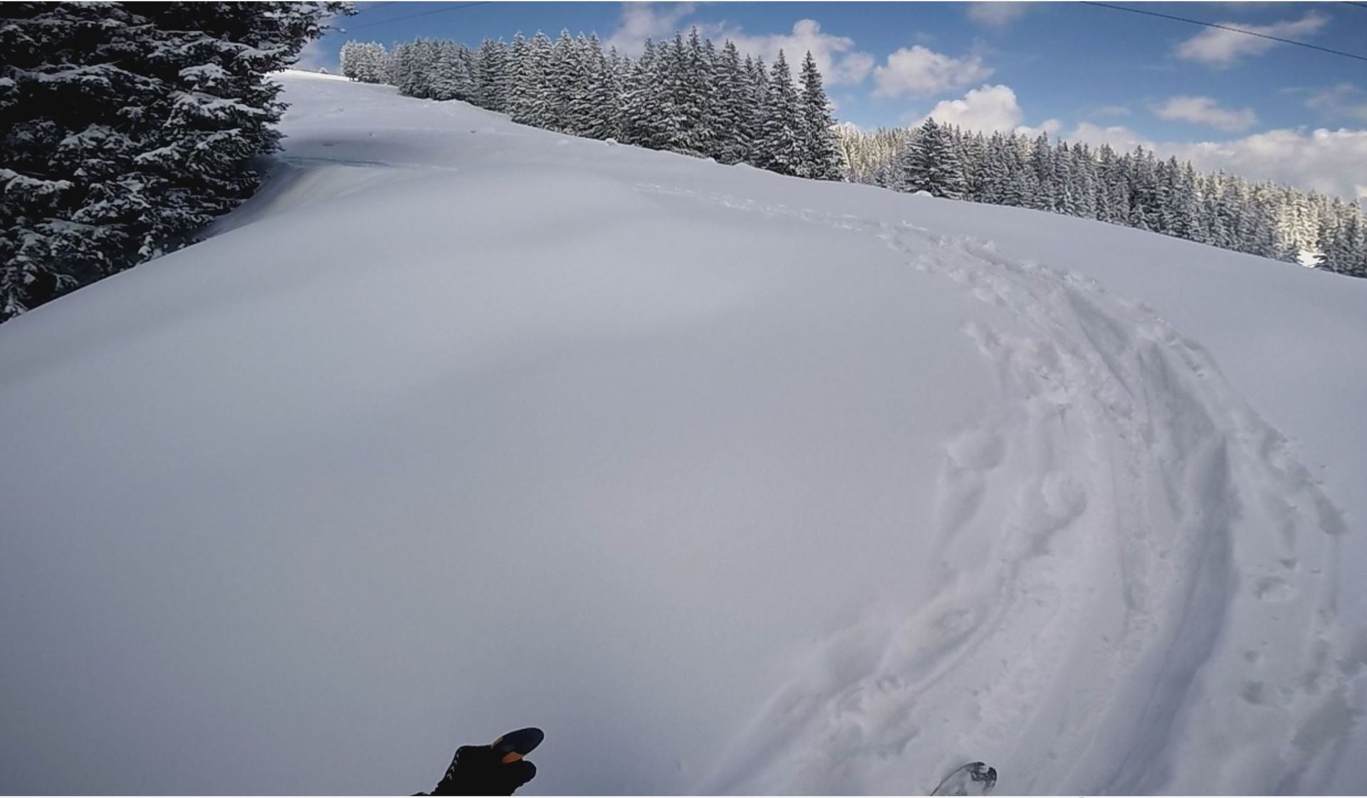 Ich habe mich aufwärts schon an den frischen Tiefschneeschwüngen orientiert, damit ich später möglichst wenig Steinkontakt habe: hat geklappt.
