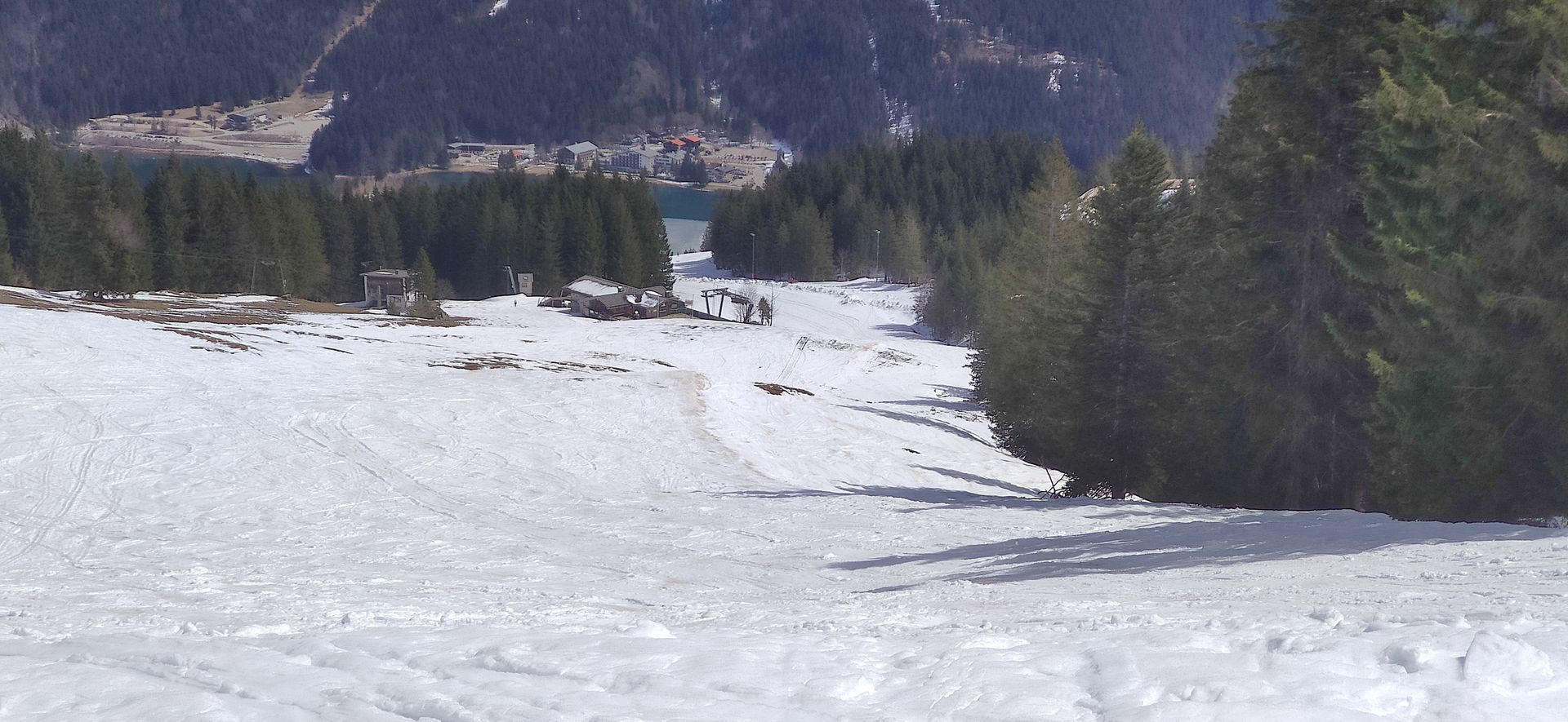 Bei der Abfahrt ab 12 Uhr war auf den ersten 60 Hm der Schnee teilweise unregelmäßig stumpf, dann zunehmend genussvoller, da er firnartig, grobkörnig durch Frost und Wärme in 2 Tagen schon umkristallisiert war. Allerdings war das Schneeband im mittlerem Teil an zwei Stellen so schmal, dass akrobatische Künste erforderlich wären. Auf nassem Gras kamen wir aber auch mit Ski über die Lücken von ca. 15 m .