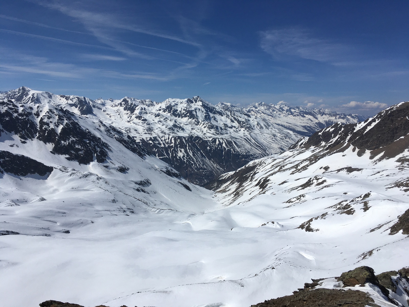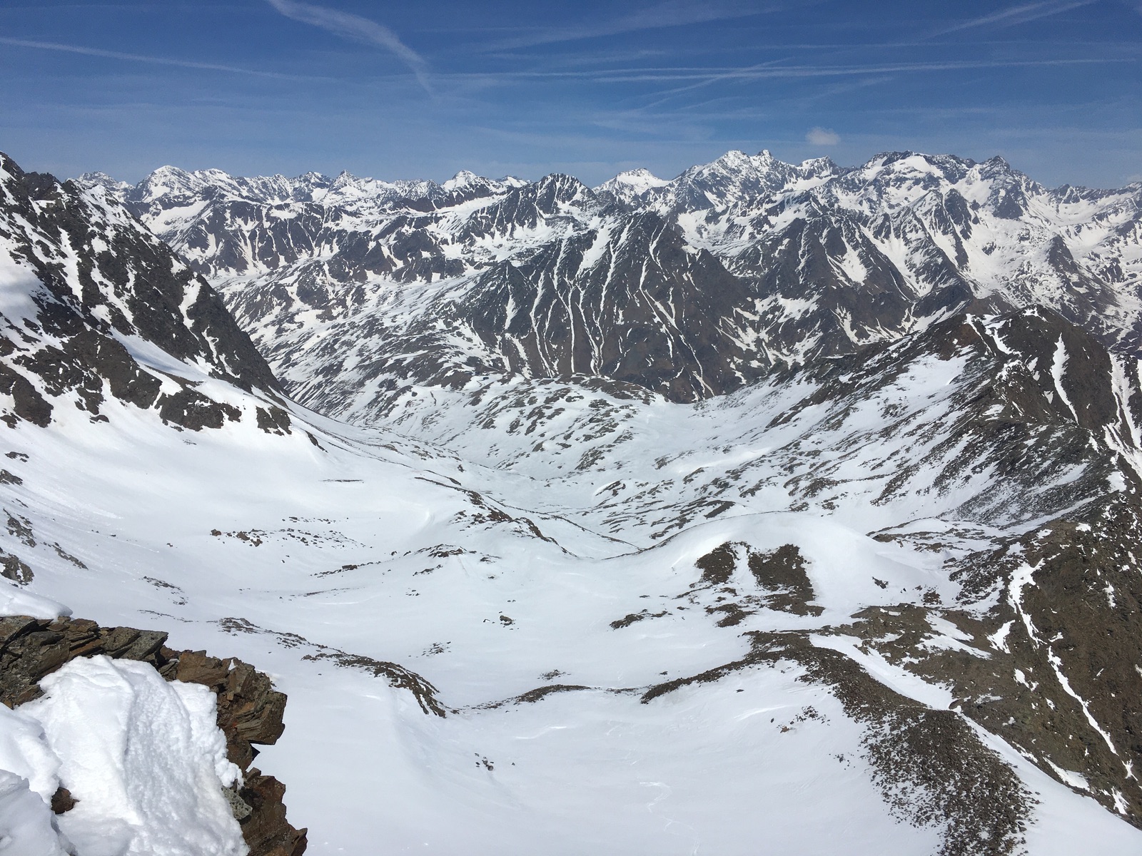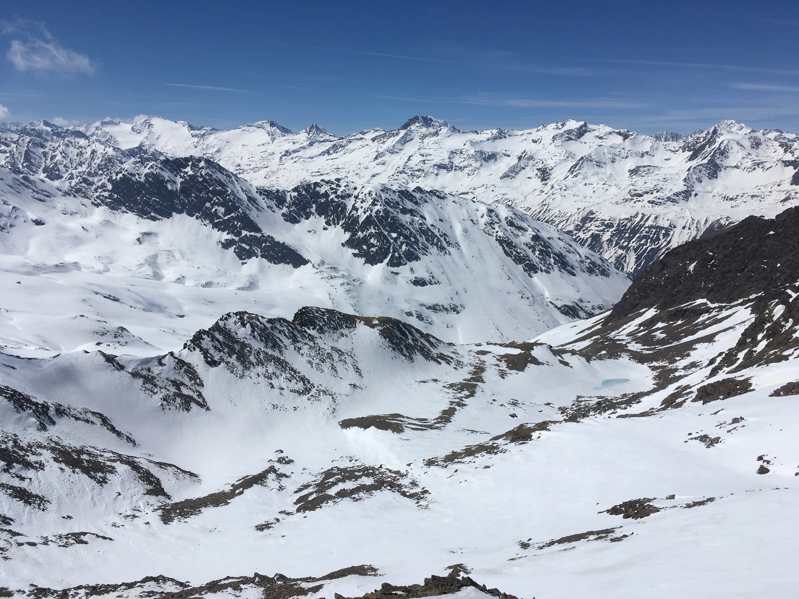Blick von der Äußeren Schwenzerspitze hinab zum Timmelsjoch - von dort kommt die Mai-/Juni-Skiroute hoch: