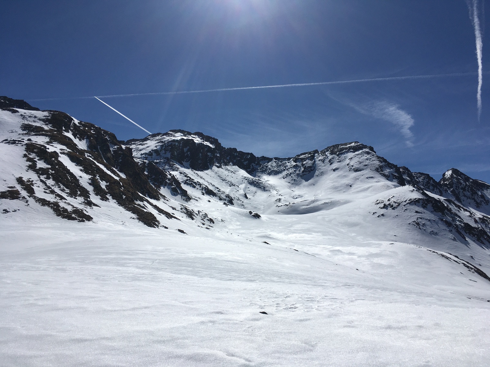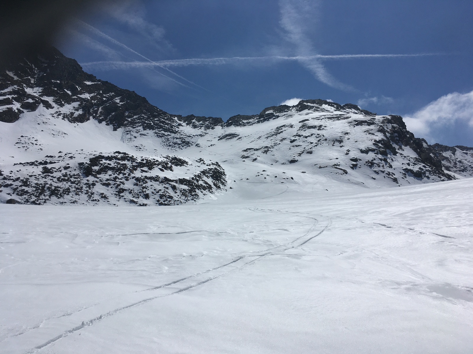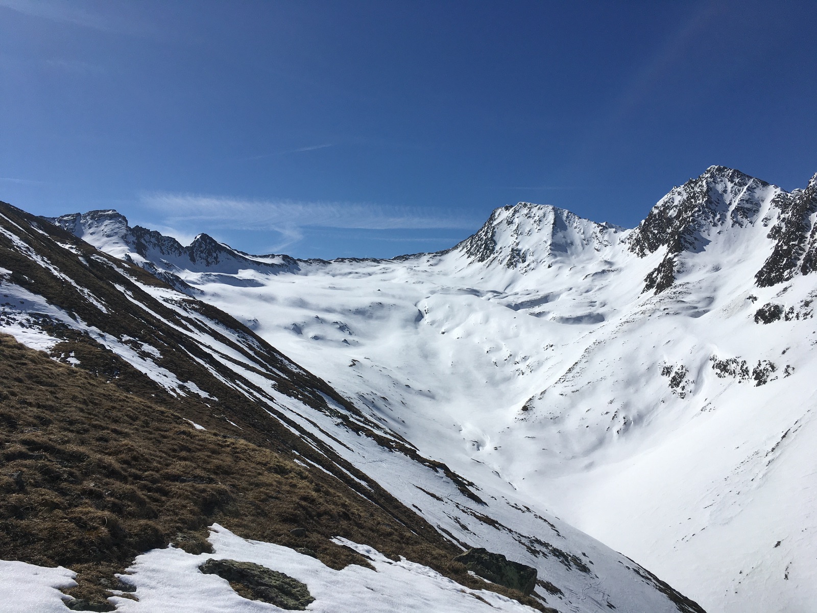 Blick von der Äußeren Schwenzerspitze hinab zum Timmelsjoch - von dort kommt die Mai-/Juni-Skiroute hoch: