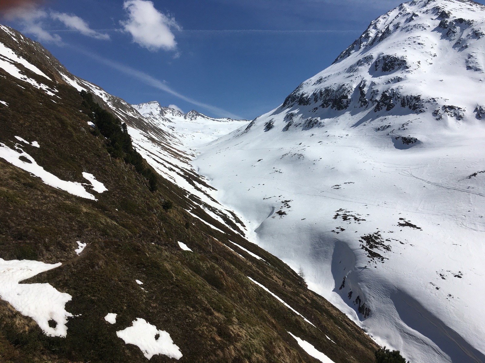 Entgegen dem AV-Wetterbericht war es am Morgen durchgefroren, ich entschied mich bald, die Harscheisen anzulegen und habe diese schließlich bis zum ersten Gipfel auch drangelassen (das hätte man aber nicht gebraucht). Von Hochgurgl geht es zunächst kurz die Piste hoch, dann zum langen Schlepplift, der seit geraumer Zeit außer Betrieb ist - also erfolgen hier auch keine Pistenpräparierungsarbeiten mehr. Auf ca. 2.580 m geht es dann voll ins freie Gelände, man muss die steilen Südhänge oberhalb des Königstales queren. Teilweise waren diese schon ausgeapert, also etwas mühselig (Skier an, Skier ab). Ist die Querung geschafft, wird das Gelände wesentlich angenehmer. Ich bin zunächst zur Vorderen Schwenzerspitze gegangen, bis wenige Meter unter den Gipfel geht es mit Skiern. Nordseitig auf ca. 2.800 m im flachen Gelände mehrfach die im LLB angesprochenen Setzungsgeräusche. Abfahrt nordseitig leider nicht so berauschend, Pulver hat es keinen mehr, Firn aber auch noch nicht. Anschließend ging es noch auf die Äußere Schwenzerspitze - von der Hangausrichtung her sollte man die als erstes machen, aber der Hang hatte so schneearm ausgesehen, dass ich sie eigentlich auslassen wollte. Es gibt aber doch noch ein Schneeband, 1x ca. 30 Hm Skier tragen. Abfahrt um kurz nach 13 Uhr bot im steilen Südhang Firn, es wäre aber zeitlich früher besser gewesen. Zuletzt noch mit einigen Querungen in der Abfahrt auf die Hintere Schwenzerspitze - hier geht es bis ca. 25 m unter den Gipfel mit Skiern. Dann zur Zeit einfaches Hochsteigen. Bei der Abfahrt am Nachmittag war der Schnee dann leider mäßig, da halfen nur große Radien und ein bisschen Kraft. Allerdings dürfte der Neuschnee hier auch noch nicht voll umgewandelt gewesen sein, also vermutlich ohnehin kein guter Firn. Beim Bachübergang P. 2236 m geht es dann den Sommerweg nach Hochgurgl, wobei man sinnvollerweise vor einer Bachrunse steil hoch steigt Richtung Liftstütze der Verbindungsbahn Obergurgl - Hochgurgl, um wieder zur Piste zu kommen. Oder man nimmt halt von vornherein die Normalroute ...