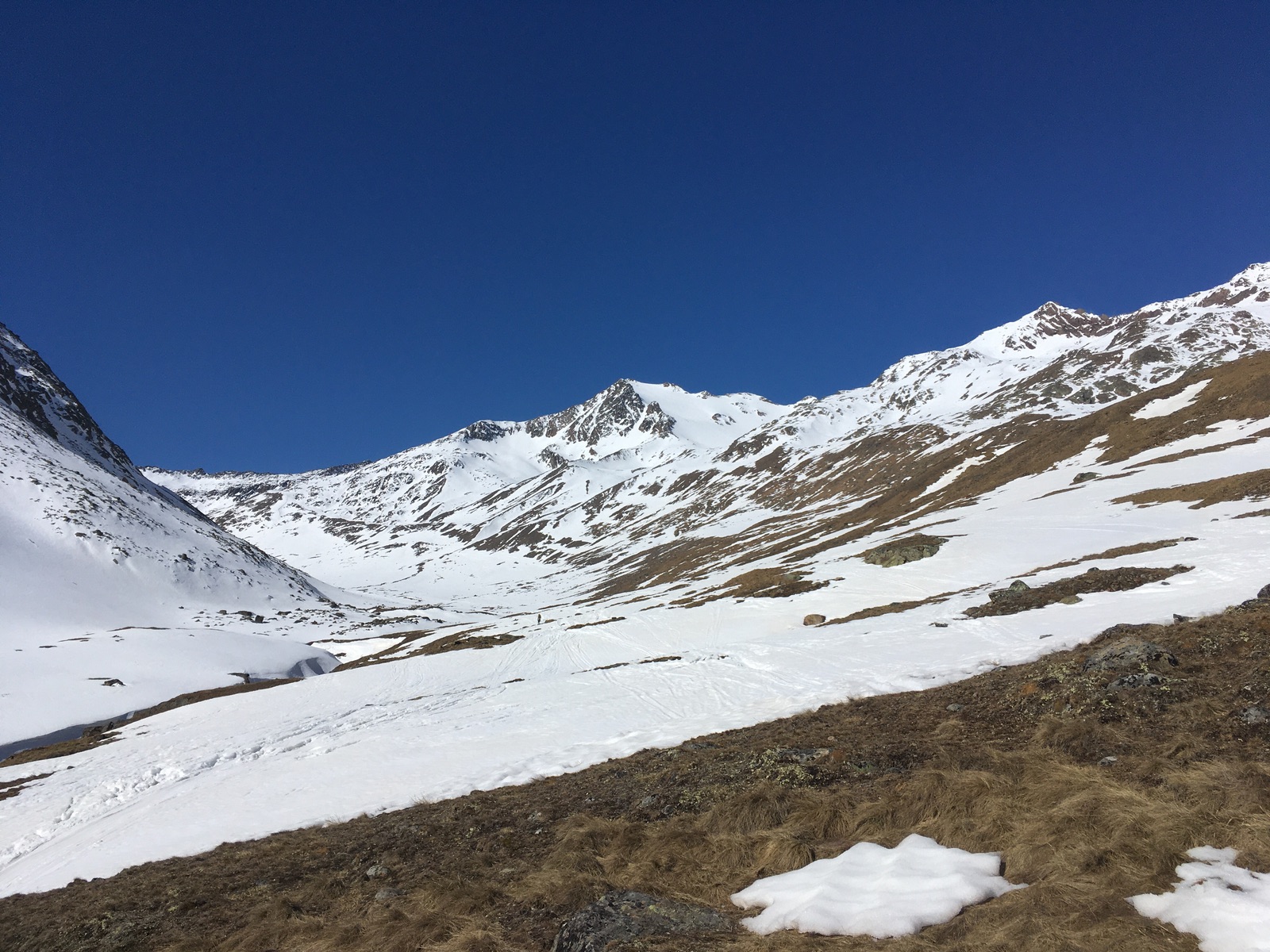 Auch hinter der Martin-Busch-Hütte liegt erschreckend wenig Schnee - so schneearm habe ich das Niedertal zur Skitourenzeit noch nie gesehen. Am Vormittag hat der Harschdeckel nach einer nur teilweise klaren Nacht noch recht gut getragen, gegen Mittag durfte man in der Abfahrt aber schon die eine oder andere Überraschung erleben. Insgesamt sind die Schneeverhältnisse "abwechslungsreich". Insgesamt war die Abfahrt dann aber besser als gedacht, insbesondere das Niedertal auswärts lief ziemlich gut (z.T. nur skibreiter Schneestreifen). Man sollte halt mehr Zeit als üblich einplanen, durch das Ab- und Anschnallen geht es rauf wie runter nicht so geschwind wie sonst.