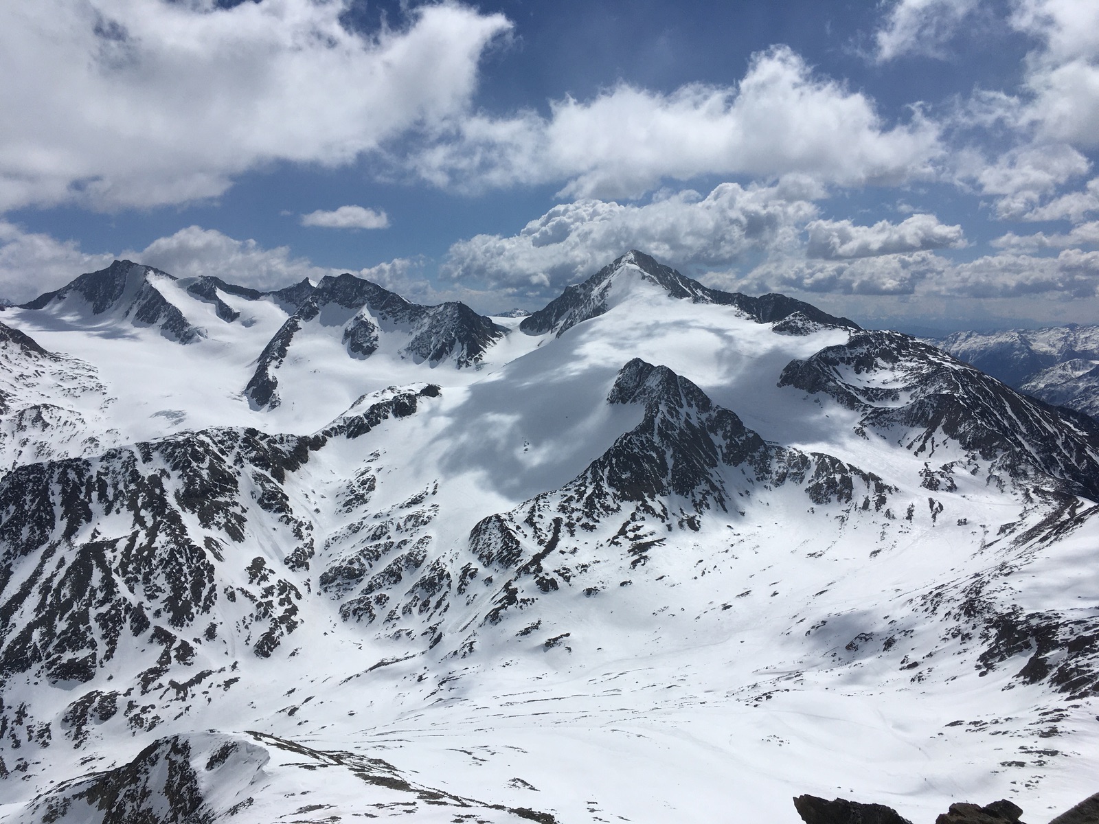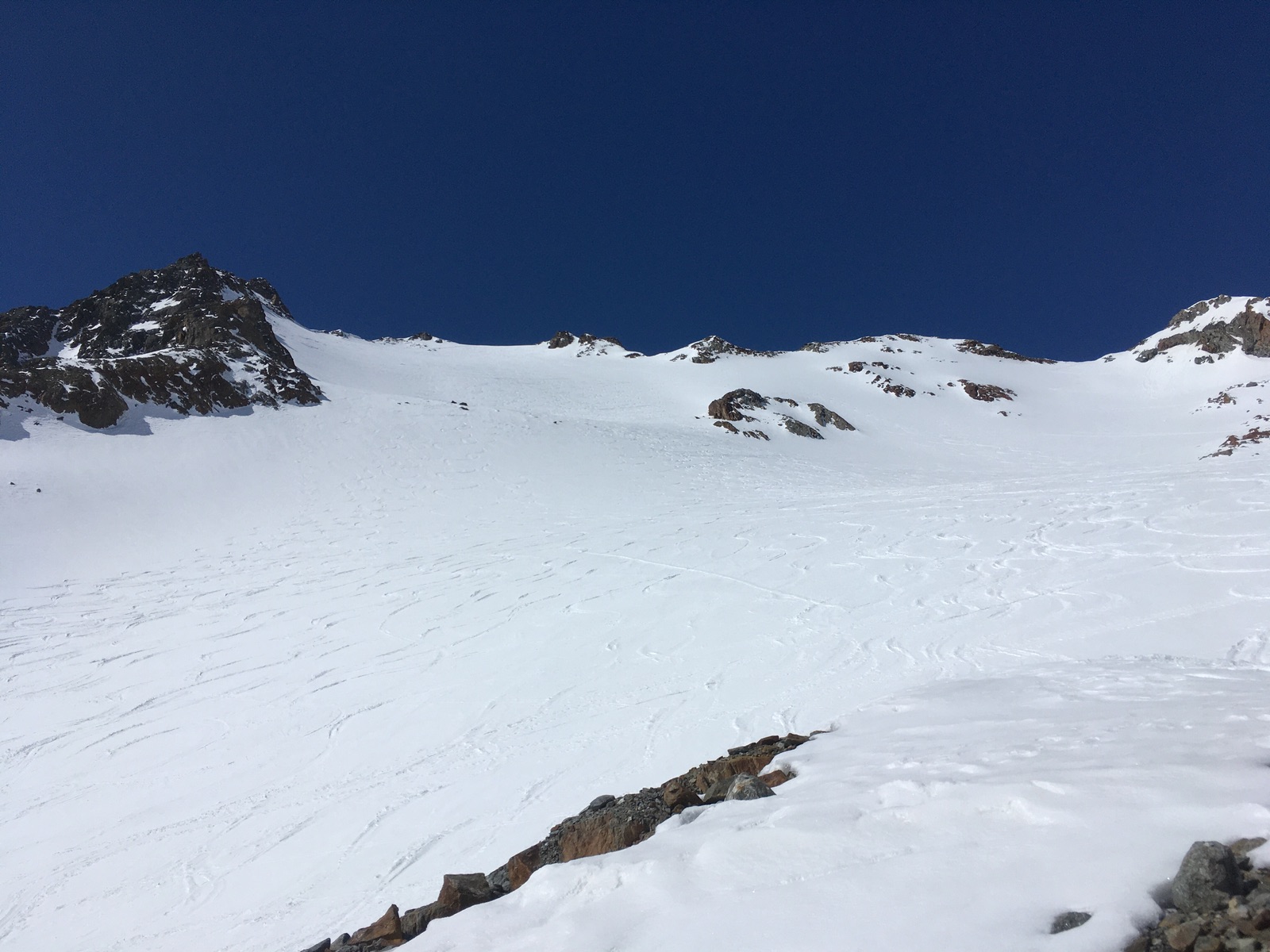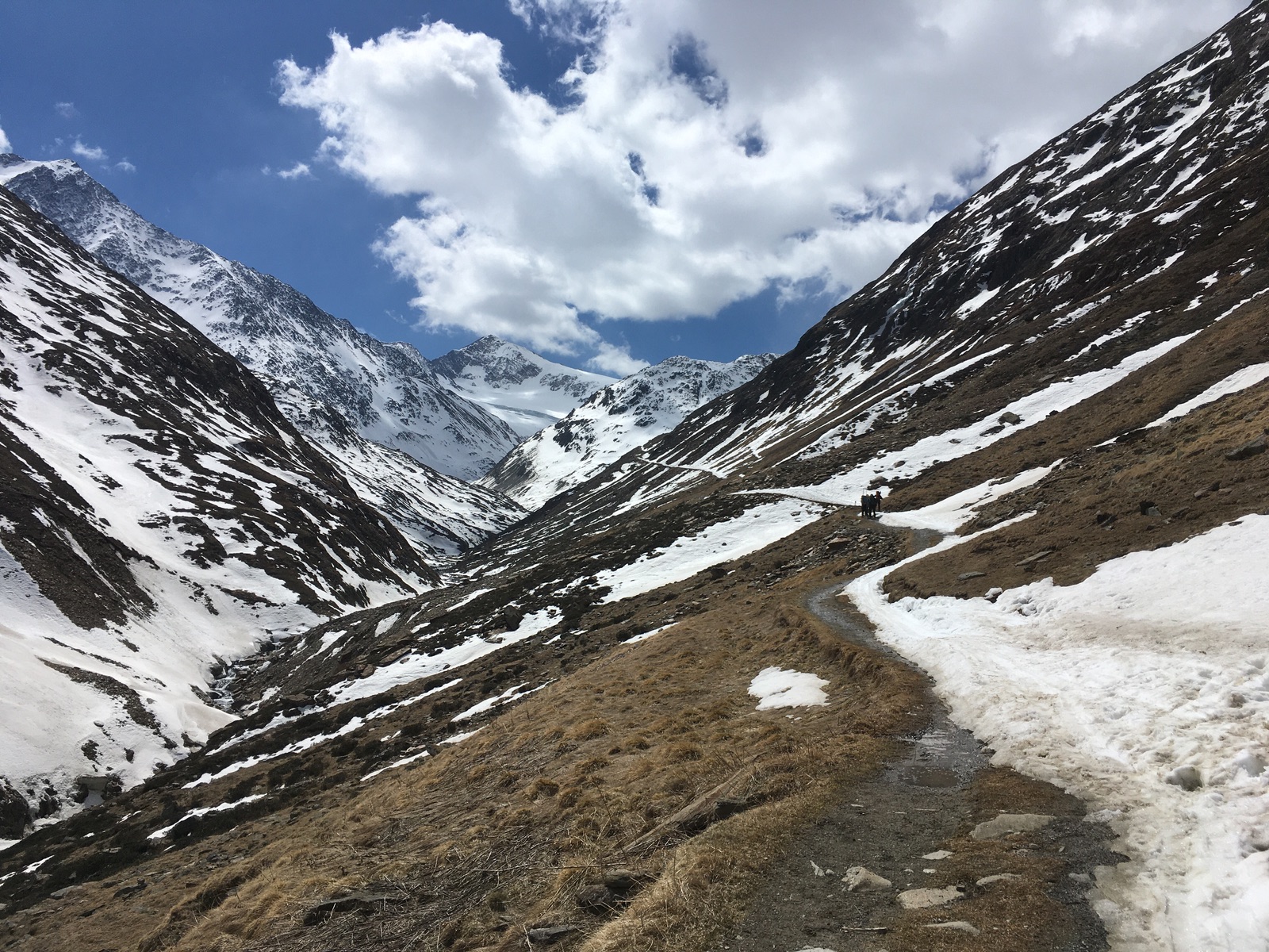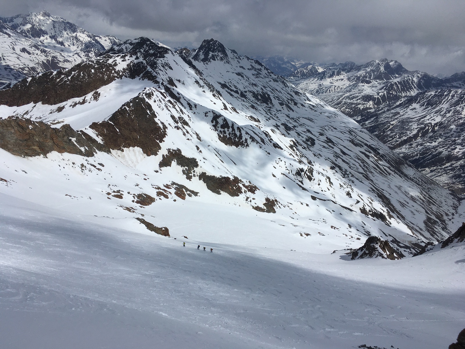 In Vent hat es wenig Schnee und im Niedertal besonders wenig - man konnte heute morgen aber noch recht gut mit den Skiern aufsteigen, ca. 10x gab es aber apere Stellen, darunter 3x auch etwas länger zu tragen. Zu empfindsam mit Skiern und Fellen darf man halt nicht sein. Ich empfehle dennoch, soweit möglich mit Skiern zu gehen - es gab auch einige, die diese mehrheitlich getragen haben, was aber mühsam ist (ggf. auch einbrechen) und auch deutlich länger dauert. Am Nachmittag dann schon mehr apere Stellen, die Ausaperung geht dieses Jahr angesichts der dünnen Schneelage sicher rasch. Die geringe Schneelage merkt man auch daran, dass die sonst üblichen Querungen von Lawinenkegeln dieses Jahr praktisch nicht zu bewerkstelligen sind. Harscheisen hat man heute nicht gebraucht, sollte sie aber unbedingt mitnehmen.