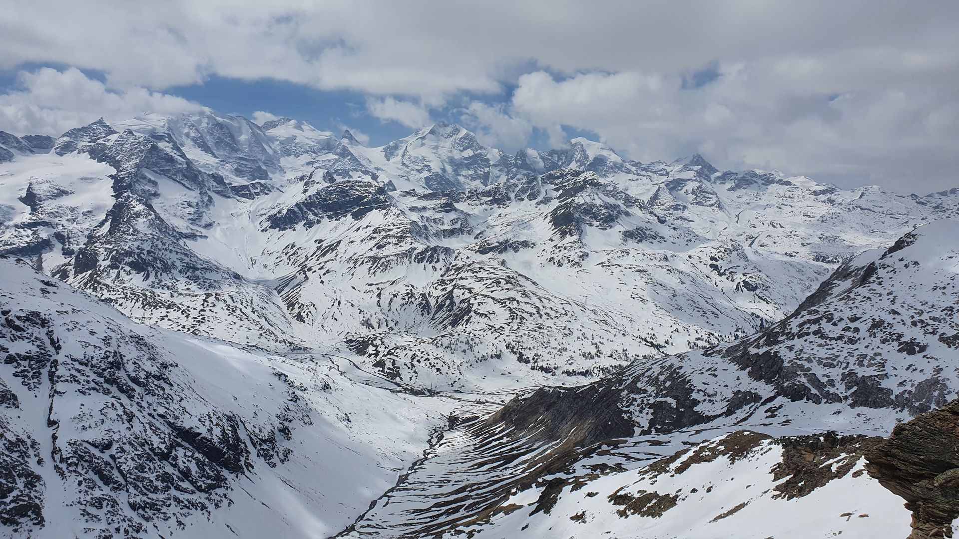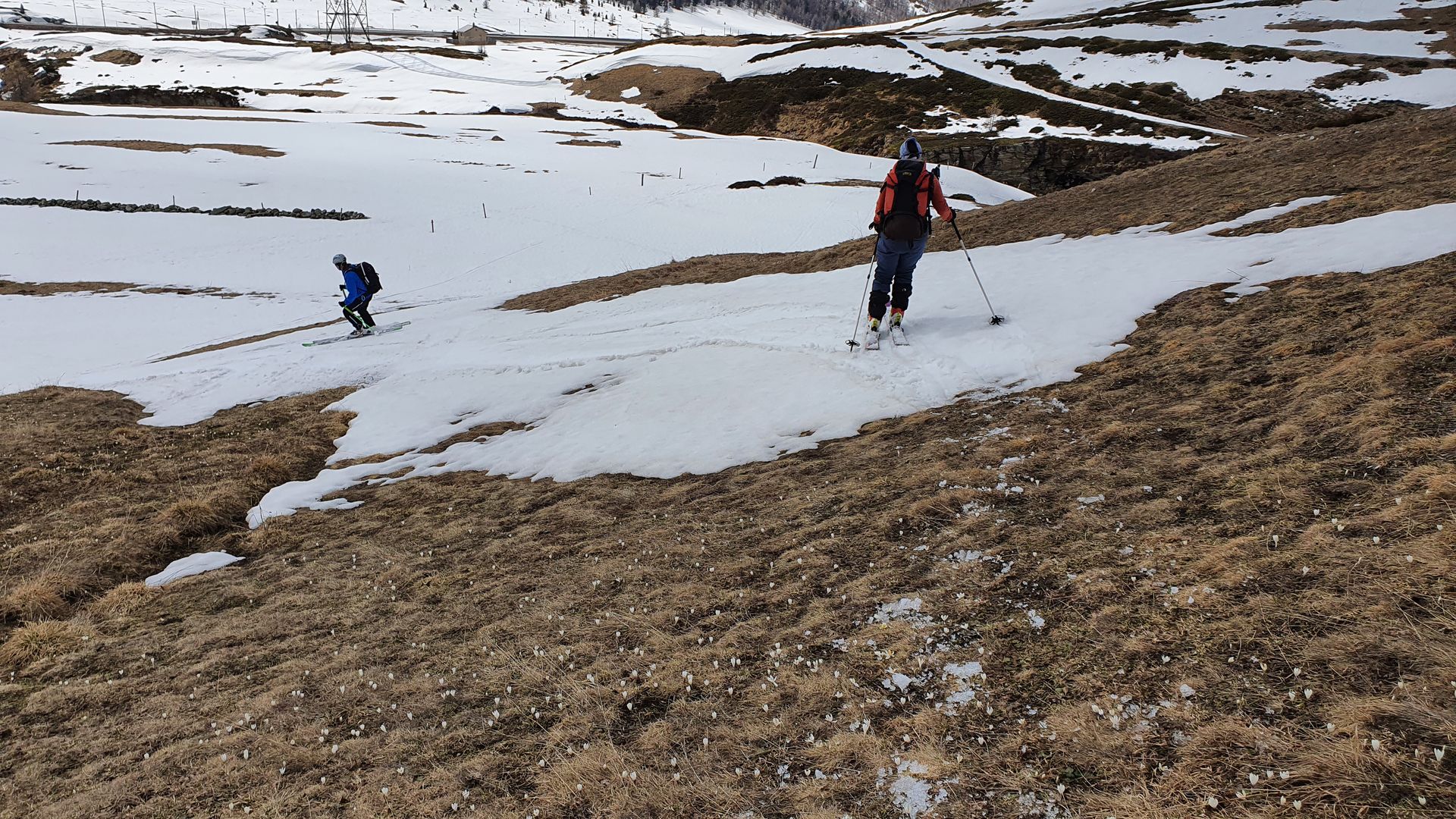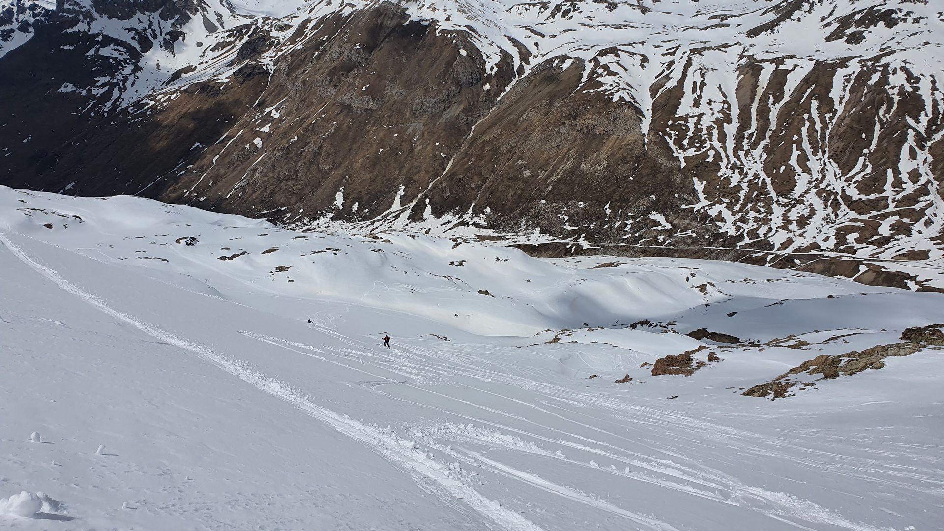 Wenn man an der Paßstrasse parkt, denkt man nicht, dass man auf Schnee weit kommt. Doch durch das Val da Fain zieht sich auf der Alpstrasse noch ein Schneeband taleinwärts. Dieses wird aber immer mehr unterbrochen. Alternativ geht es auf der Nordseite unterhalb des Piz Alvs noch gut gut. Die südseitigen Hänge sind alle aper. Ab der Überquerung des Bachs in Richtung Süden zum Gipfel wird es dann mehr Schnee. In diesem Teil dann bei der Abfahrt super Verhältnisse. Die Fahrt aus dem Tal heraus war dann eher unspasig. Dank der nicht ausreichenden Abstrahlung war die Schneedecke nicht ausreichend verfestigt und man sackte oft ohne Vorwarnung ab, was zu badewannengroßen Löchern führte. Man kommt aber momentan noch gut bis zur Passstrasse zurück.