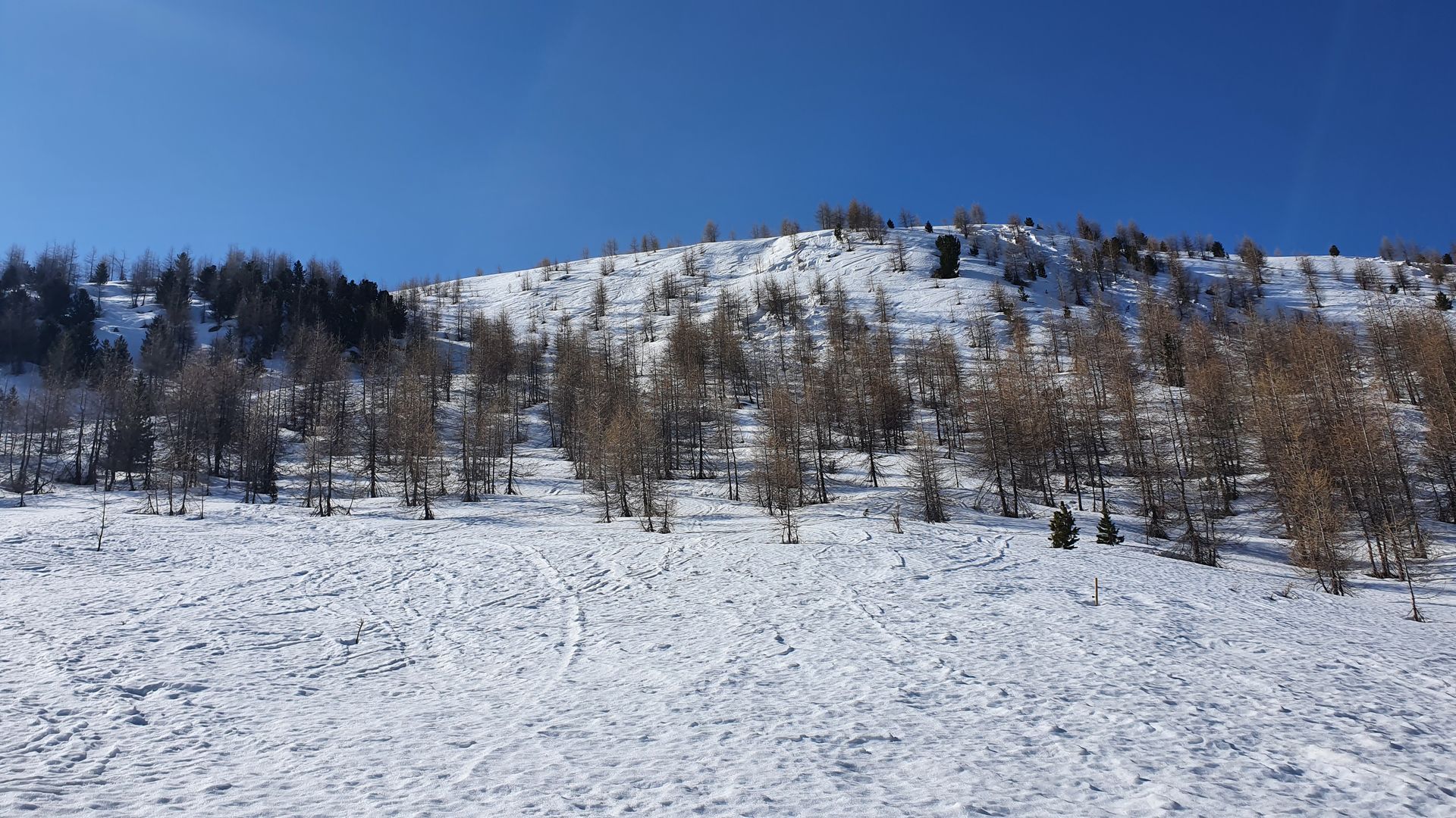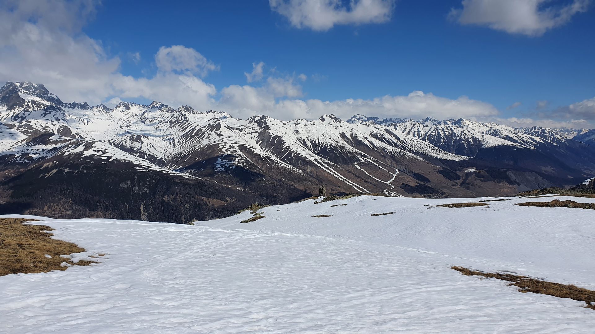 Da der Gipfel von unten sehr weiß aussah und wir von unserer Ferienwohnung in Madulain nicht weit fahren wollten, ging es auf den Munt Müsella. Vom Parkplatz im Ort ging es ein paar Meter zu Fuß zur Piste im Ort. Hier konnten wir anschnallen und bis zur Bergstation gehen. Ab der Bergstation führt die Route über eine Forststrasse durch das Wildschongebiet. Leider wurde diese für Holzarbeiten geräumt und war komplett schneefrei. Nach ca. zehn Minuten tragen, ging es mal auf Eis und Schnee der Jahreszeit entsprechend ganz gut. Es hatte immer wieder kurze Tragepassagen. Den Aufstieg zur Alp Müsella über den Sommerweg mussten wir die Ski aber ca. 150 Höhenmeter tragen. Ab dann wieder ausreichend Schnee. Ab der Alp durchgehende Schneedecke. Auch heute hat es nicht ganz durchgefroren, so dass man an manchen Stellen wieder massiv eingebrochen ist.