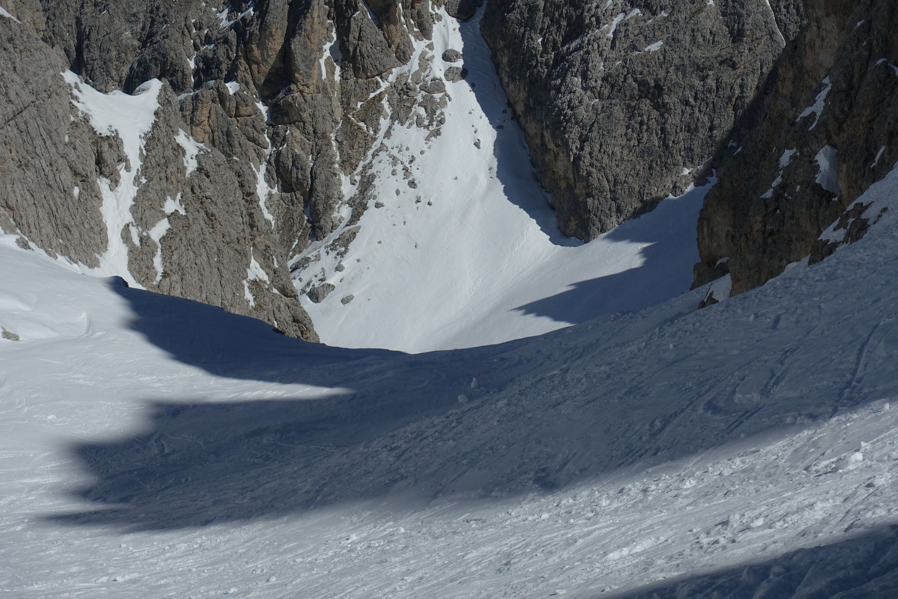 Vom PP die ehemalige Piste "Diavolo" ins Cadin della Neve. Im Kar zuerst Richtung Forcella d. Neve um kurz unterhalb nach rechts einzuschwenken, um einen zuerst breiten steilen Hang anzusteigen. Dieser wird im oberen Bereich schmäler und steiler.