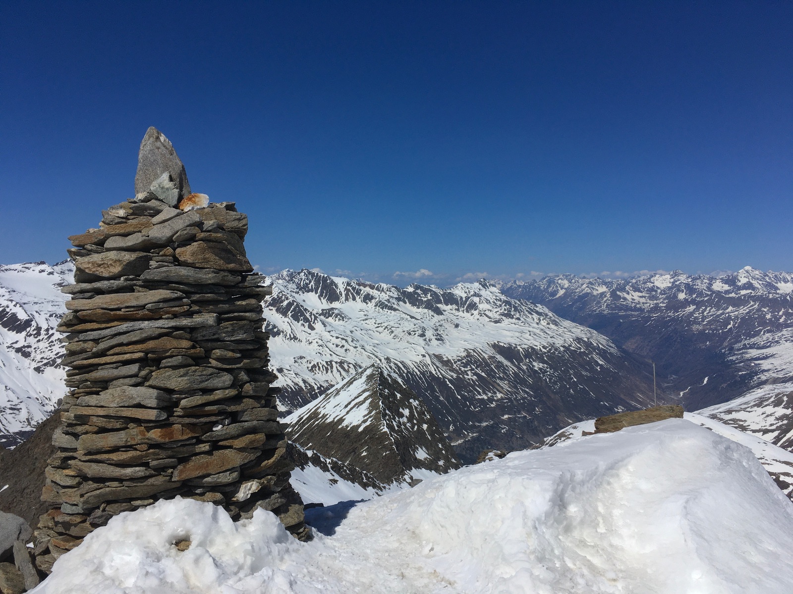 Der Gipfelsteinmann vor dem Tal von Obergurgl: