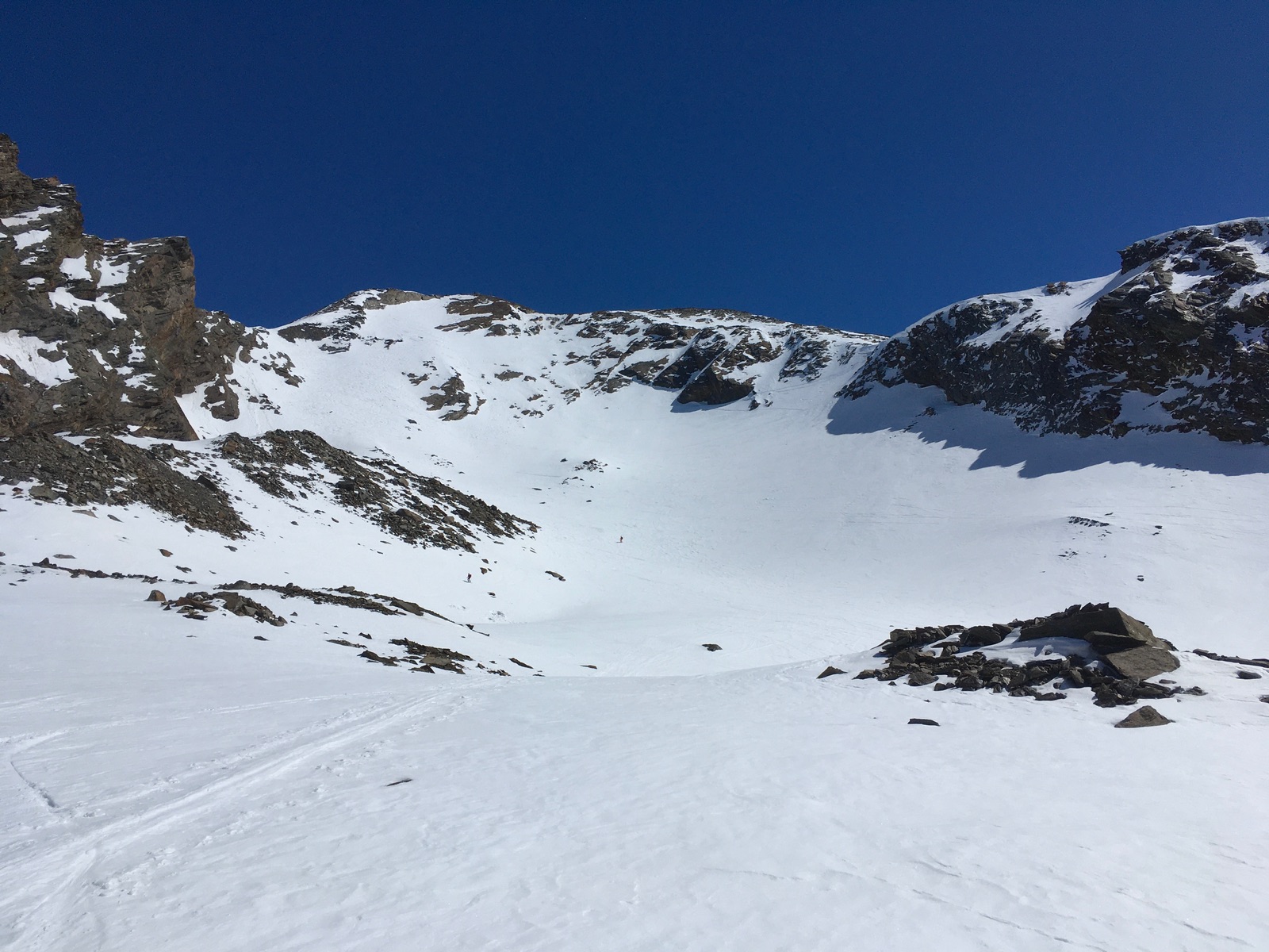 Am Morgen waren für die Steilstufe aus dem Rotmoostal Harscheisen aus meiner Sicht zwingend. Die kurze Stufe hoch in die Scharte sah von der Ferne recht anspruchsvoll aus, ging dann aber recht gut (natürlich mit Steigeisen). Heute sind offenbar alle in Aufstieg links gegangen über den Schnee, weil rechts oberhalb der Drahtseile noch eine Art Wächte ist - Spuren gab es aber. Von der Scharte ging die Spur dann weiter über die W-Flanke, nicht den Grat. Wiederum mit Steigeisen gut machbar. Ich bin direkt vom Gipfel ungefähr im Bereich des Sommerwegs abgefahren und dann kurzzeitig sehr steil in das Kar westlich unter dem Gipfel. Zwei Tourengeher berichteten, dass die südseitige Abfahrt von der Scharte in das besagte Kar (also der Normalweg) selbst am Nachmittag noch eher hart war. In der weiteren Abfahrt habe ich dann sonnseitige Expositionen gesucht und meistens guten Firn gehabt. Alles andere ist meistens eher bruchharschig oder windgepresst.
