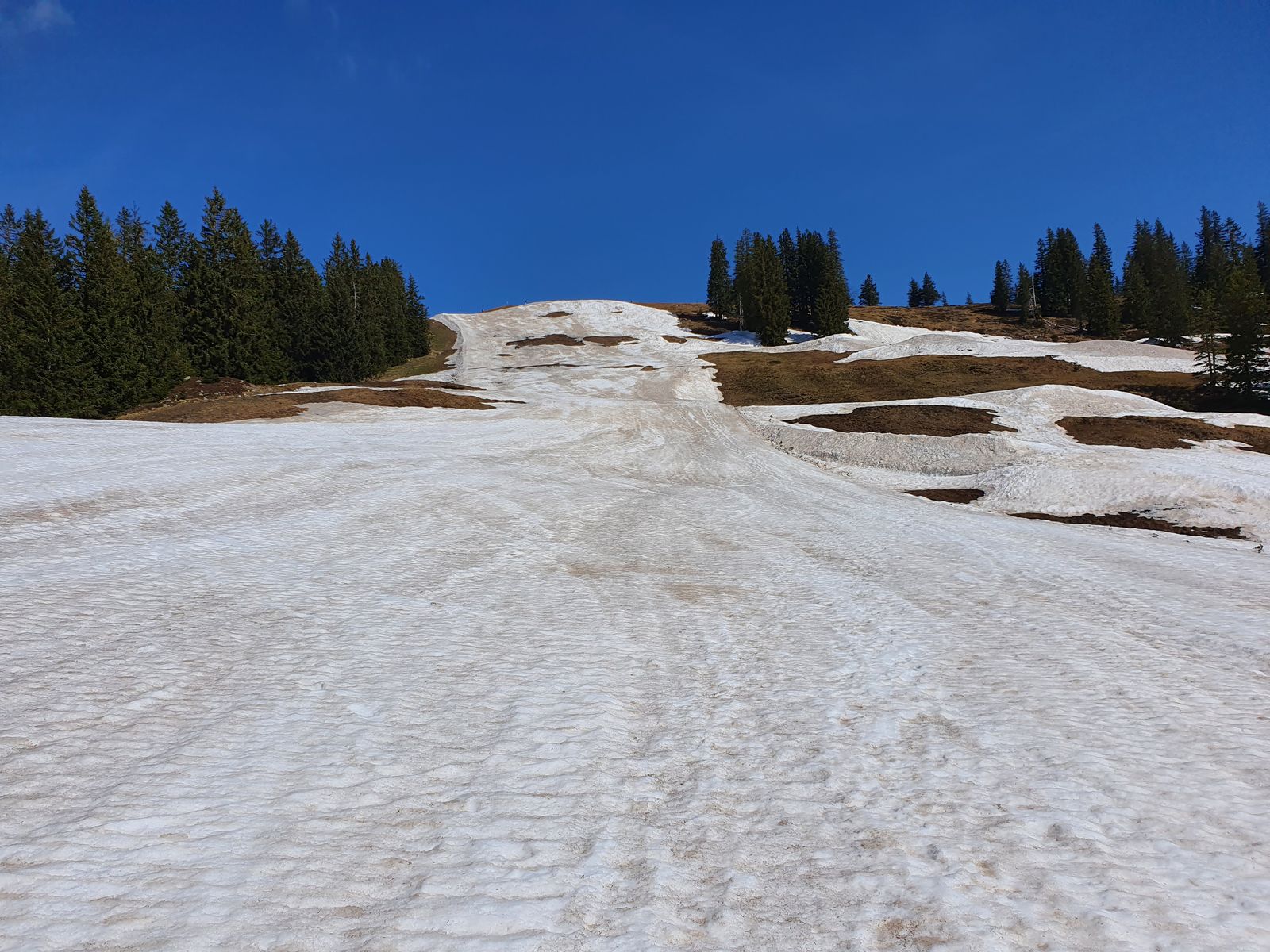 Die Variante, auf dem rechten Bergrücken hochzulaufen, hatte ich verworfen, weil es unten komplett grün war. Später habe ich gesehen, dass das nicht so wild war: man hätte geschätzte 5 Min. tragen müssen, mehr nicht. Bei der von mir genommenen Variante über den linken Bergrücken war direkt auf dem Grat ab Bergstation Schlepplift auch grün. Da habe ich z.T. berghoch getragen, weil ich keinen Bock hatte auf Schräghang-Gerutsche. Die Perspektive (Siehe Fotos) war hier wenig motivierend da sehr grün. Das hat sich aber als Trugschluß herausgestellt. Ich konnte bis zum Gipfel komplett hochlaufen und auch abfahren. Nur auf ca. 5m habe ich im Gras getreppelt. Insgesamt eine schöne Frühjahrsrunde mit knapp 1000 hm.