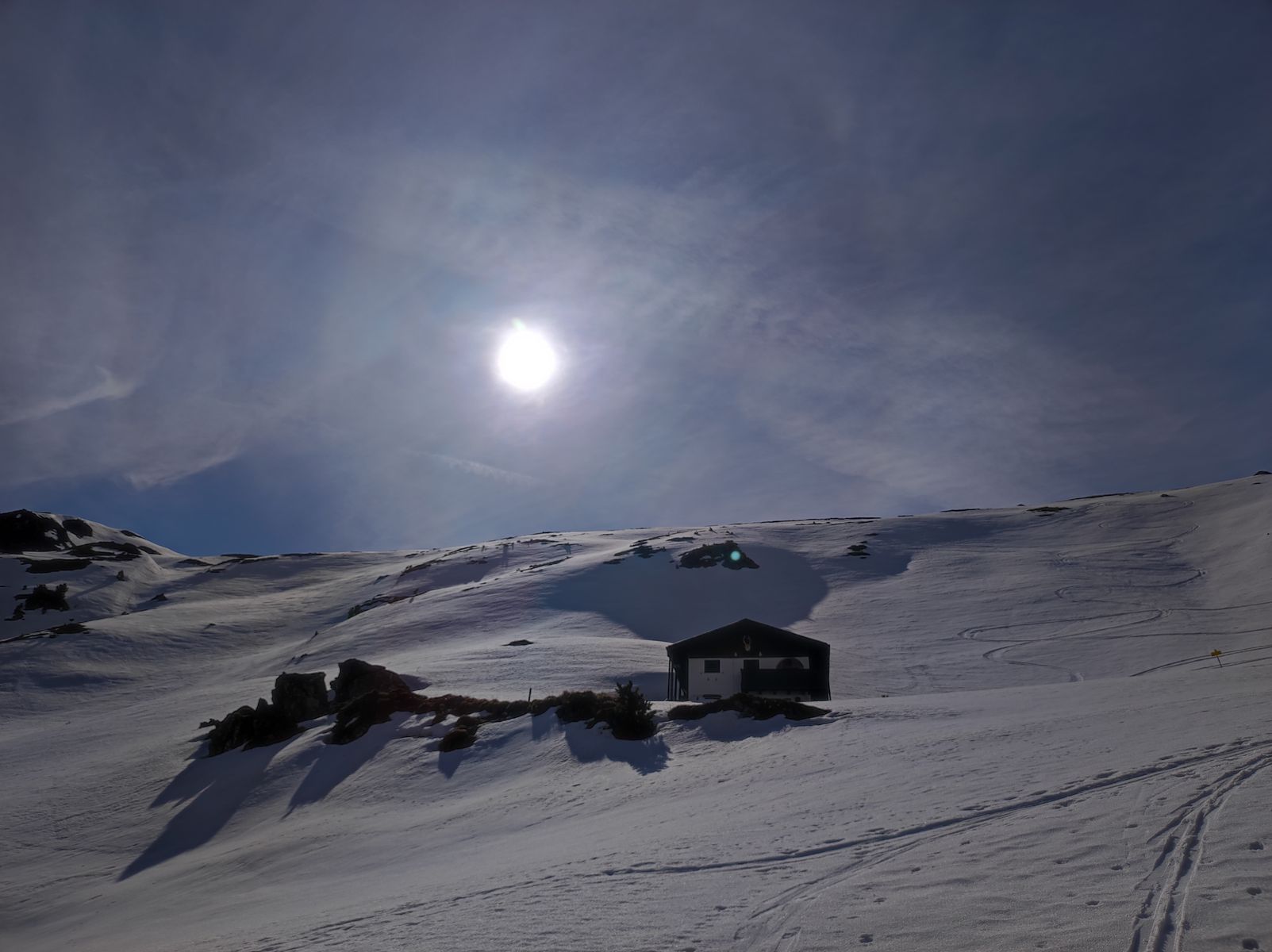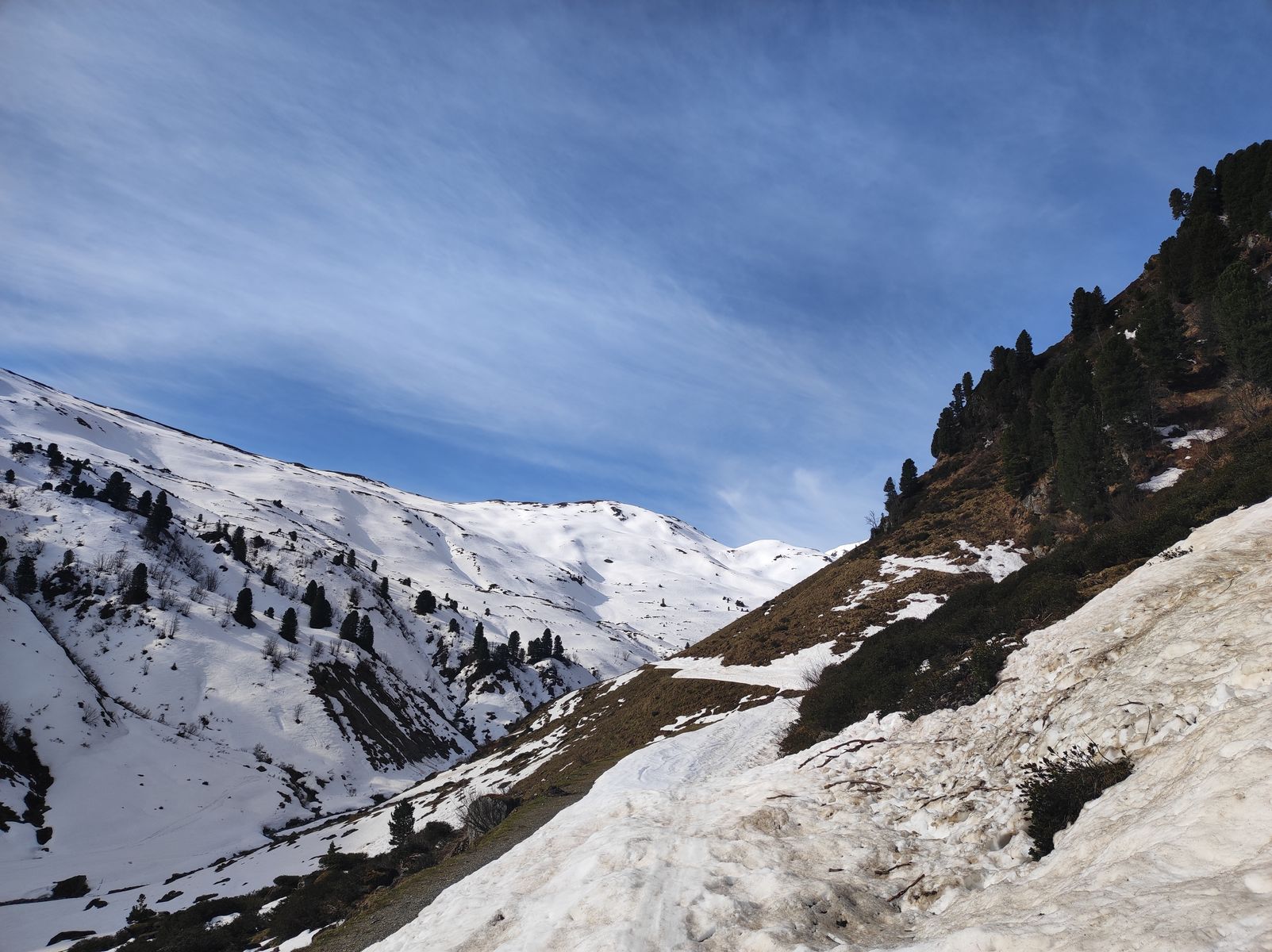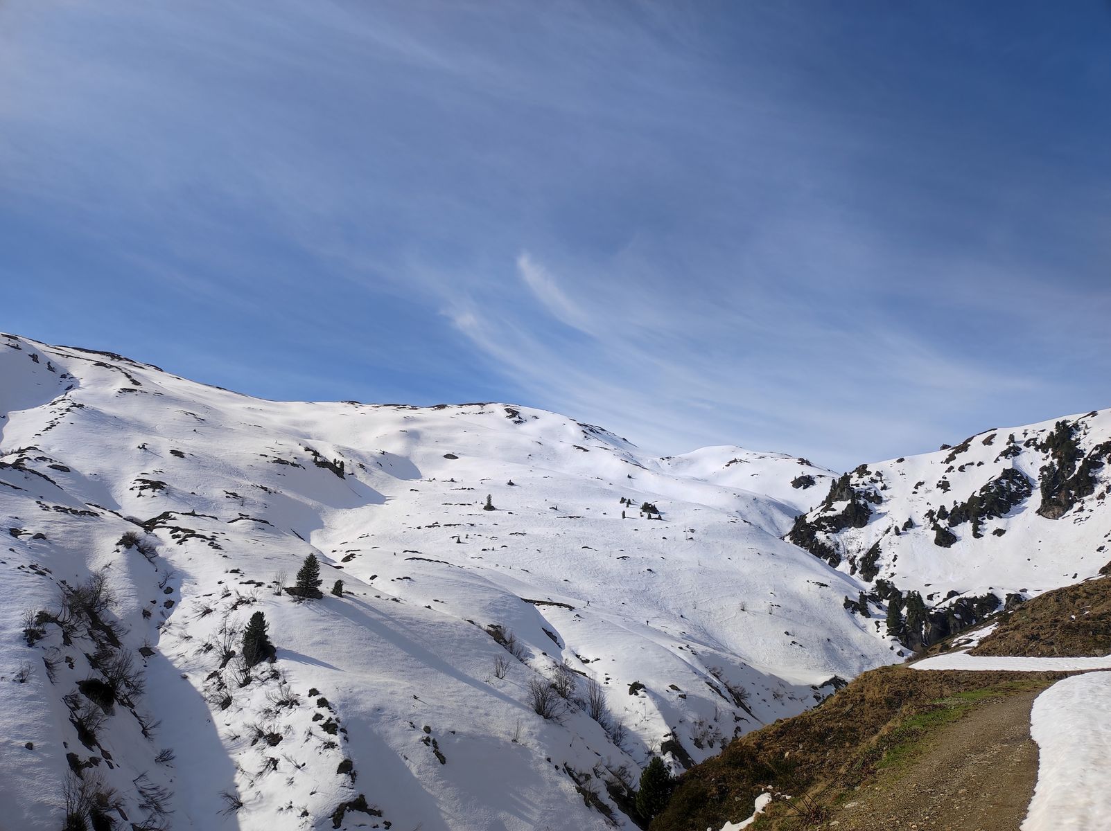 In Hochfügen hat es weiterhin gute Tourenverhältnisse: Fast durchgehend Schnee (5 Minuten Tragen beim Pfundsalm-Niederleger). Dank der klaren Nacht über dem mittleren Inntal war die Schneedecke morgens fest gefroren ohne dabei eisig zu sein. Harscheisen waren nicht nötig.