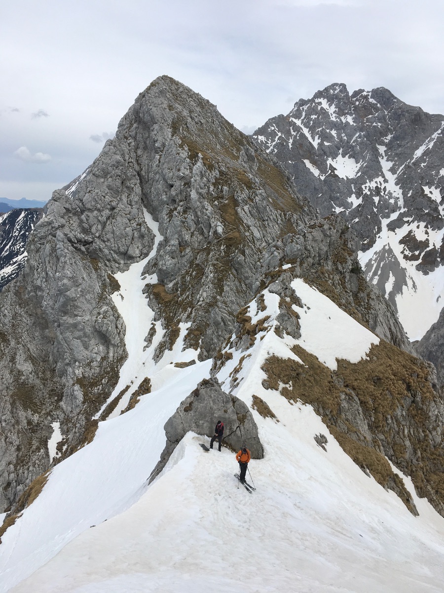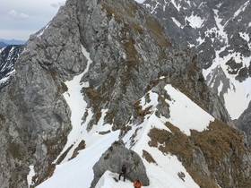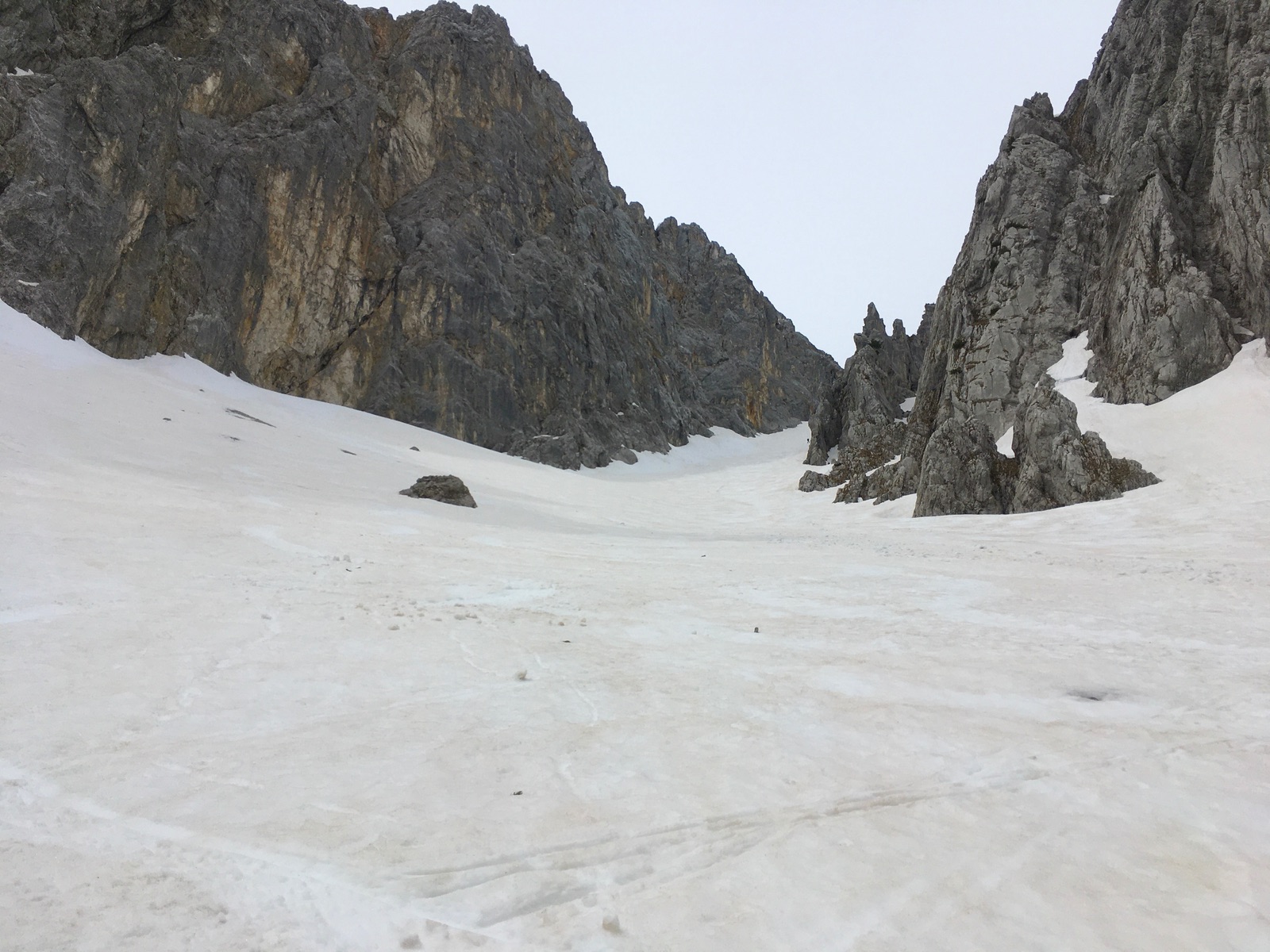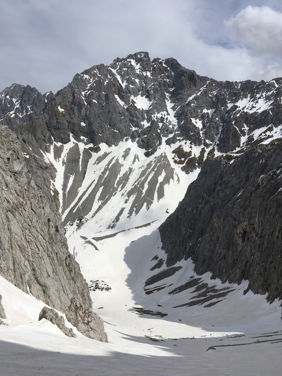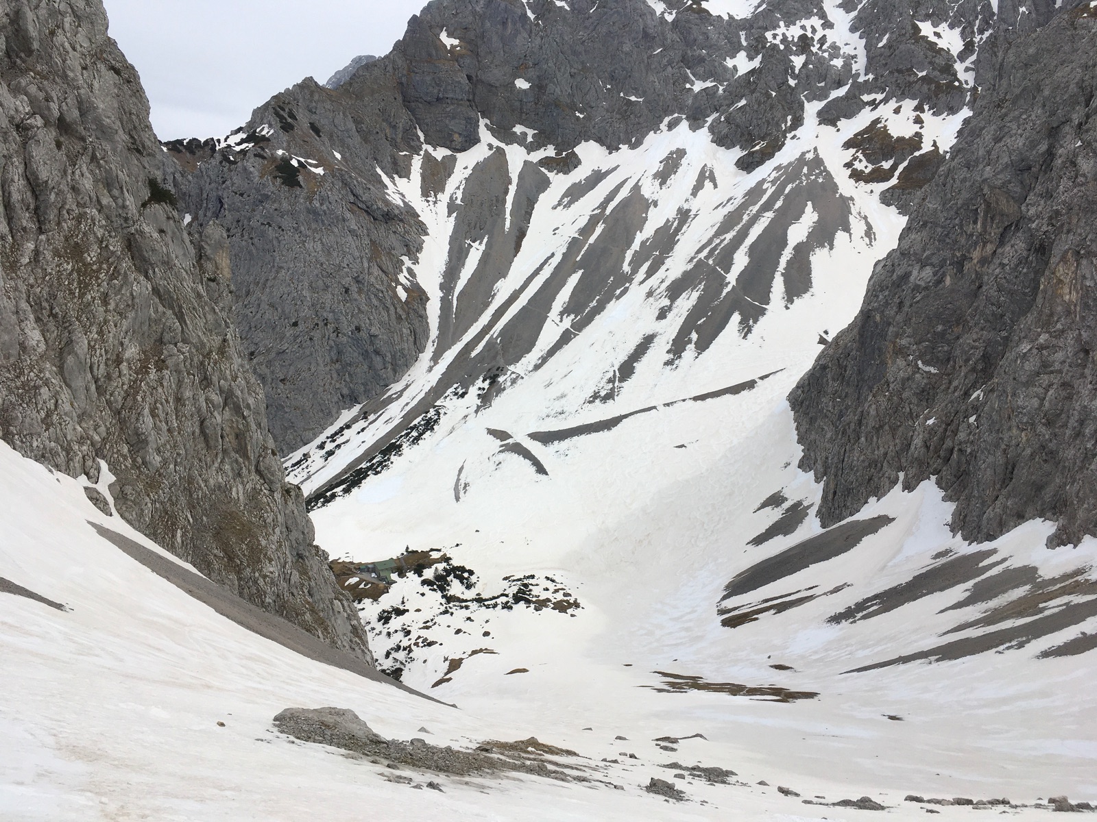 Aufstieg mit den Kurzski ab dem Bankerl (ca. 1.330 m). Im Kanonenrohr durchgehend Schnee, an einigen Stellen kommen aber schon Steine heraus und es wird dünn. Oben entschied ich mich heute für das Vordere Dammkar. Verhältnisse für Aufstieg und Abfahrt auch noch gegen Mittag recht gut, Idealfirn war angesichts der hohen Temperaturen und der wohl bedeckten Nacht ohnehin nicht zu erwarten. Unten wird der Schnee schon Sommerschnee-artig. Es ist m.E. jedoch noch nicht sinnvoll, zu Fuß aufzusteigen - die Spuren zeugten doch von recht tiefem Einbrechen. Und liebe Wanderer: Wenn es doch zu Fuß hoch gehen soll, dann nehmt doch bitte den Steig und nicht die Skiabfahrt - eine "perforierte" Skiabfahrt fährt sich einfach nicht schön.